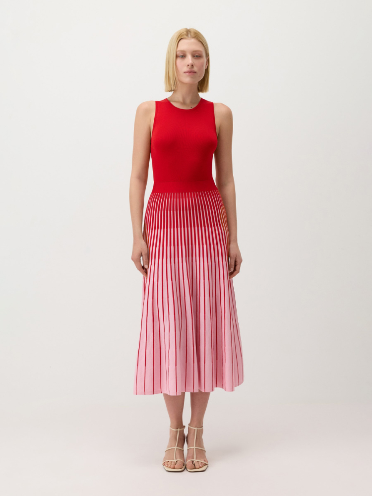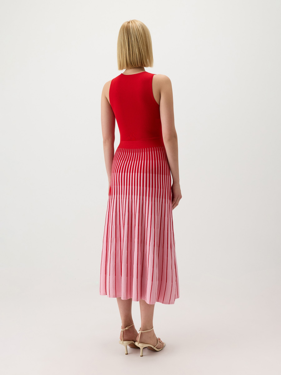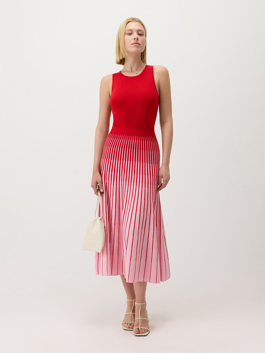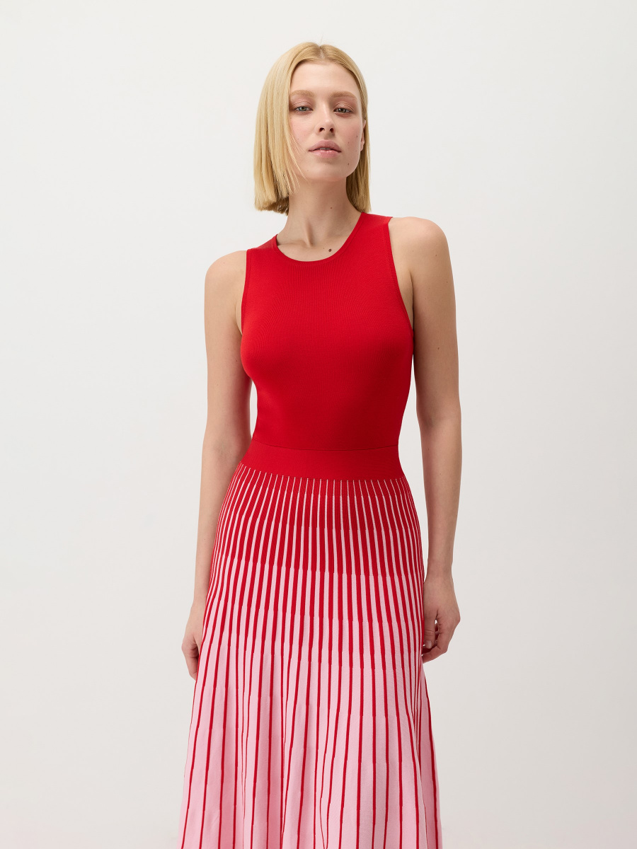 Платье длины миди с контрастной архитектурой: облегающий однотонный верх переходит в расклешенную юбку плиссе с цветовым градиентом. На талии — эластичный пояс для подчеркнутого силуэта, круглый вырез и проймы оформлены трикотажной бейкой. Гладкое полотно из “древесного шелка” лиоцелла — мягкое, воздушное и прочное — подходит для теплого сезона.