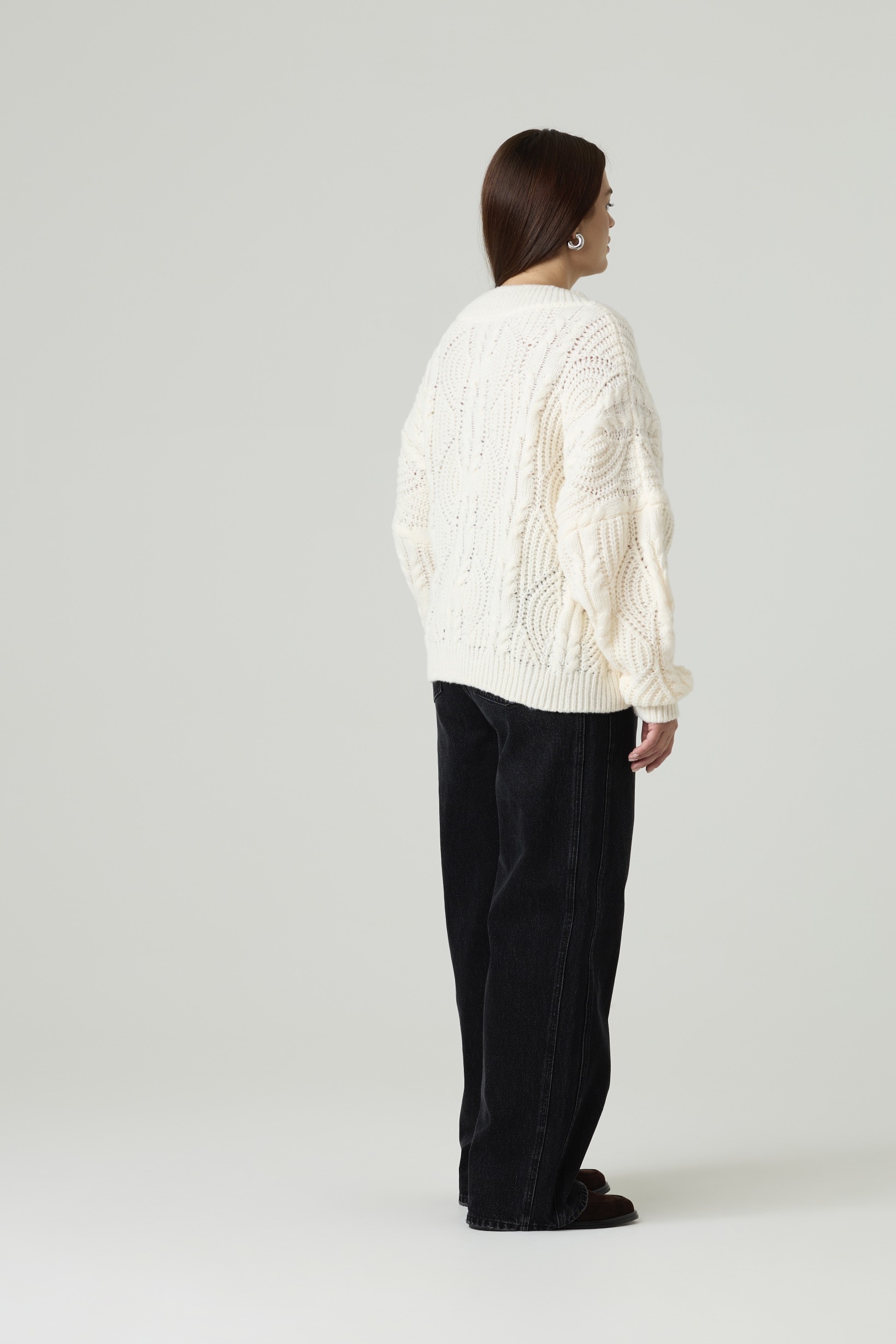 Женский джемпер кремового цвета, выполнен из мягкой пряжи с объемной фактурной вязкой, включающей узоры с эффектом кос. Модель свободного силуэта