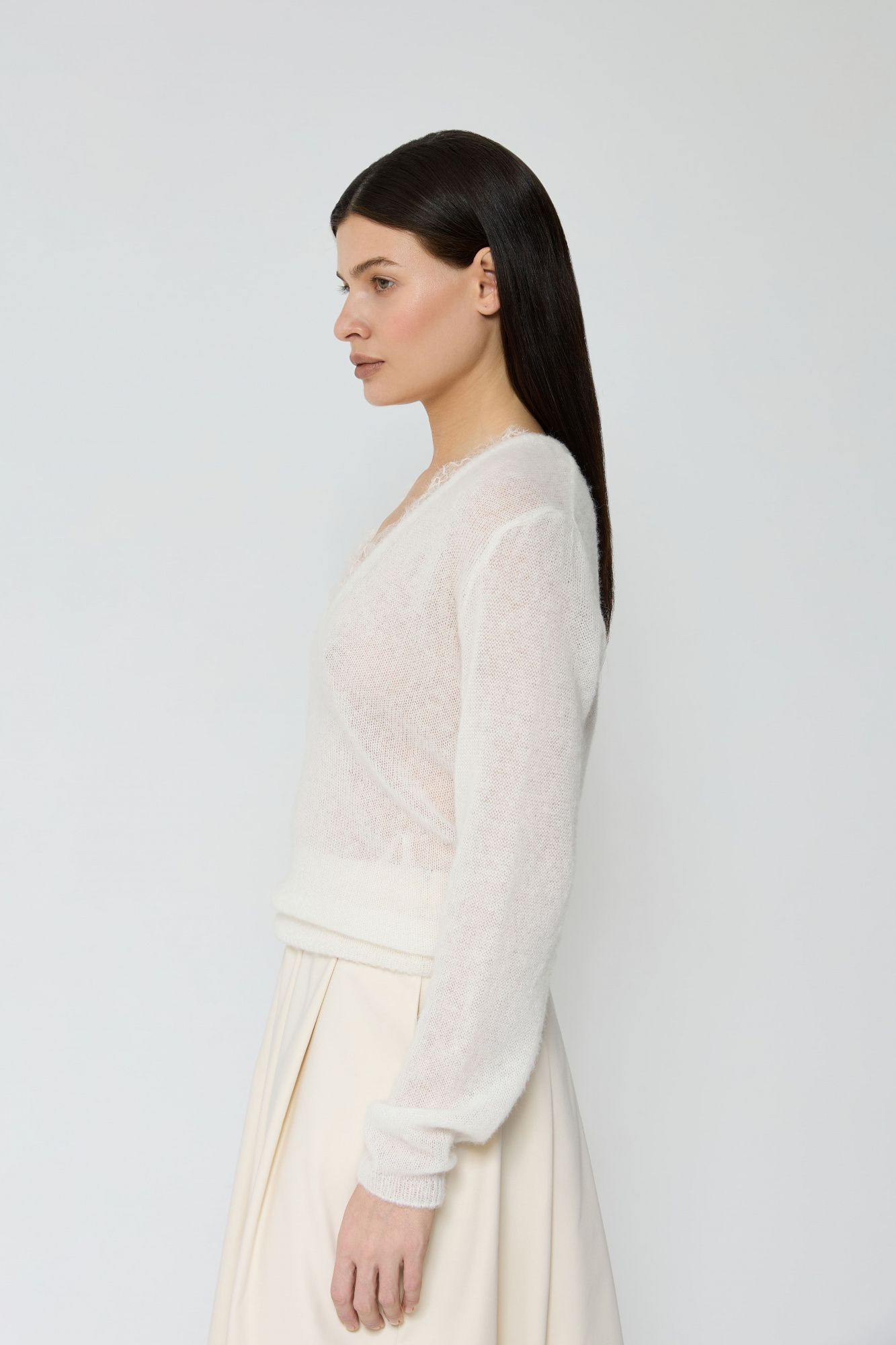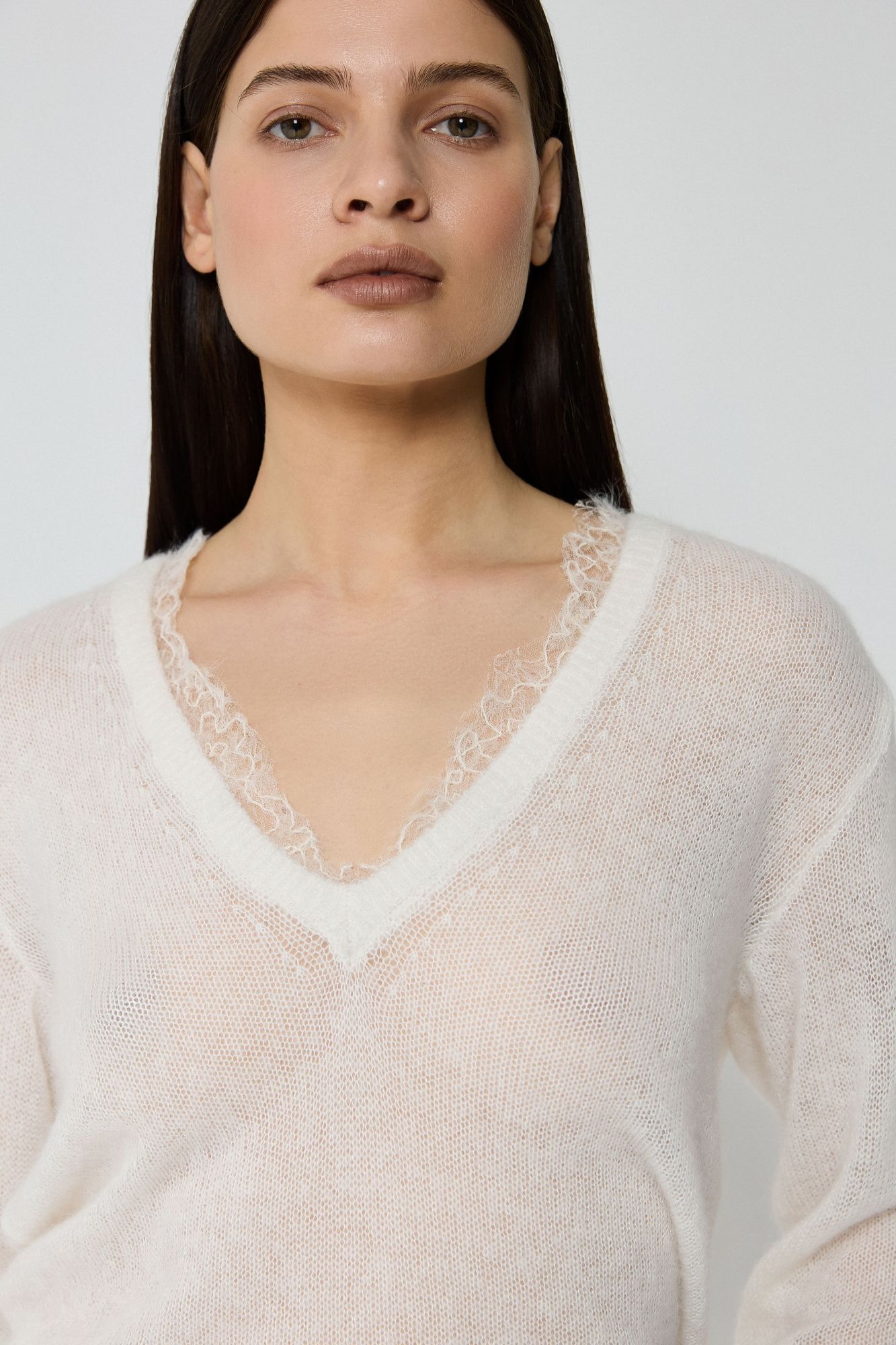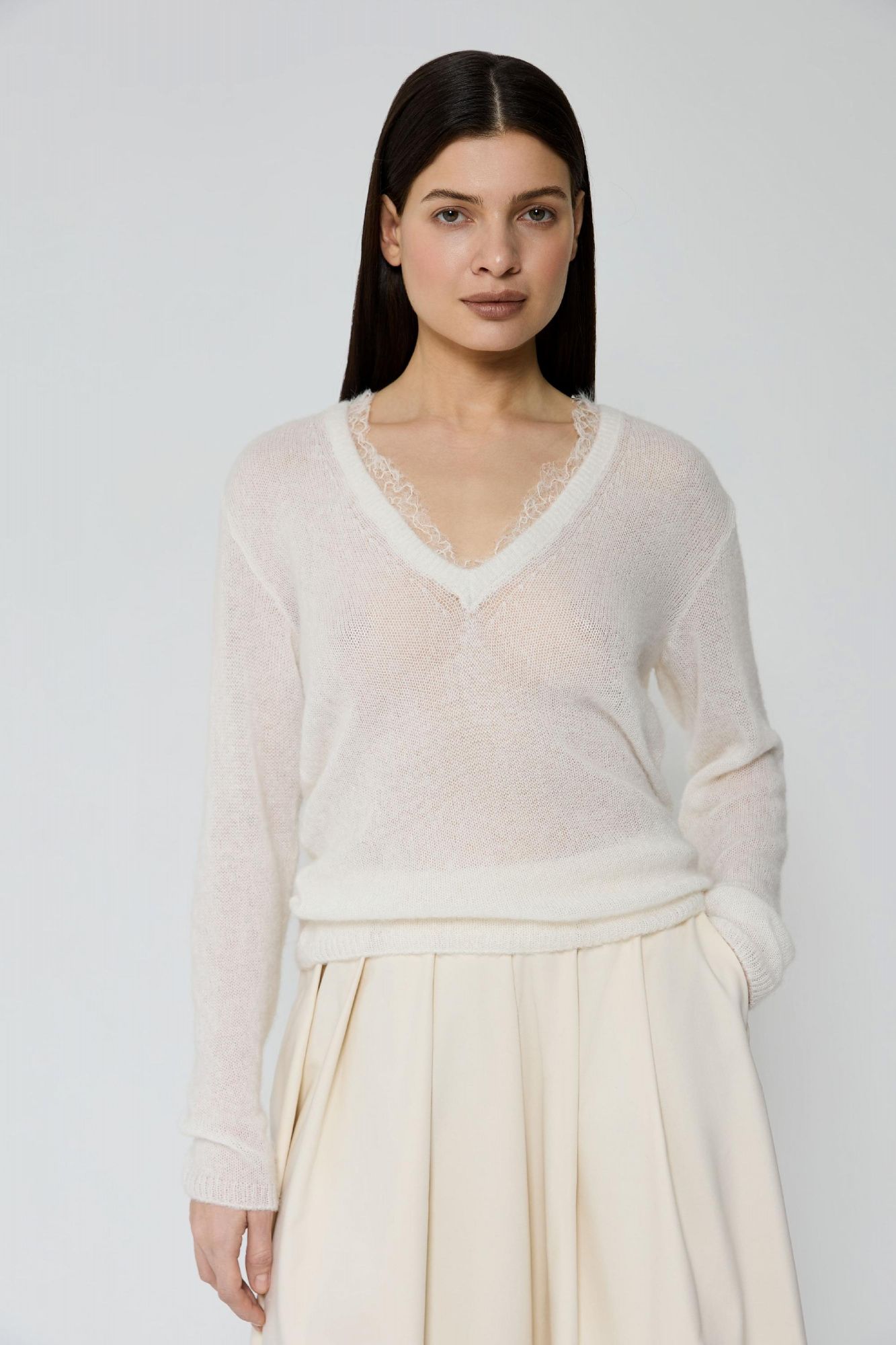Пуловер прямого кроя, умеренного объема и длины. V-образный вырез декорирован тонким кружевом, обрамляющим линию декольте.
