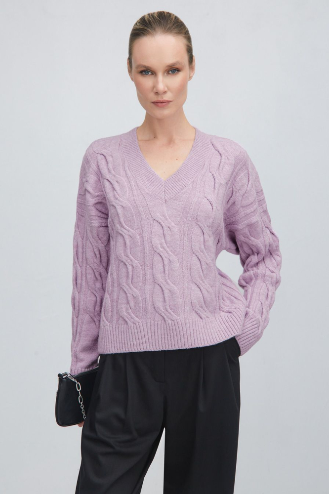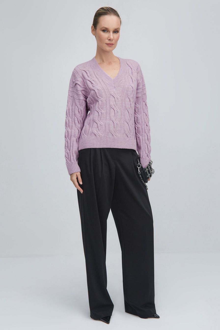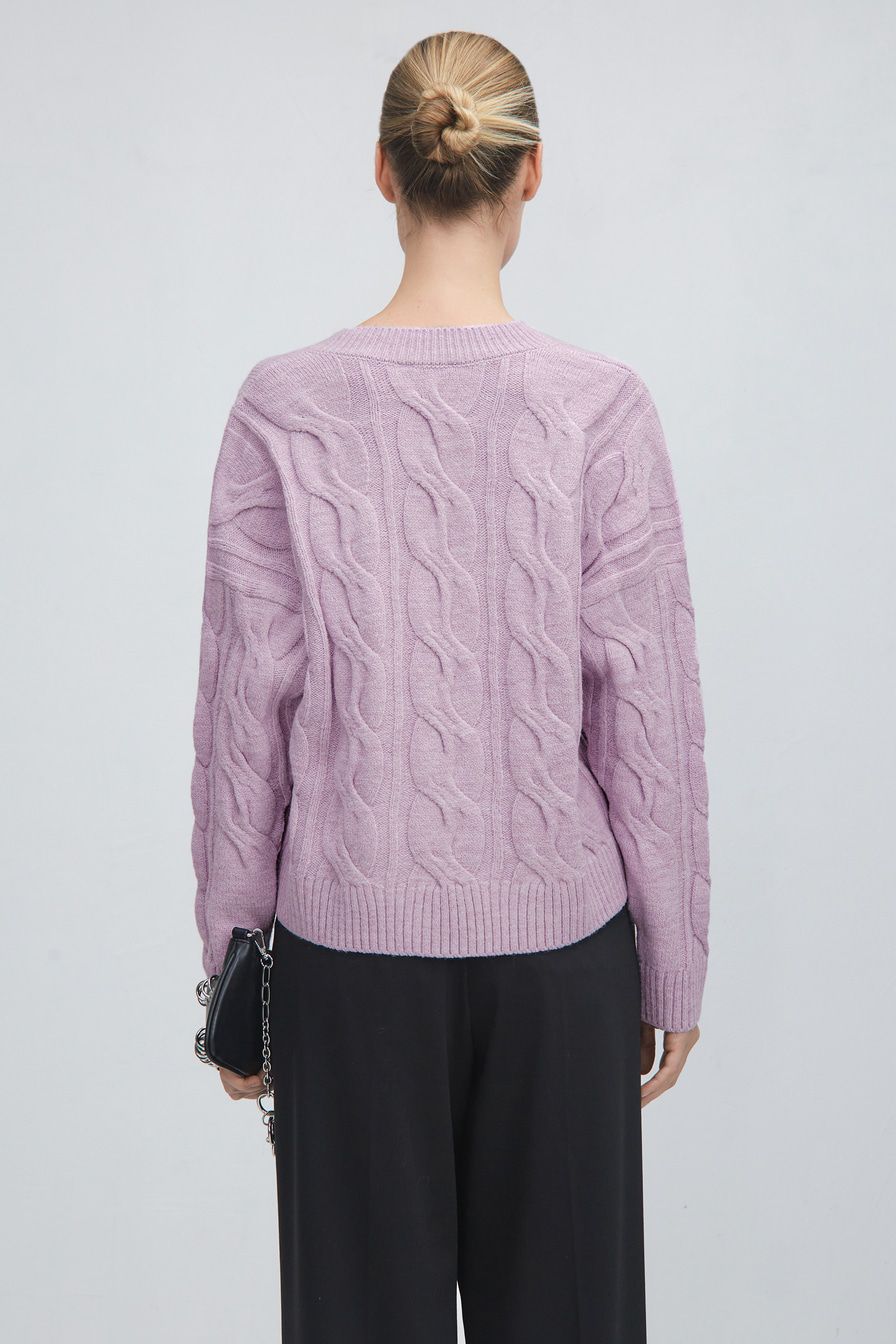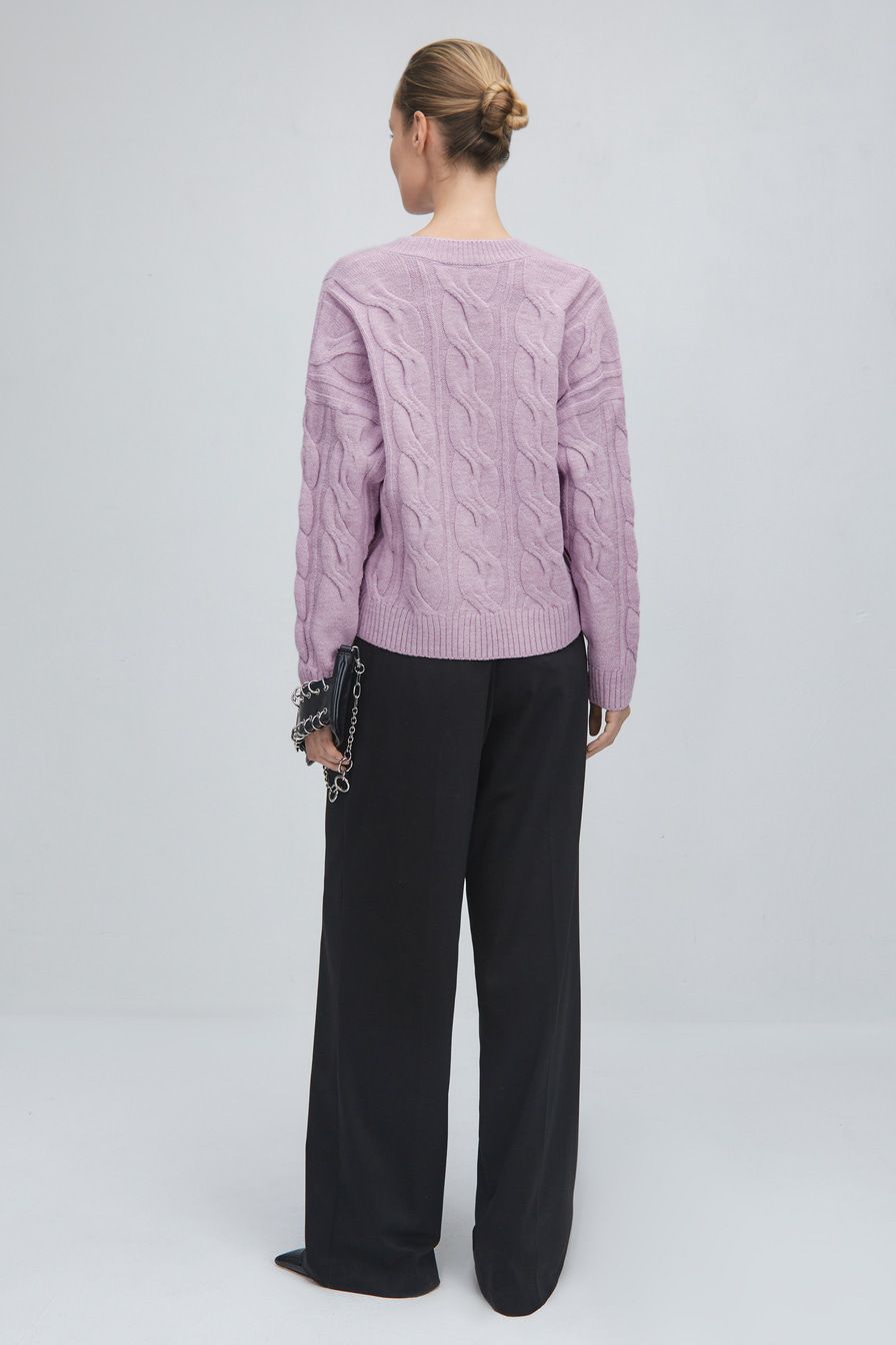 Пуловер с вязкой «косичка» – модель свободного кроя в светлом лавандово-розовом оттенке. Воротник, рукава и низ дополнены широкими вставками с фактурой в крупный рубчик.
