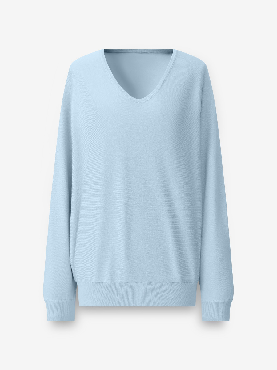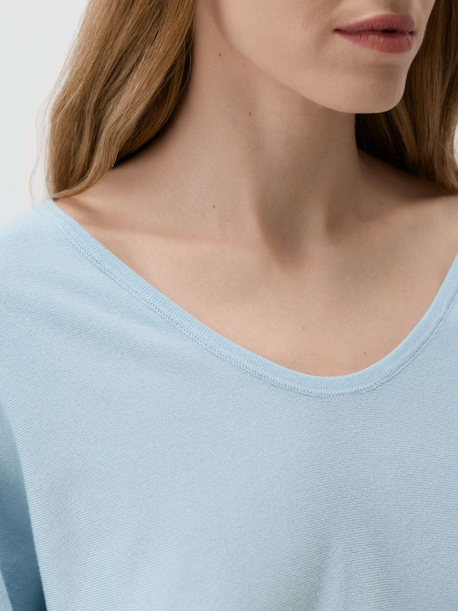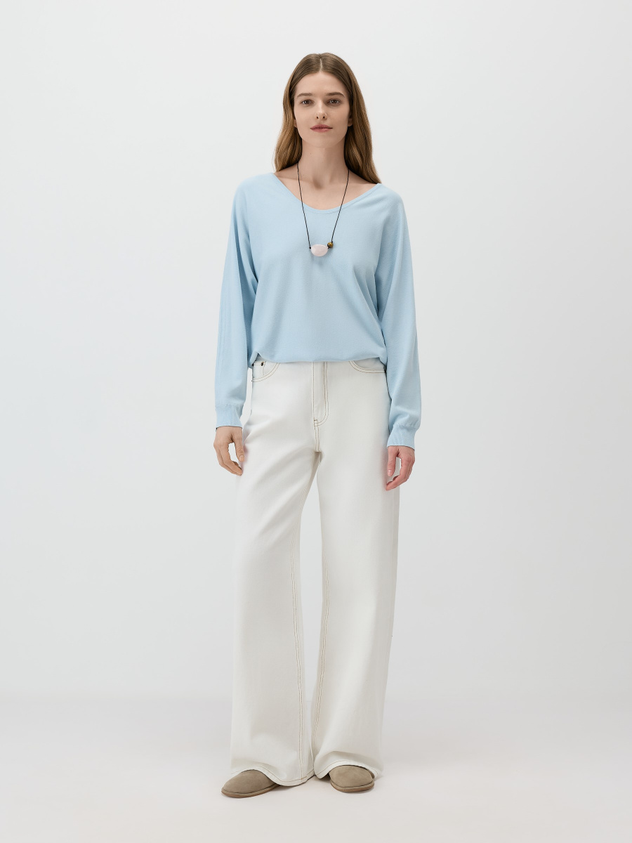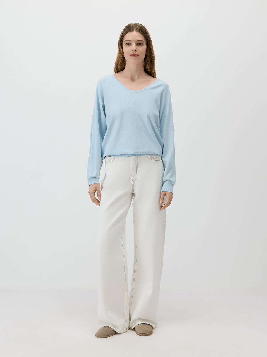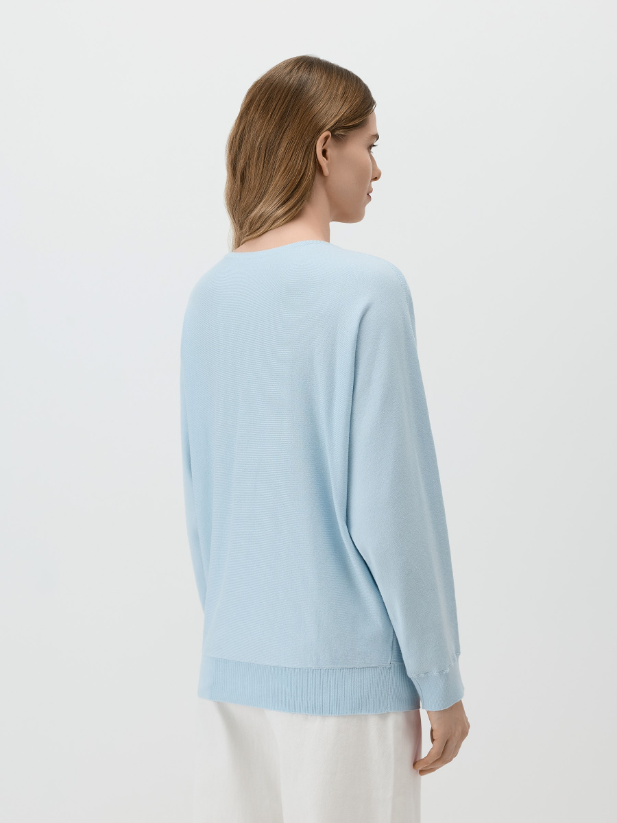 Воздушный пуловер в силуэте «летучая мышь», с расслабленной пластичной посадкой и мягкими драпировками. Мягкое гладкое полотно из 100% вискозы пропускает воздух и комфортно носится весь день. Дополнен глубоким плавным вырезом и фактурным рибом по рукавам и низу, аккуратно собирающим силуэт.