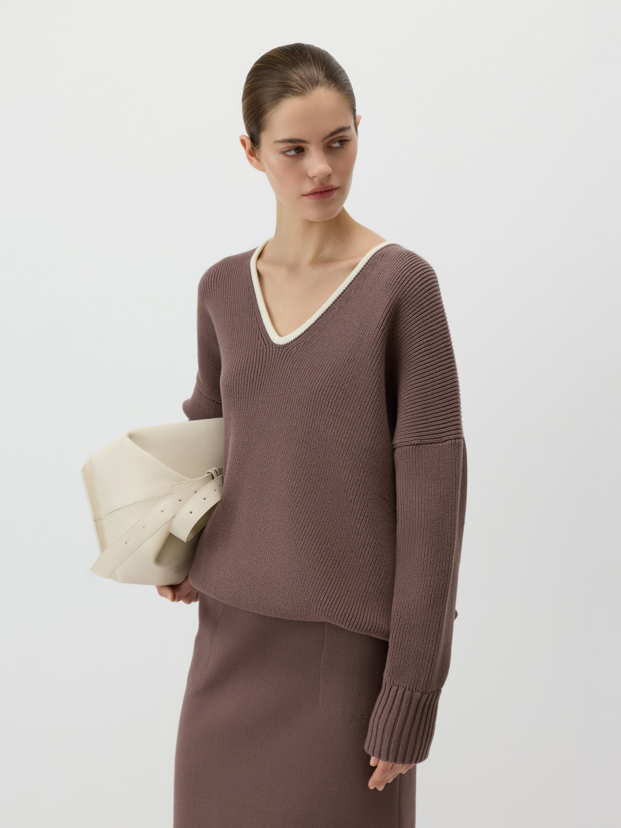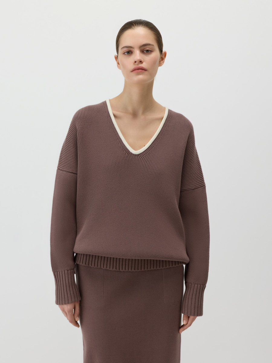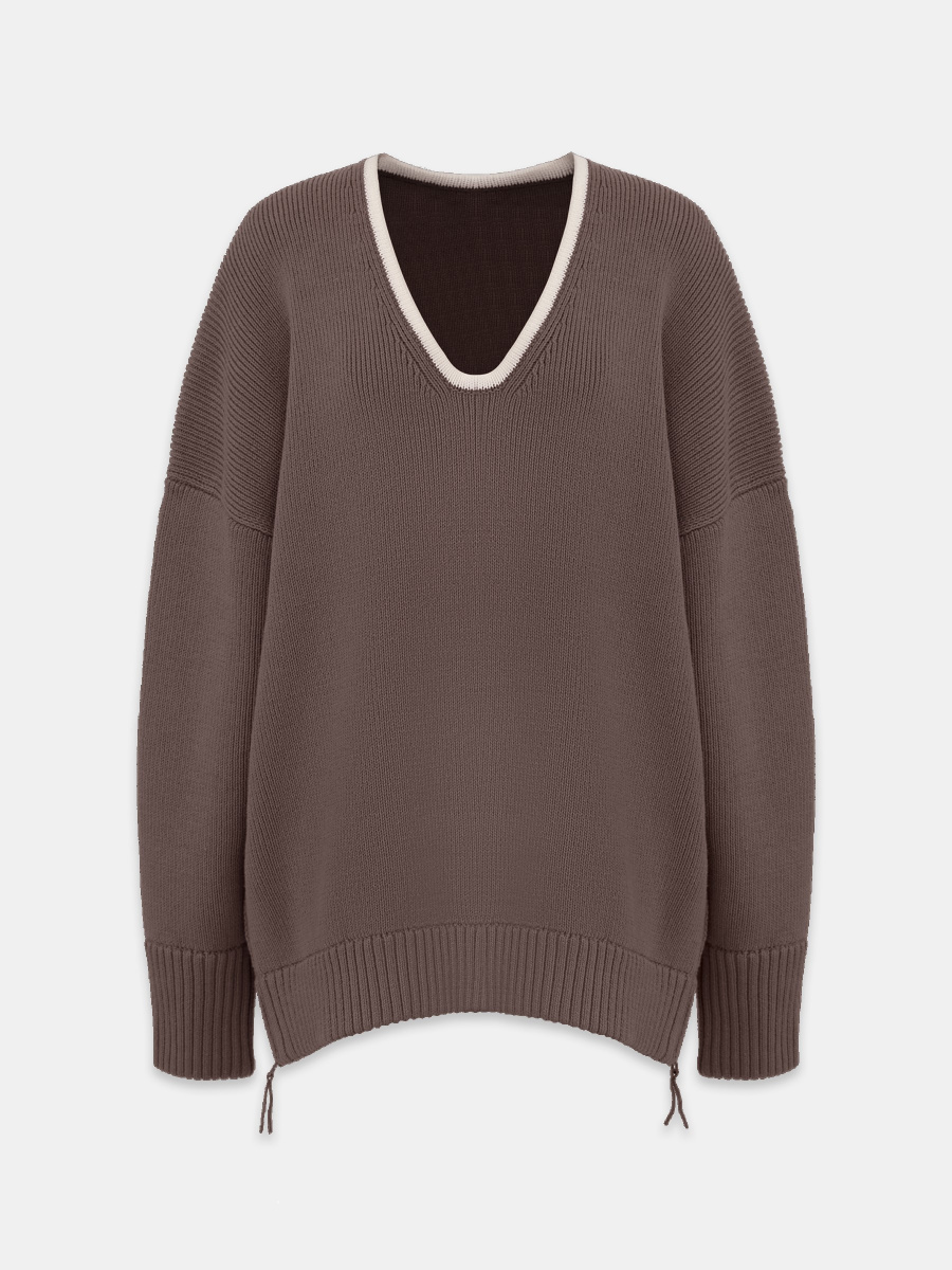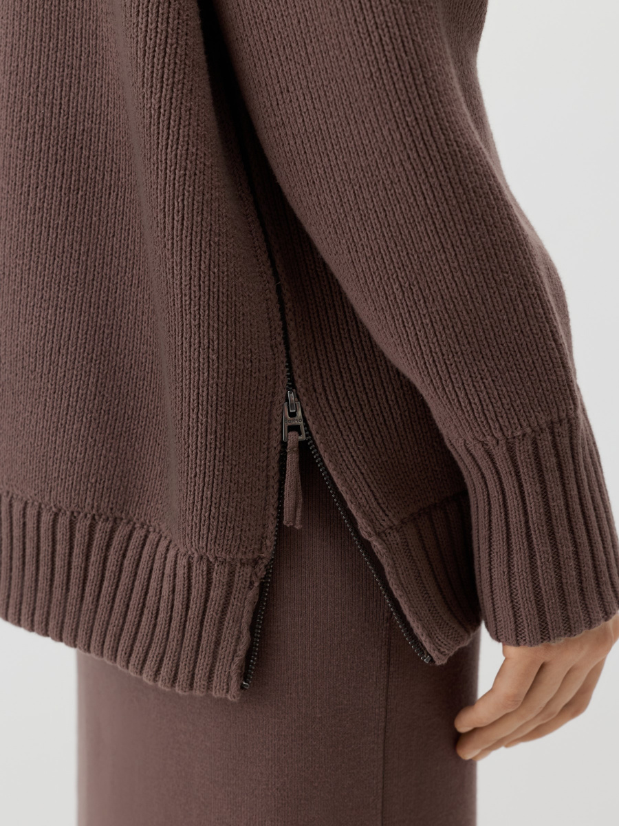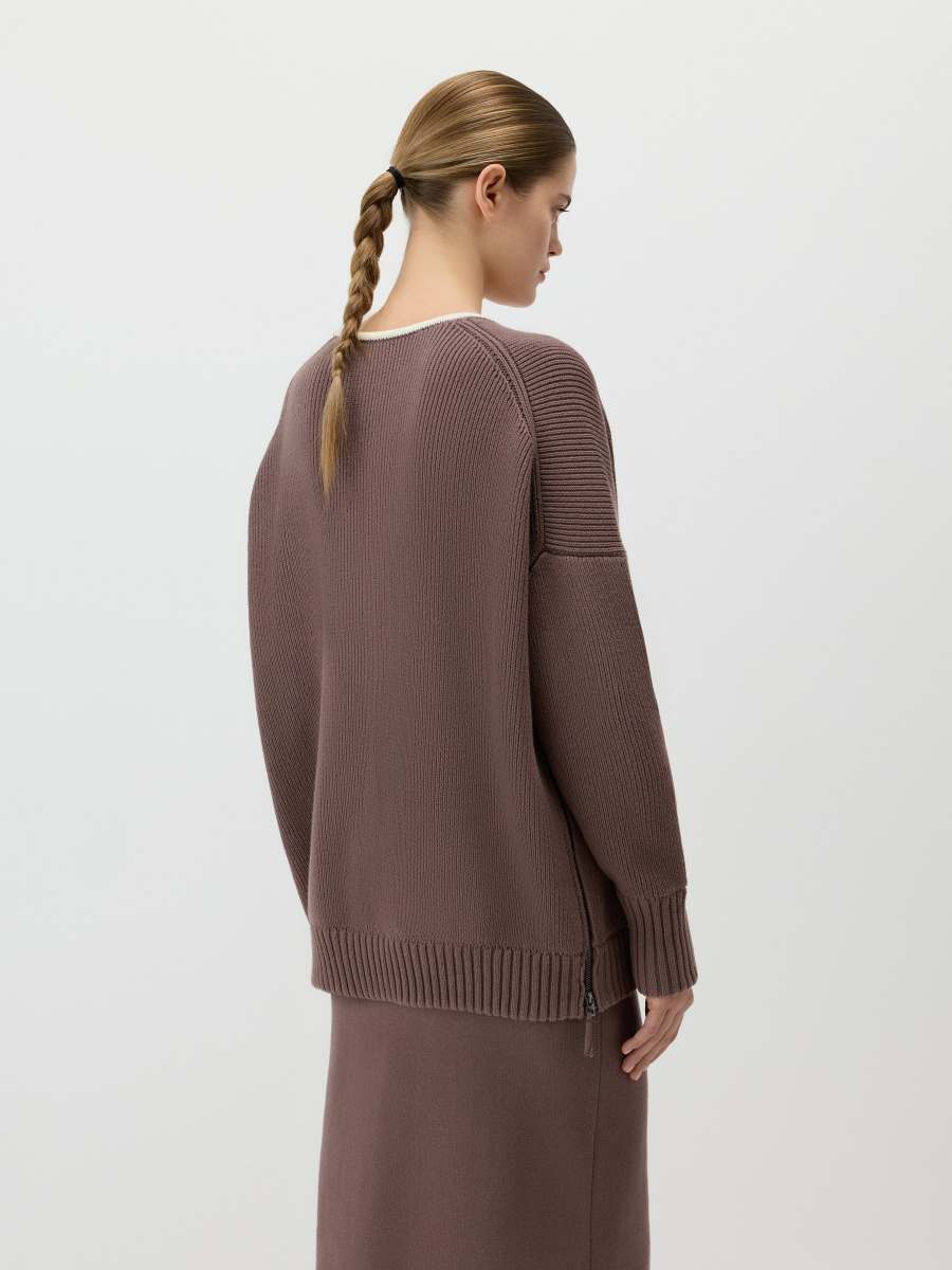 Удлиненный оверсайз-пуловер крупного плетения в рубчик из 100% хлопка. Выполнен с глубоким миндалевидным вырезом, оформлен акцентным кантом, подчеркивающим шею и ключицы. Особая деталь — функциональные молнии по боковым швам. Они позволяют легко менять силуэт, делая его более расслабленным или собранным.