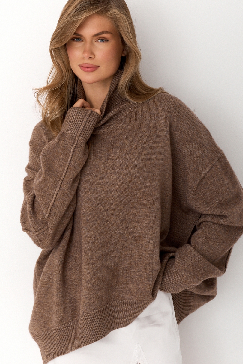 Основа любого гардероба в холодное время суток это наш свитер с горлом из кашемировых нитей. Свитер имеет оверсайз крой. Средняя длина. Вы можете его сочетать, не только с джинсами, но и с нашей комбинацией или юбкой из вискозы. Спокойные тона в коллекций данного свитера, позволяют составлять множество образов.