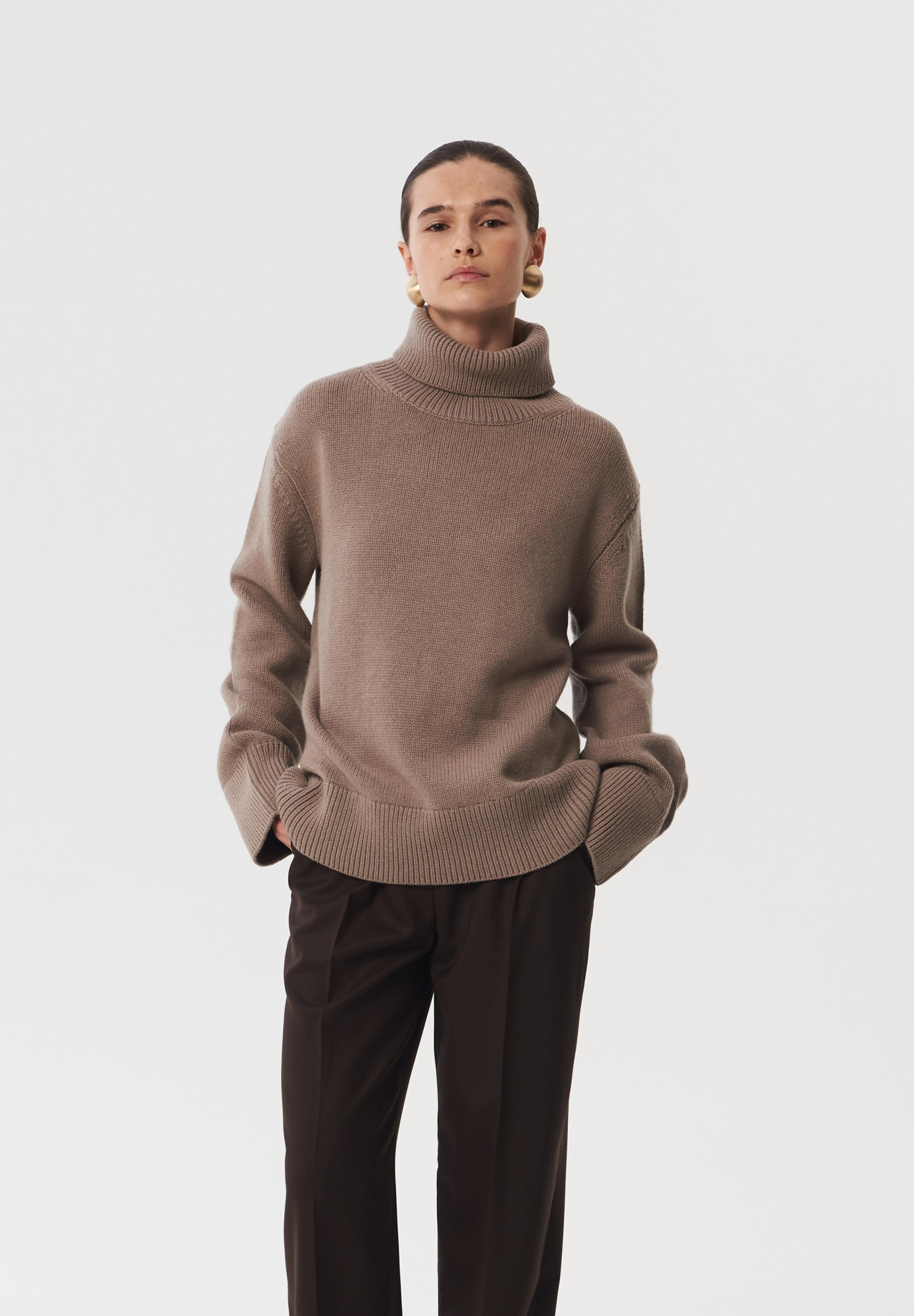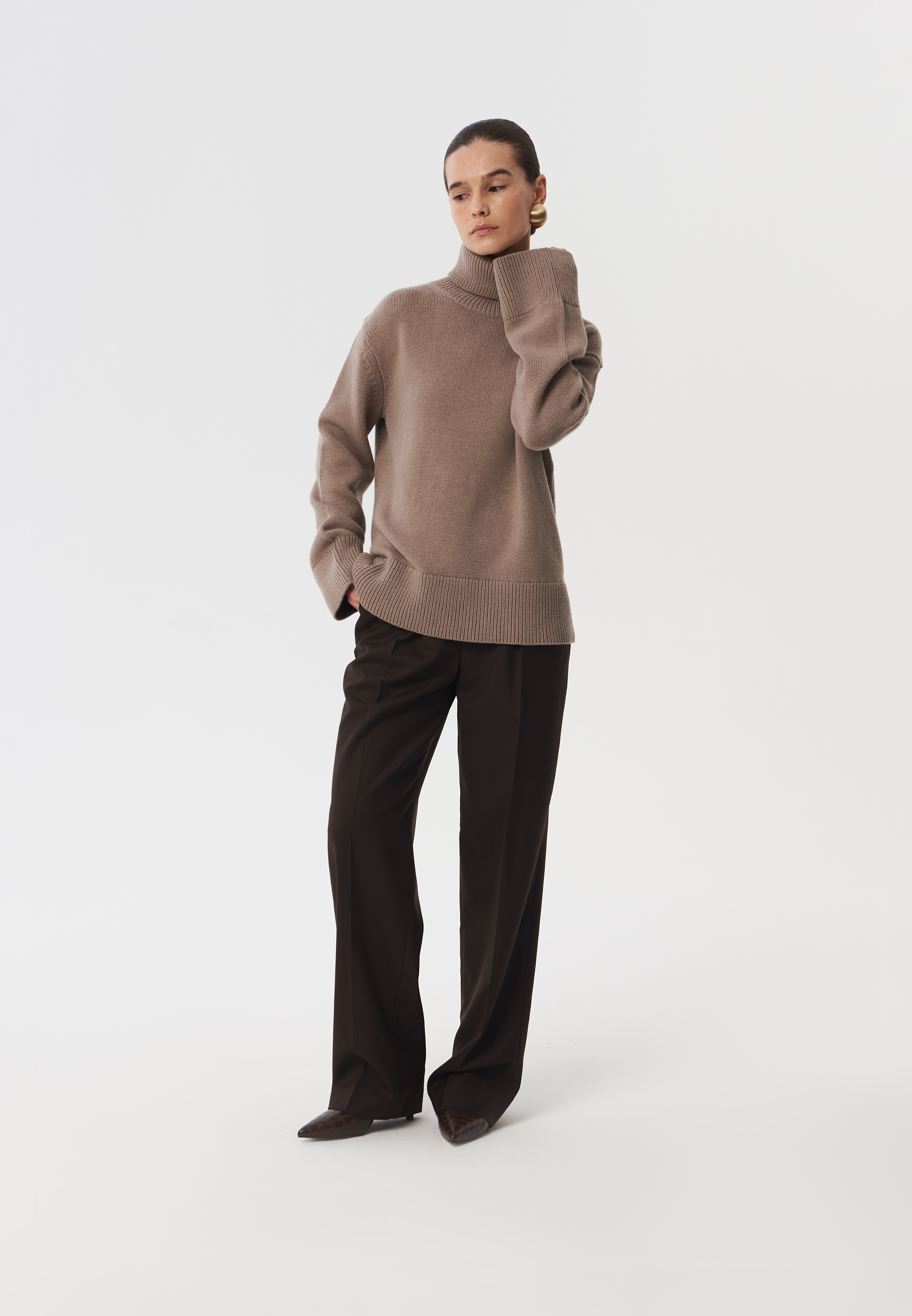 Свитер Nest выполнен из мягкой шерсти мериноса. Свитер достаточно объемный, с высоким воротником и широкими планками на рукавах и по низу изделия. Данную модель легко вписать в базовые гардероб за счет минималистичной формы и универсального оттенка.