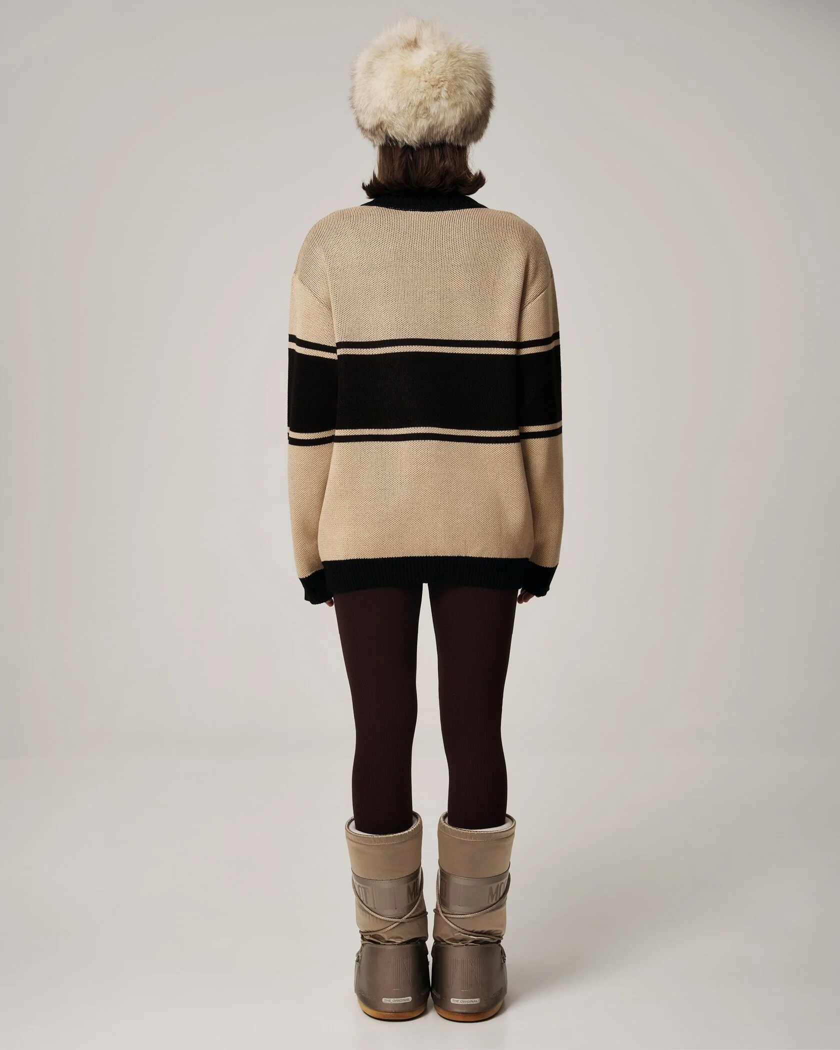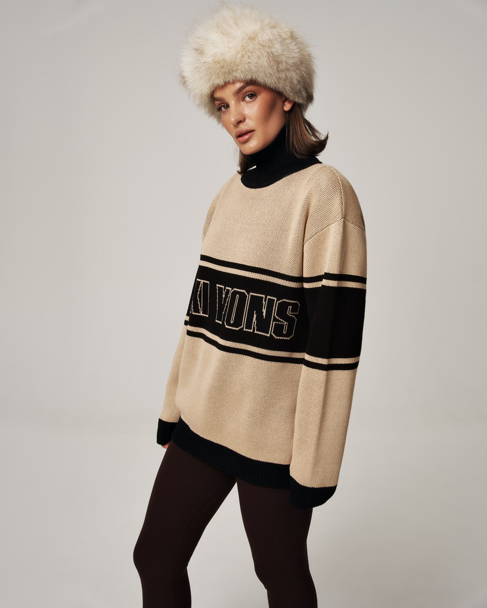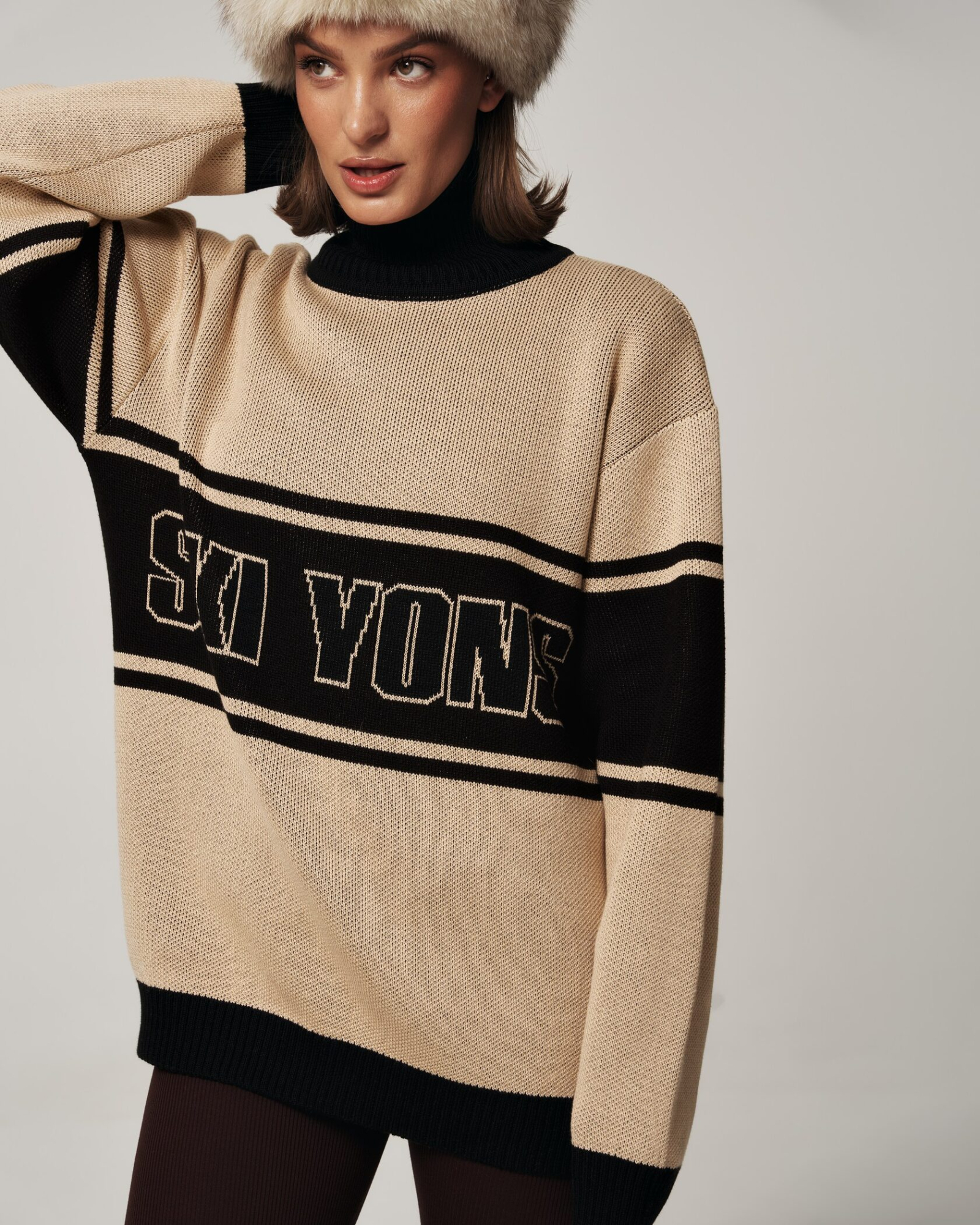 Свитер SKI YONS — бежево‑черный, в спортивно‑шик стиле. Объемный крой с длинными рукавами и высоким воротником‑хомутом, контрастная черная полоса с крупным логотипом по линии груди создают выразительный и современный образ. Идеален для холодного сезона — сочетает тепло, комфорт и городской стиль