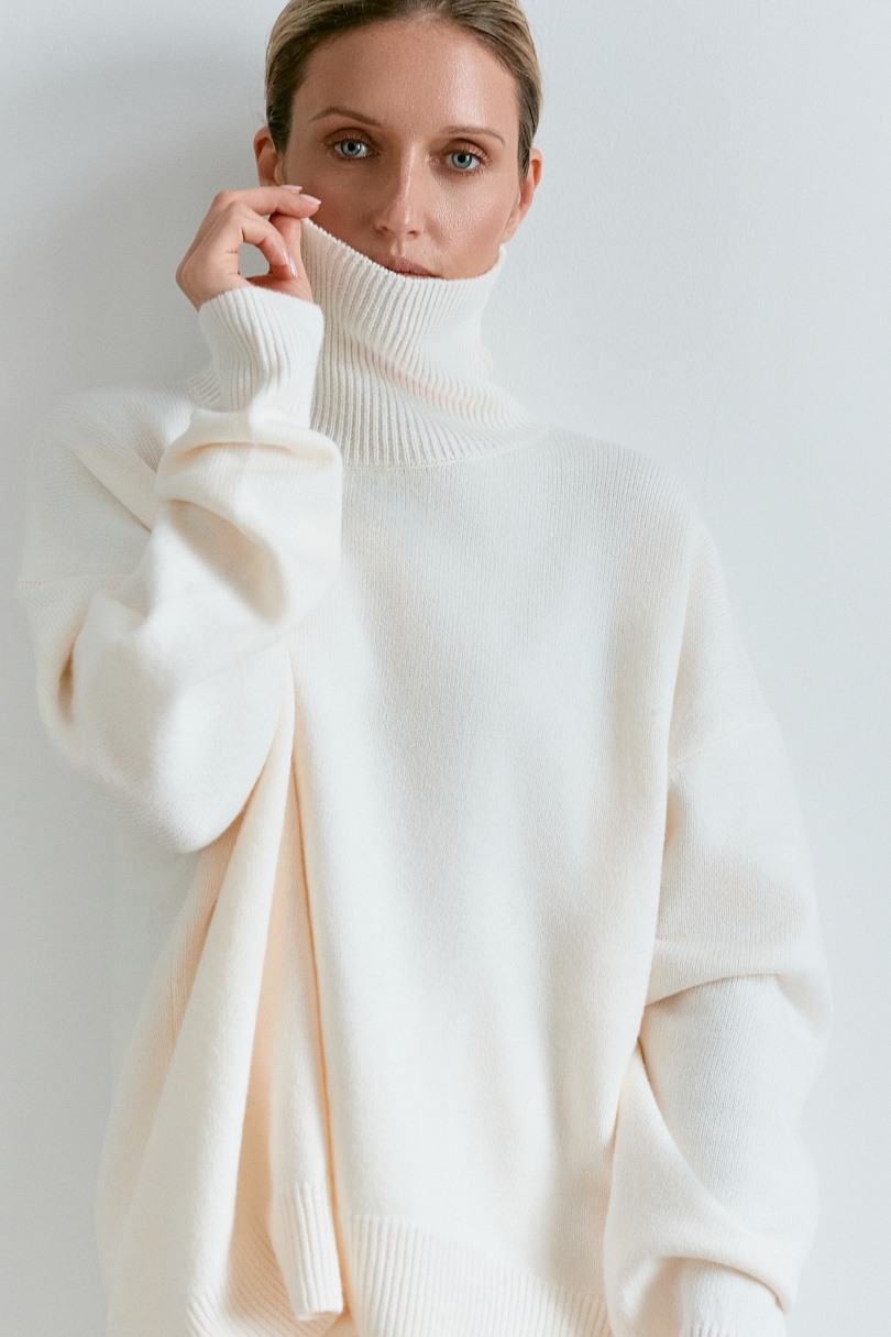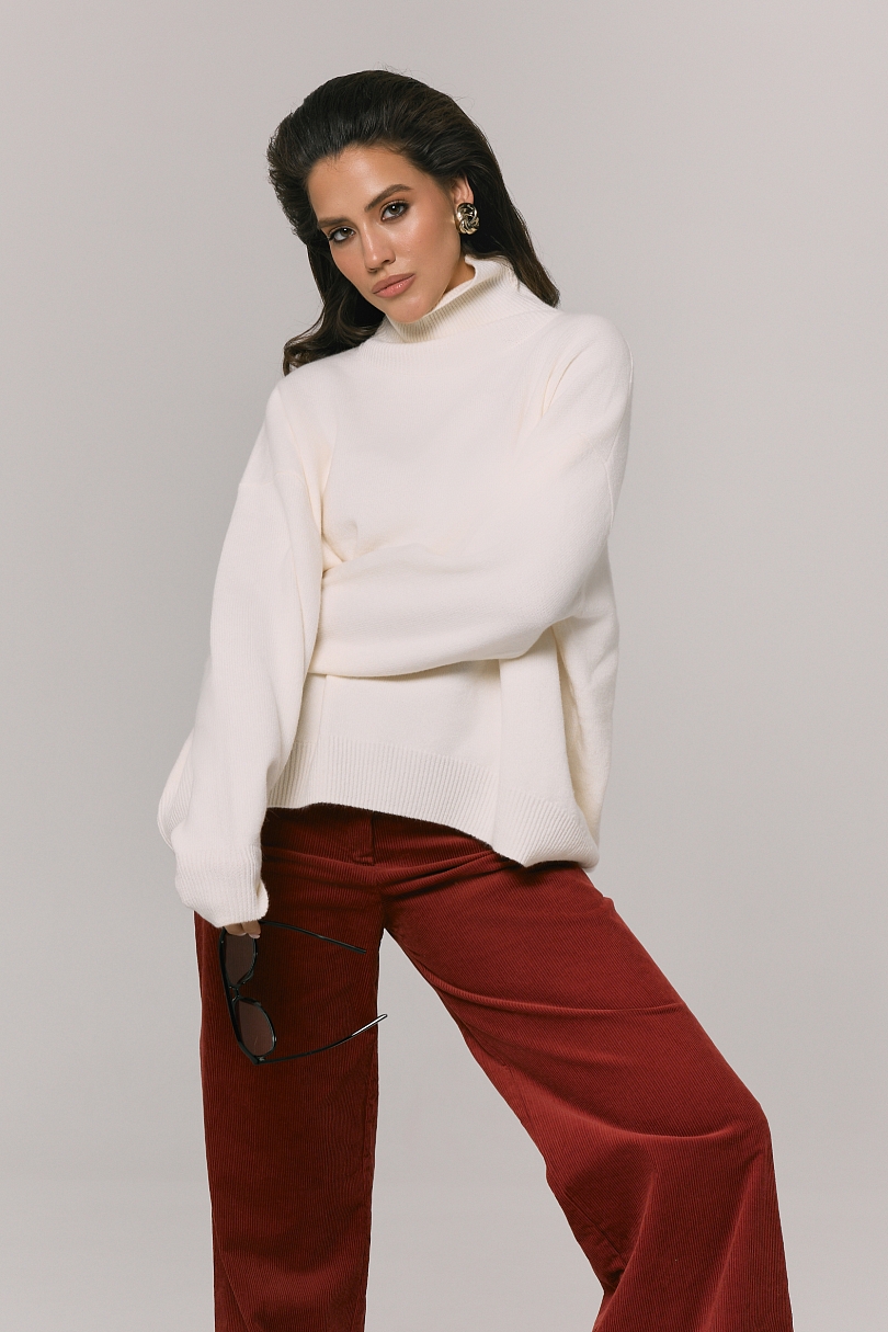 Основа любого гардероба в холодное время суток это наш свитер с горлом из шерсти. Свитер имеет оверсайз крой. Средняя длина. Вы можете его сочетать, не только с джинсами, но и с нашей комбинацией или юбкой из вискозы. Спокойные тона в коллекций данного свитера, позволяют составлять множество образов.