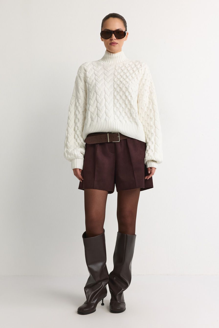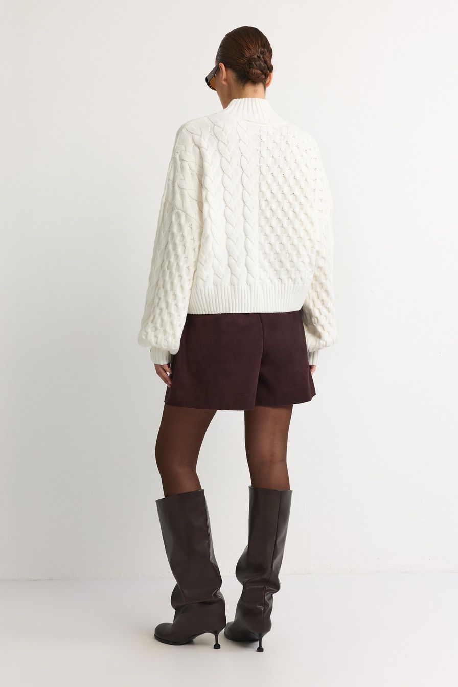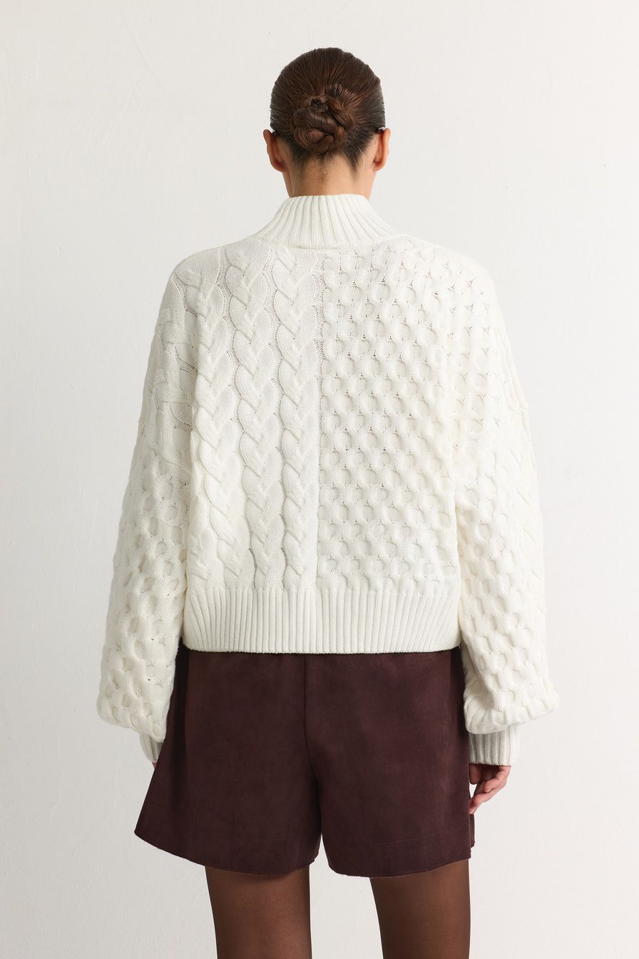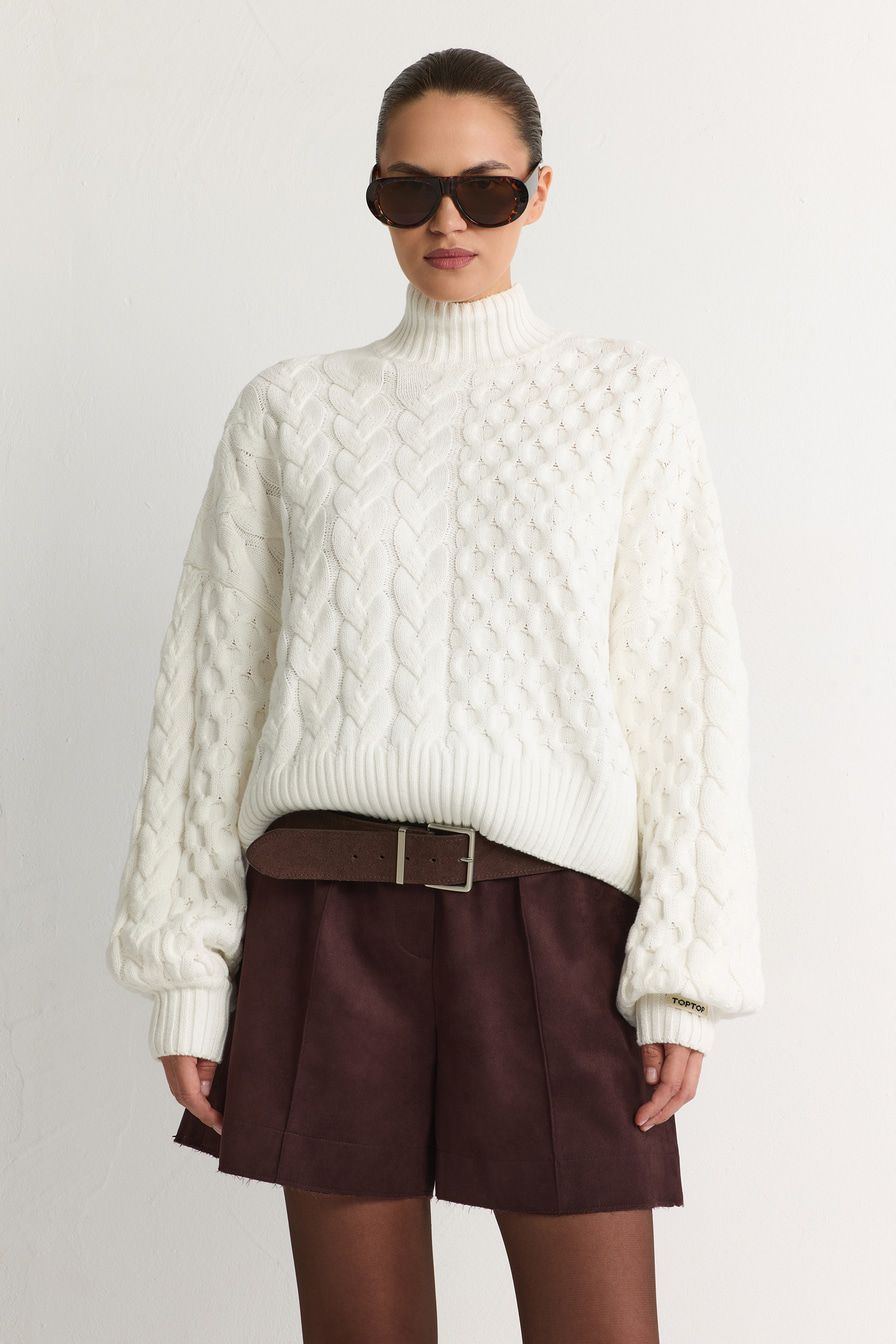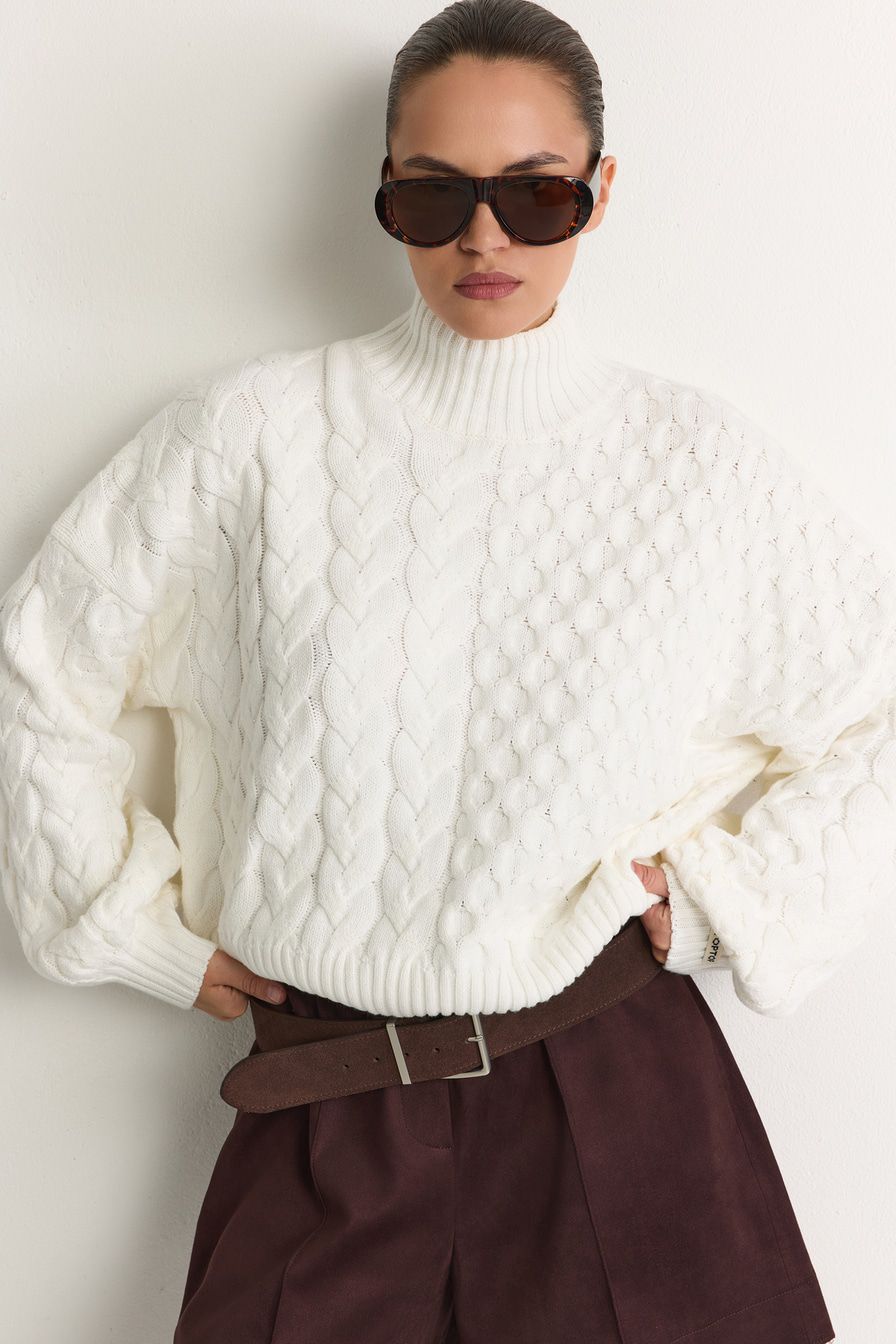 Молочный свитер выполнен из смесового хлопка и декорирован асимметричной фактурной вязкой «косичка».