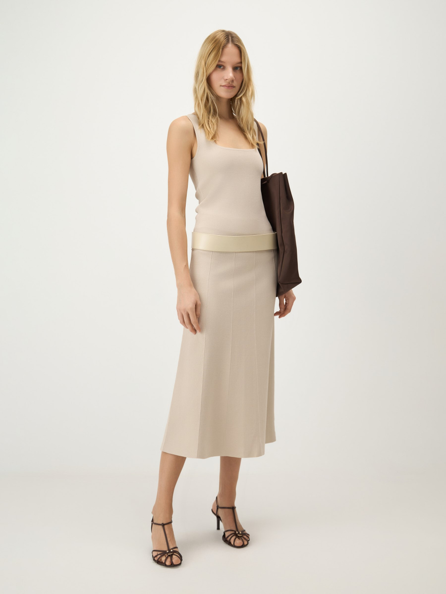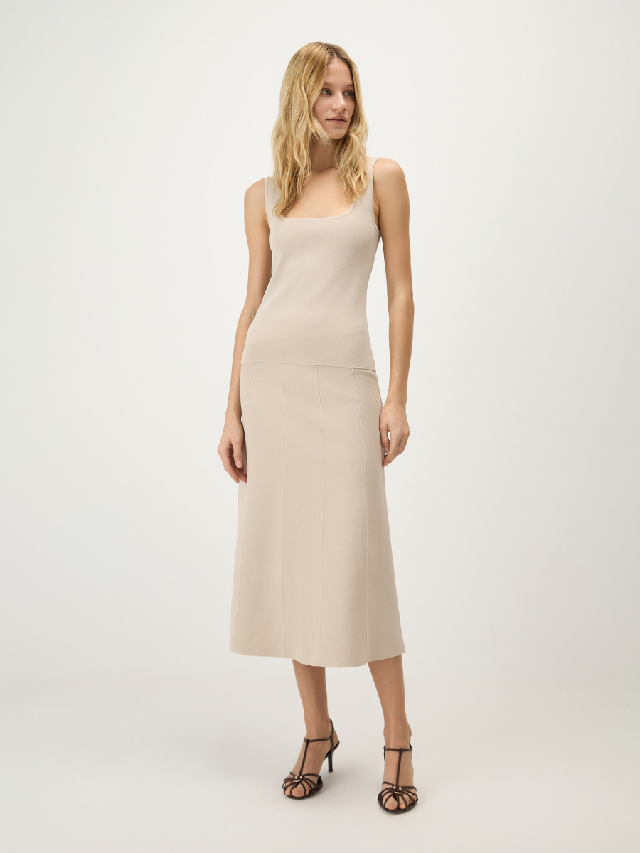 Облегающий топ с широкими бретелями. Связан из шелковистой пряжи на основе вискозы, усиленной нейлоном, — мягкой и формоустойчивой. Плотное плетение создает равномерное прилегание без заломов. Квадратный вырез подчеркивает ключицы, а обработка краев позволяет бретелям сохранять четкую форму без перекручиваний.