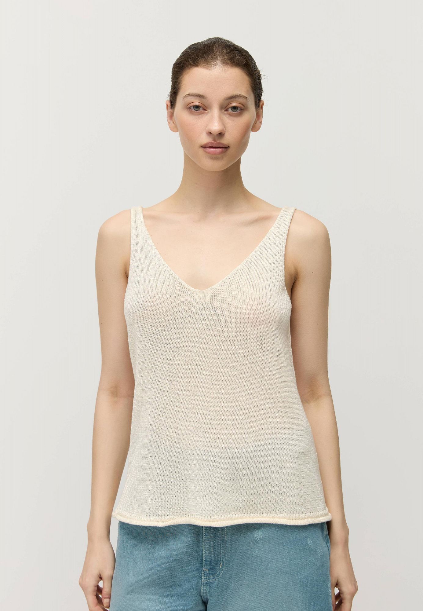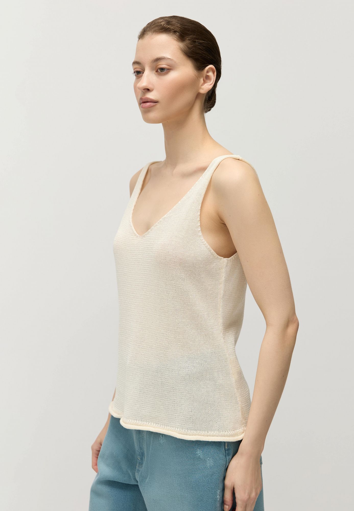 Топ связан из микса хлопка с вискозой, легкой и нежной к коже пряжи.