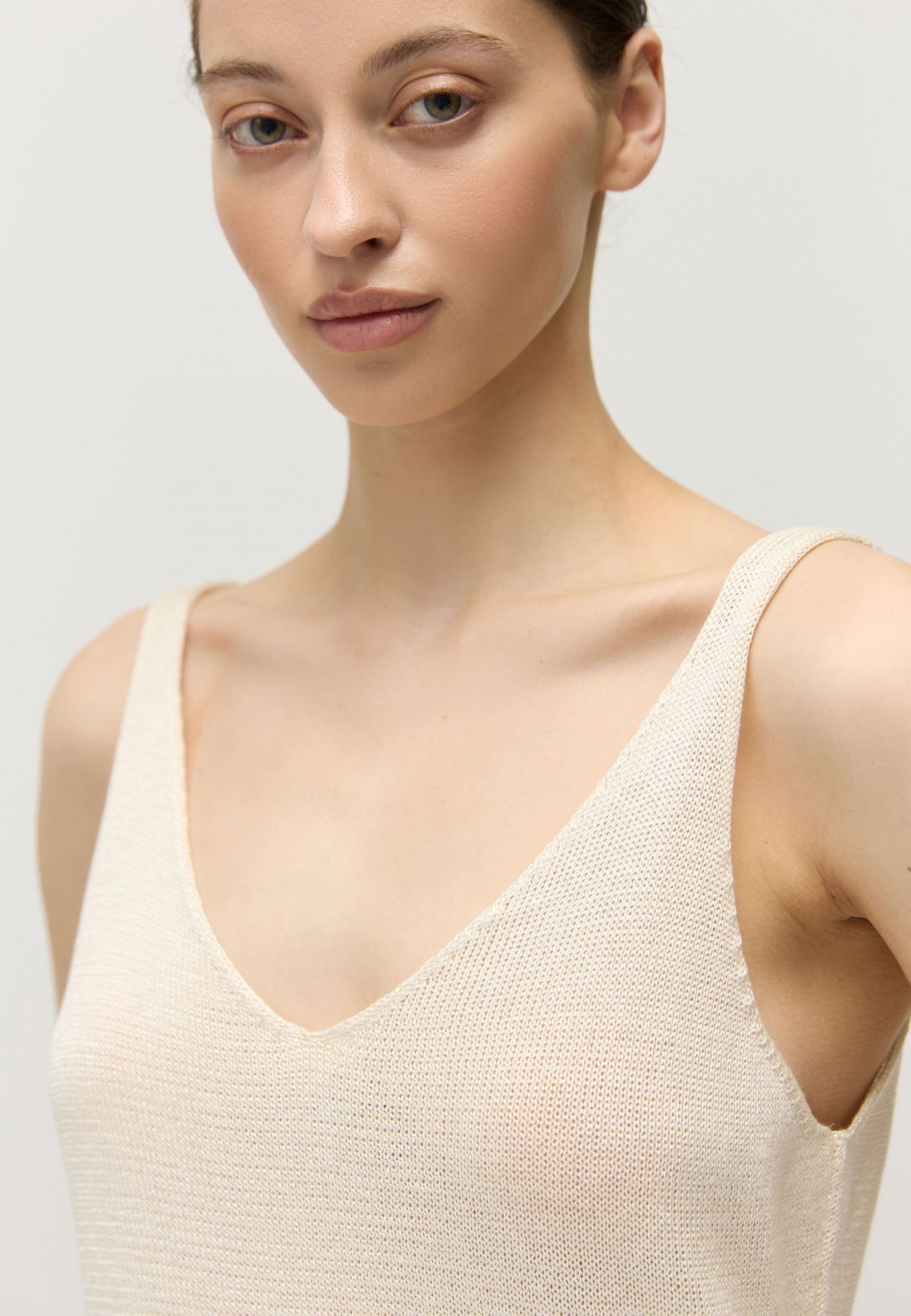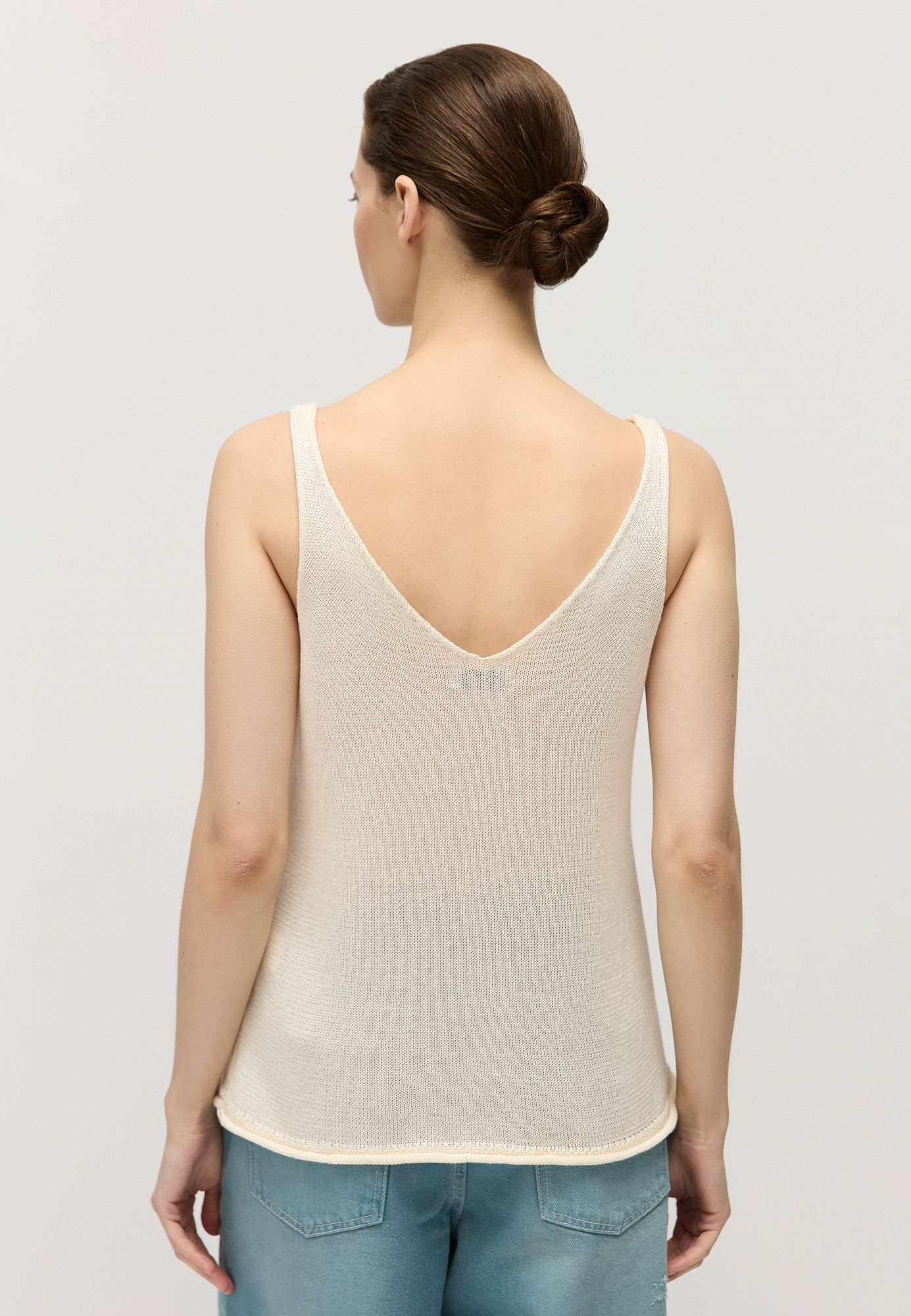 V-образный вырез горловины спереди и сзади переходит в узкие вывязанные бретели. По низу изделия вязка с закрученным эффектом.