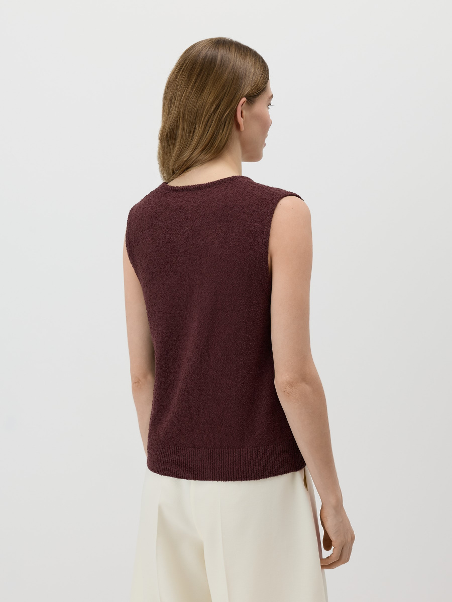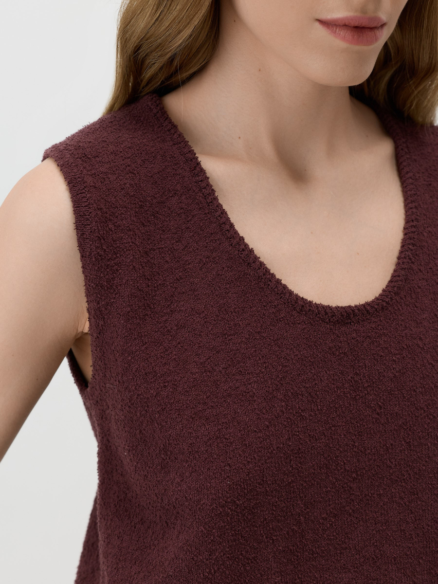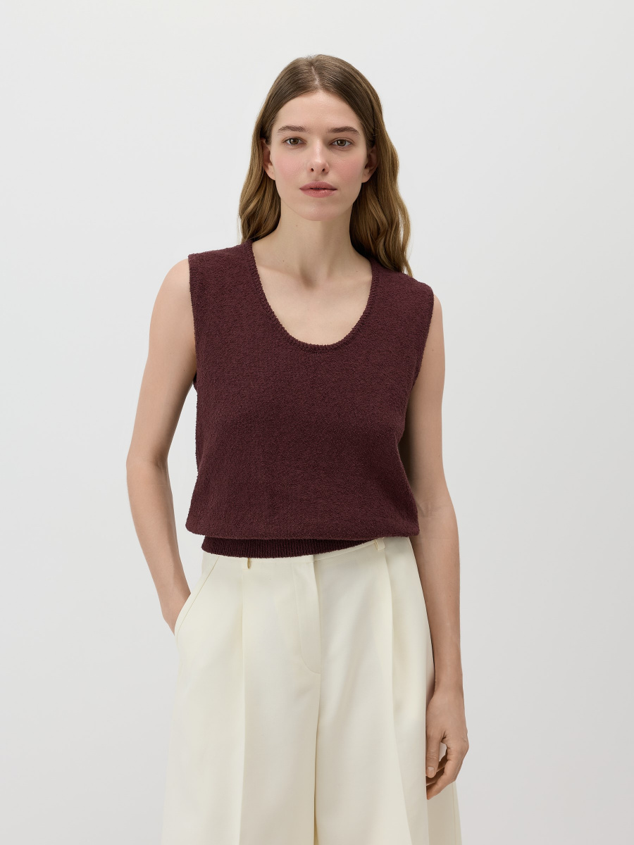 Укороченный топ среднего облегания, предназначенный для стилизации поверх рубашки, под кардиган, а также соло. V-образный вырез, окантованный декоративным вязанием, мягко подчеркивает линию шеи, а низ с легким напуском обеспечивает пластичность силуэта. Выполнен гладким плетением из хлопковой пряжи, которая пропускает воздух, создавая оптимальный уровень тепла.