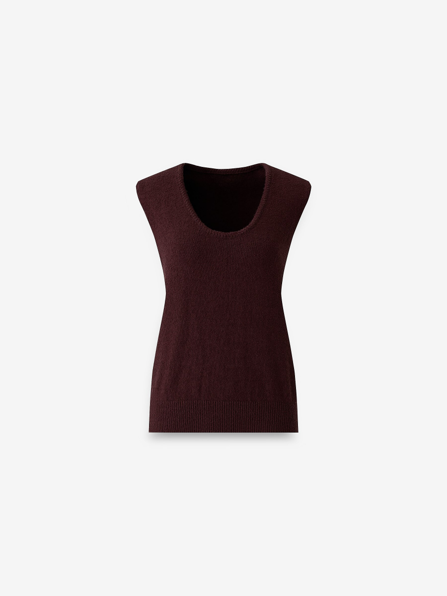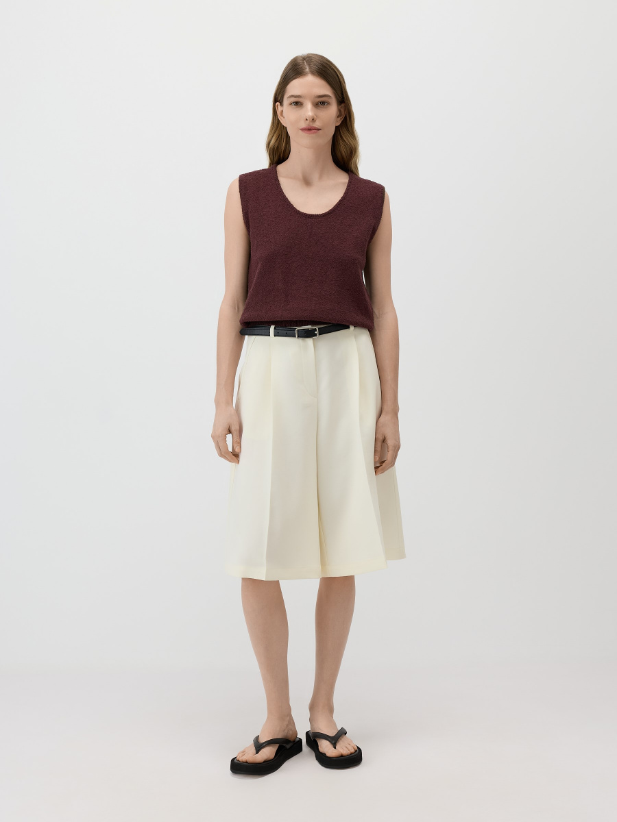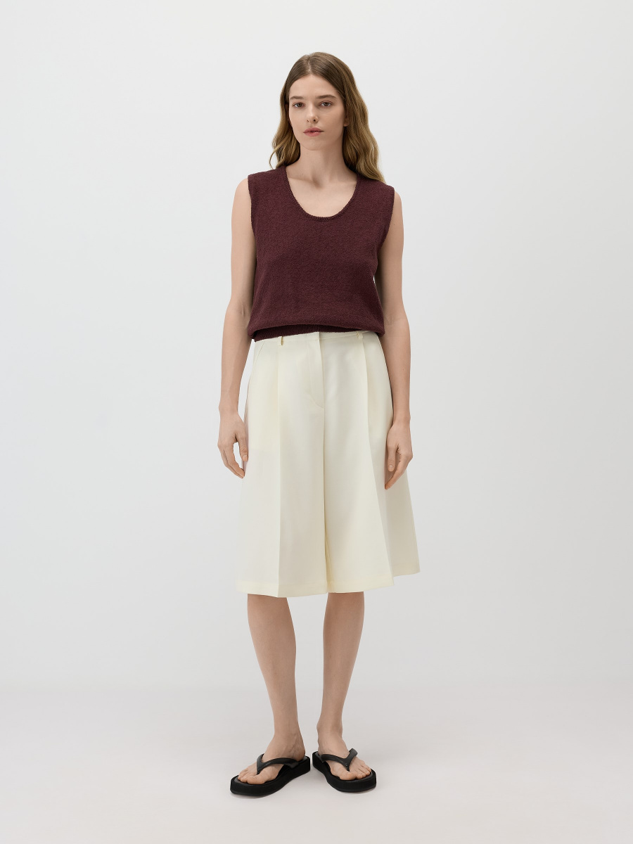 Укороченный топ среднего облегания, предназначенный для стилизации поверх рубашки, под кардиган, а также соло. V-образный вырез, окантованный декоративным вязанием, мягко подчеркивает линию шеи, а низ с легким напуском обеспечивает пластичность силуэта. Выполнен гладким плетением из хлопковой пряжи, которая пропускает воздух, создавая оптимальный уровень тепла.