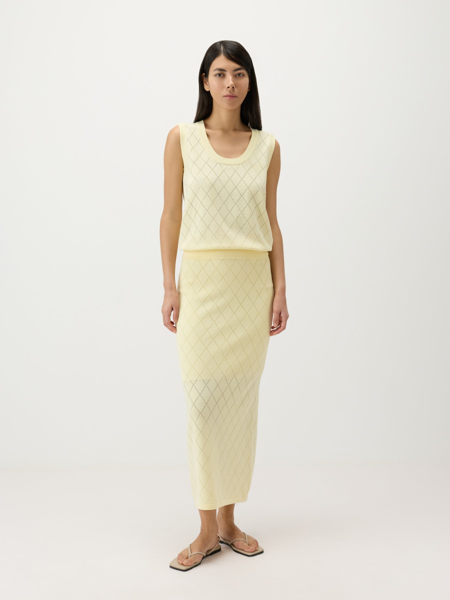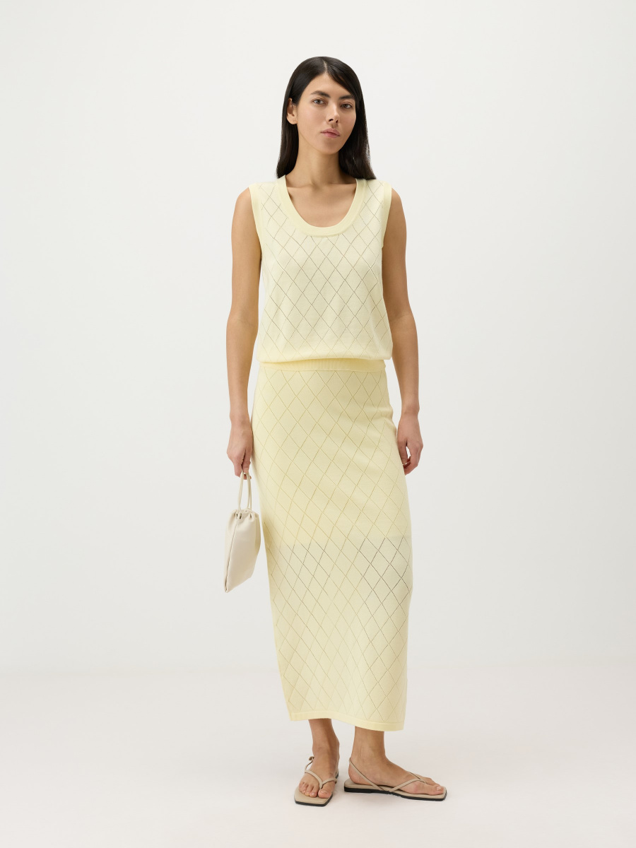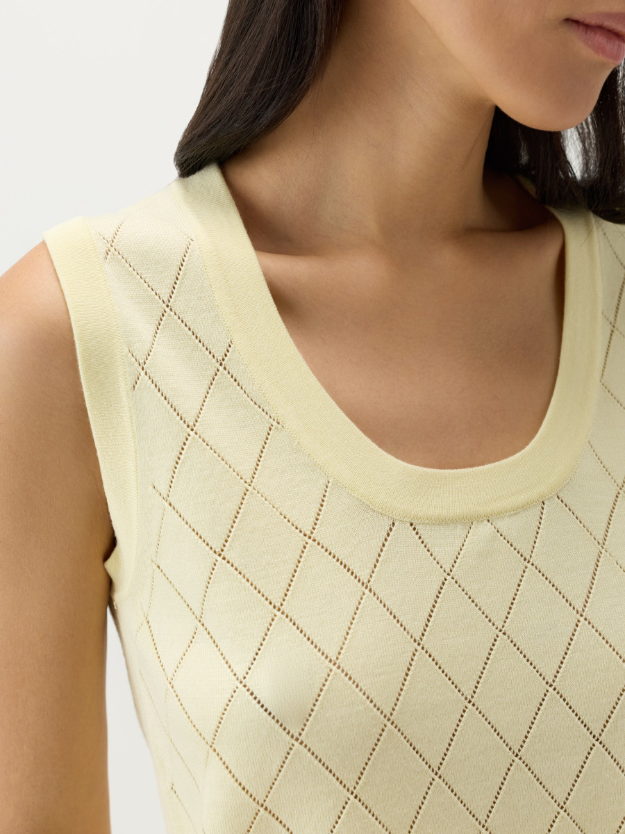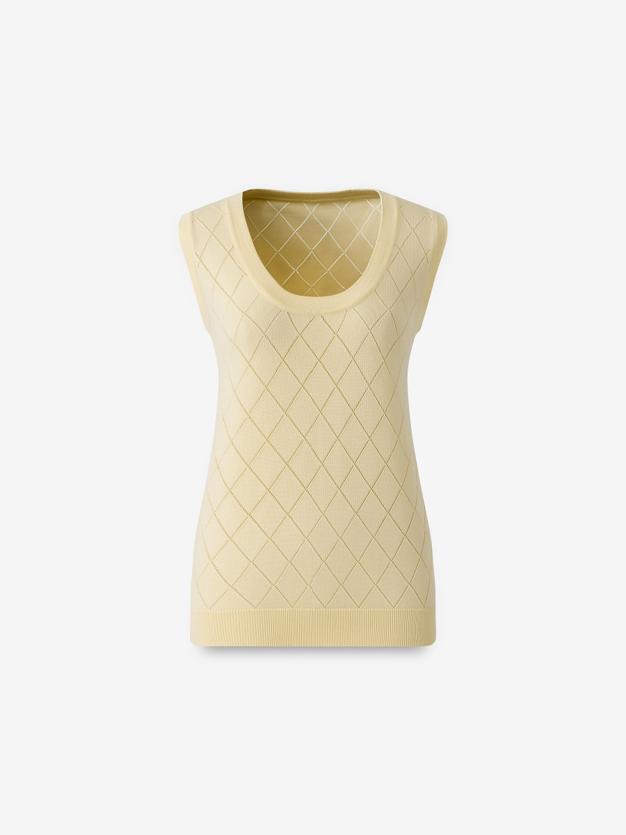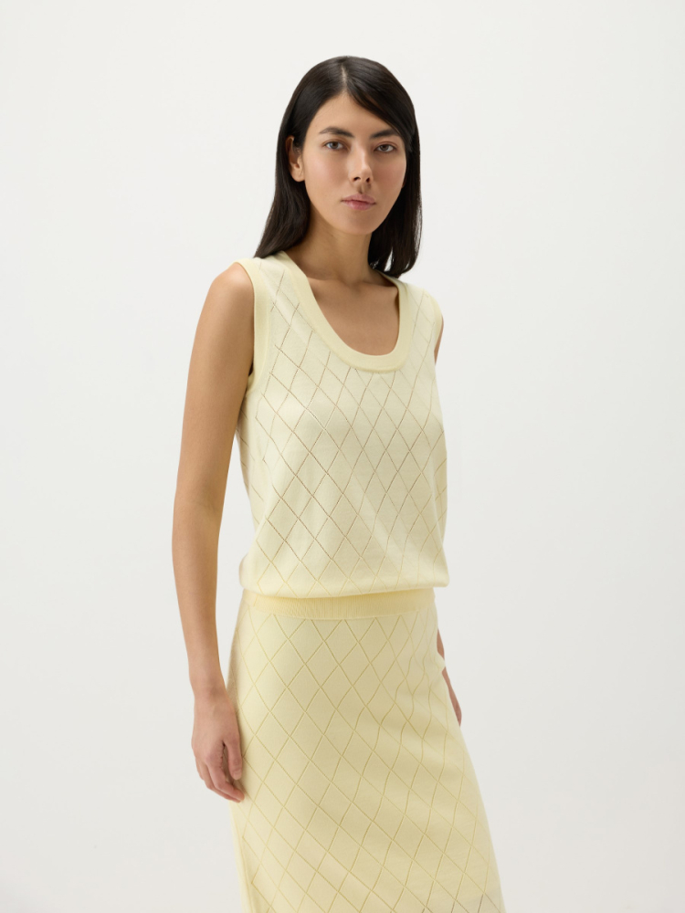 Прямой топ среднего облегания с U-образным вырезом и широкими бретелями. Ажурное ромбовидное плетение задает легкое весенне-летнее настроение и делает модель визуально воздушной. Мягкая вискозная пряжа в сочетании с перфорацией обеспечивает приток воздуха к коже и охлаждает. Горловина, проймы и низ оформлены фактурной резинкой, формирующей собранный контур.