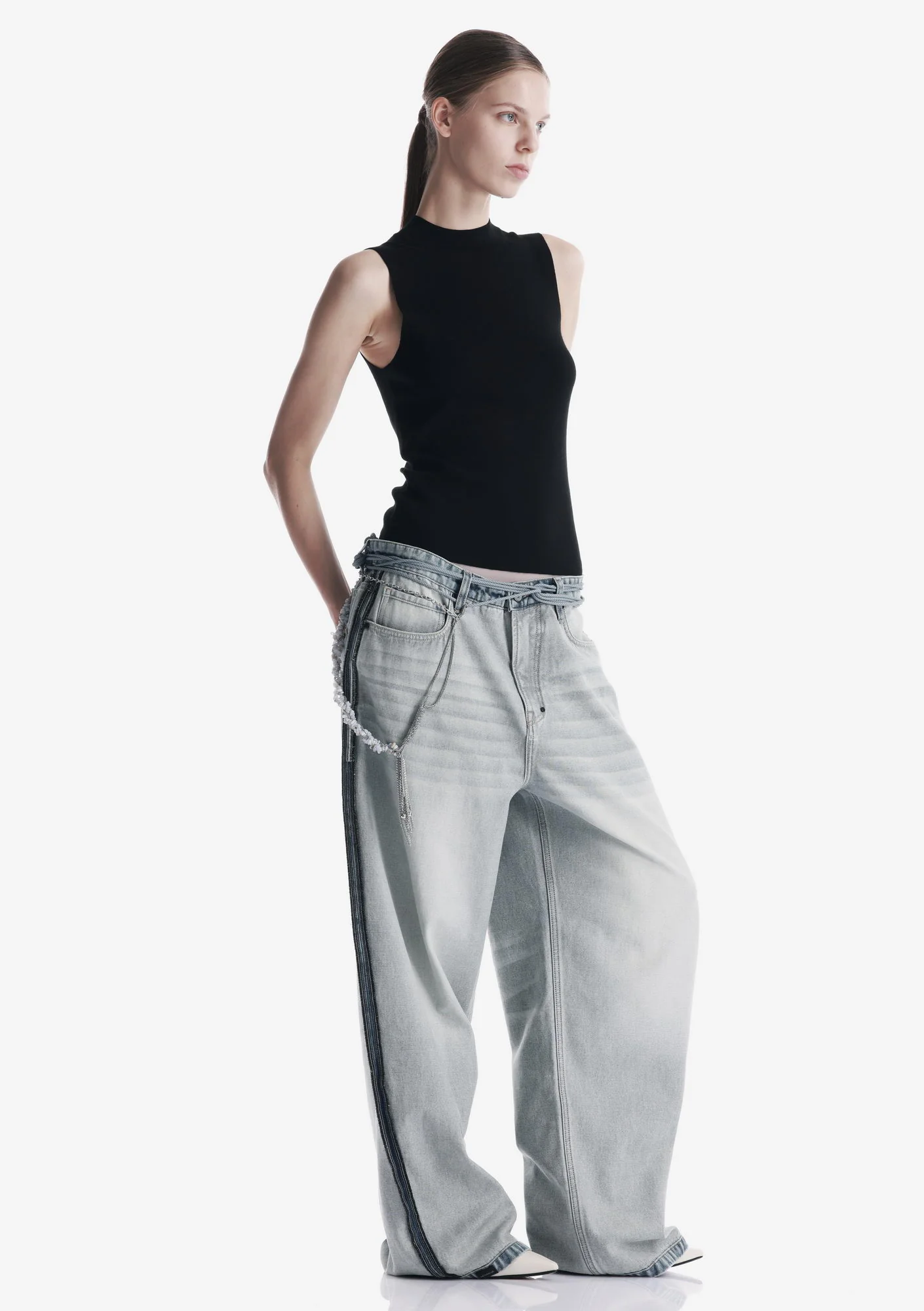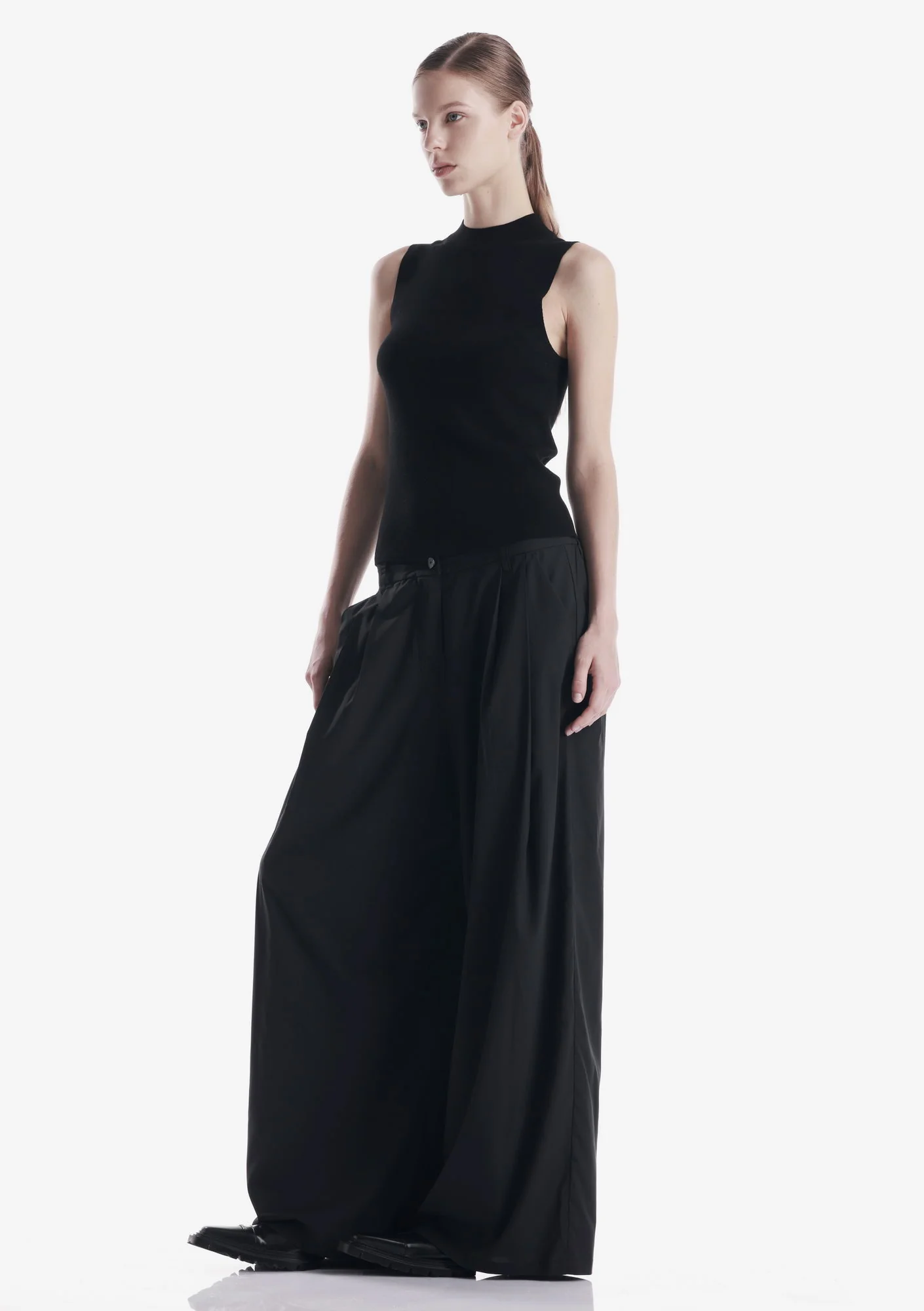 Топ без рукавов с эластичным воротником-стойкой из мягкой пряжи. Лаконичный крой и упругая структура материала поддерживают аккуратную посадку и комфорт.