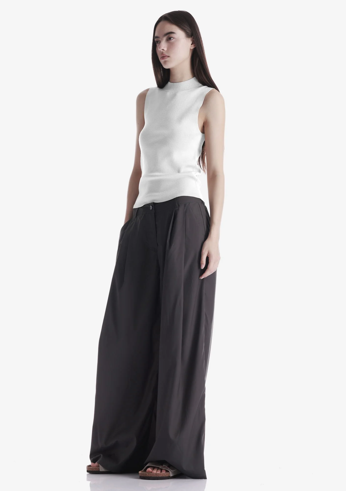 Топ без рукавов с эластичным воротником-стойкой из мягкой пряжи. Лаконичный крой и упругая структура материала поддерживают аккуратную посадку и комфорт.