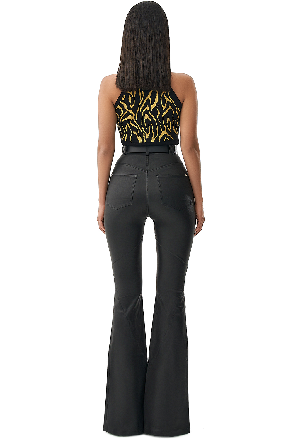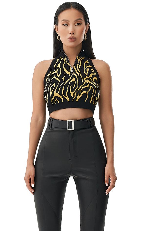 Трикотажный топ-халтер с высоким воротником и застежкой-молнией выполнен из мягкой натуральной пряжи. Динамичный укороченный дизайн дополнен анималистичным узором, вдохновленным дикими мотивами саванны, что добавляет образу дерзкие ноты.
