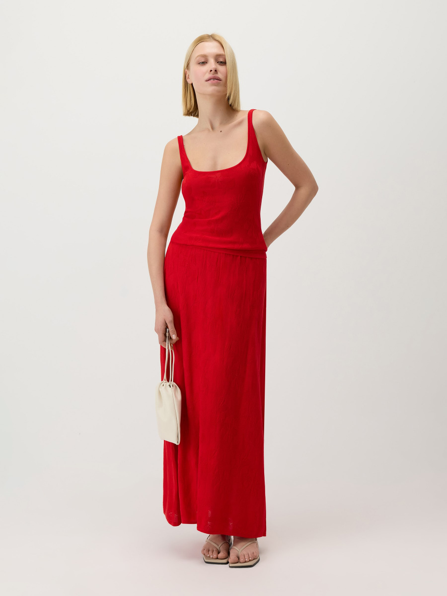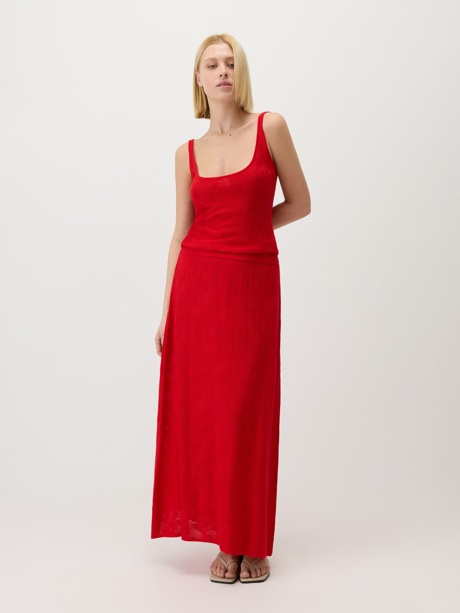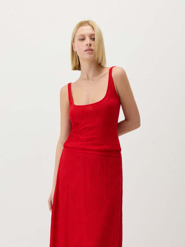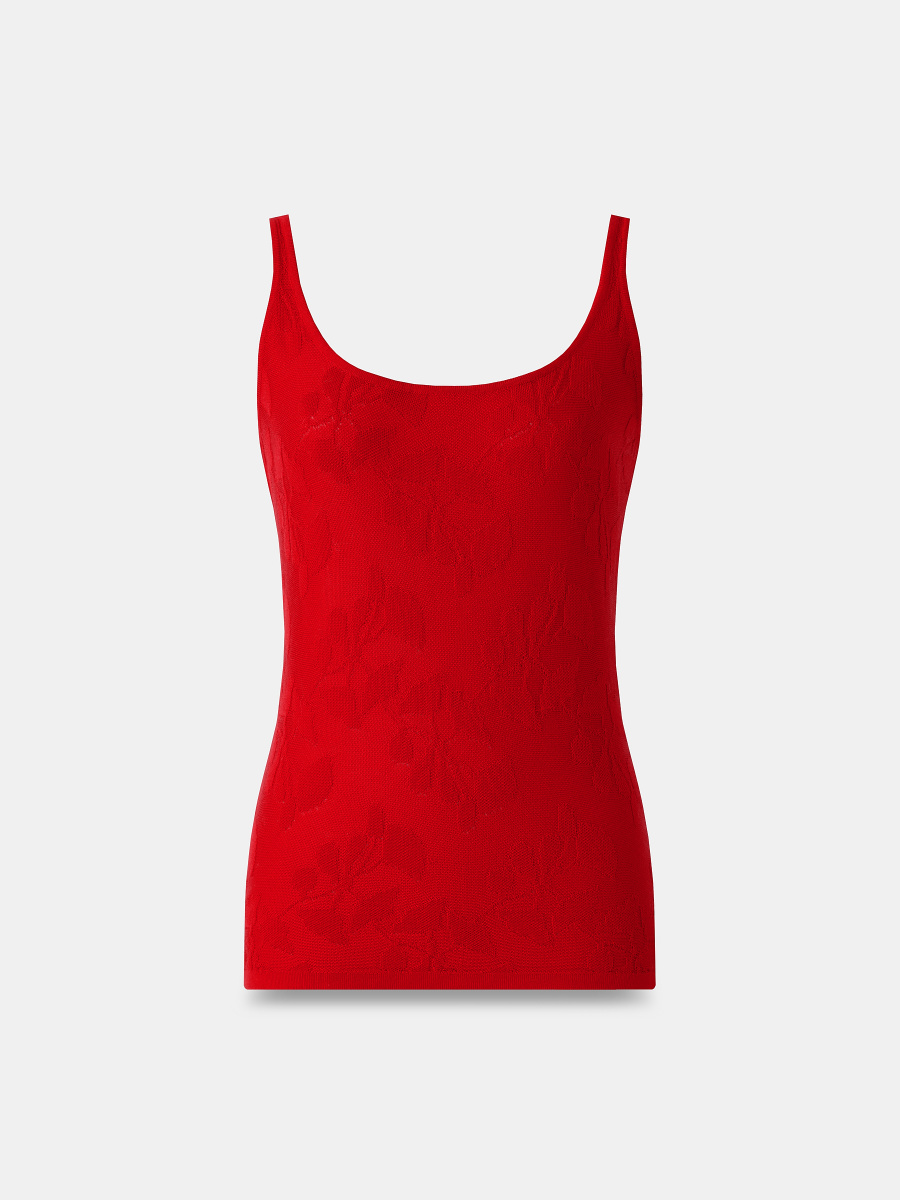 Облегающий топ на тонких бретелях в эстетике современного минимализма. Лаконичный силуэт оживает за счет ажурной вязки с флористическим рисунком, которая создает эффект сатиновых бликов. Модель выполнена из легкого, но плотного премиального трикотажа на основе "древесного шелка" лиоцелла. Благодаря средней длине топ можно носить навыпуск или заправлять в юбку или брюки.