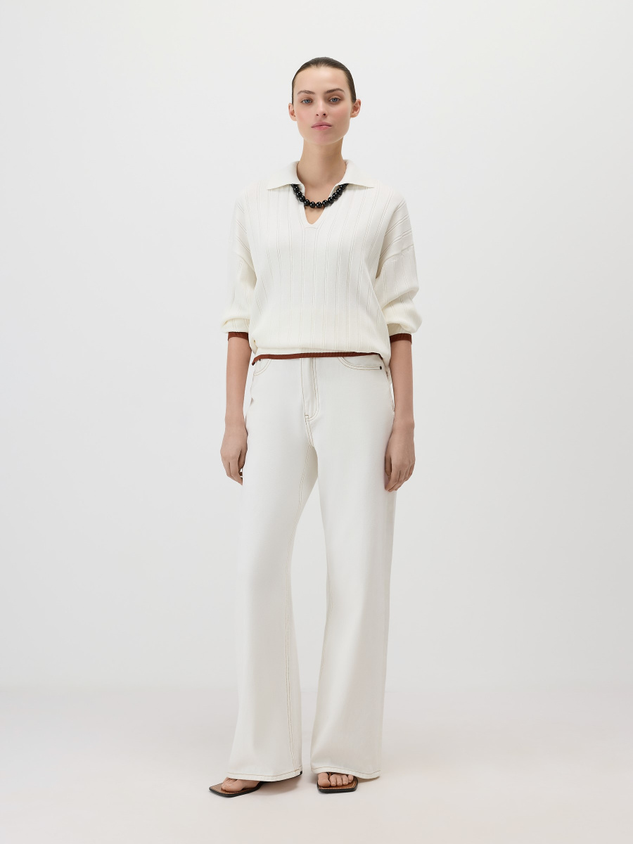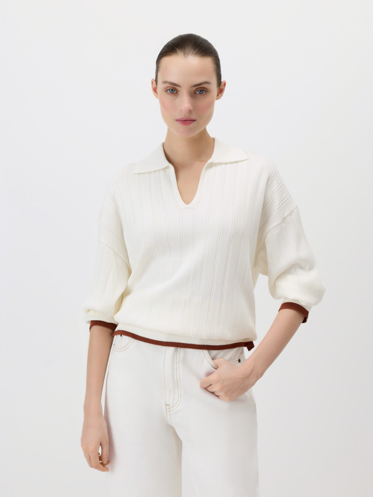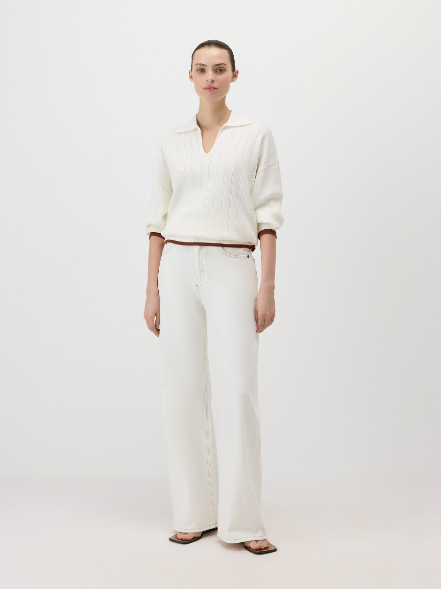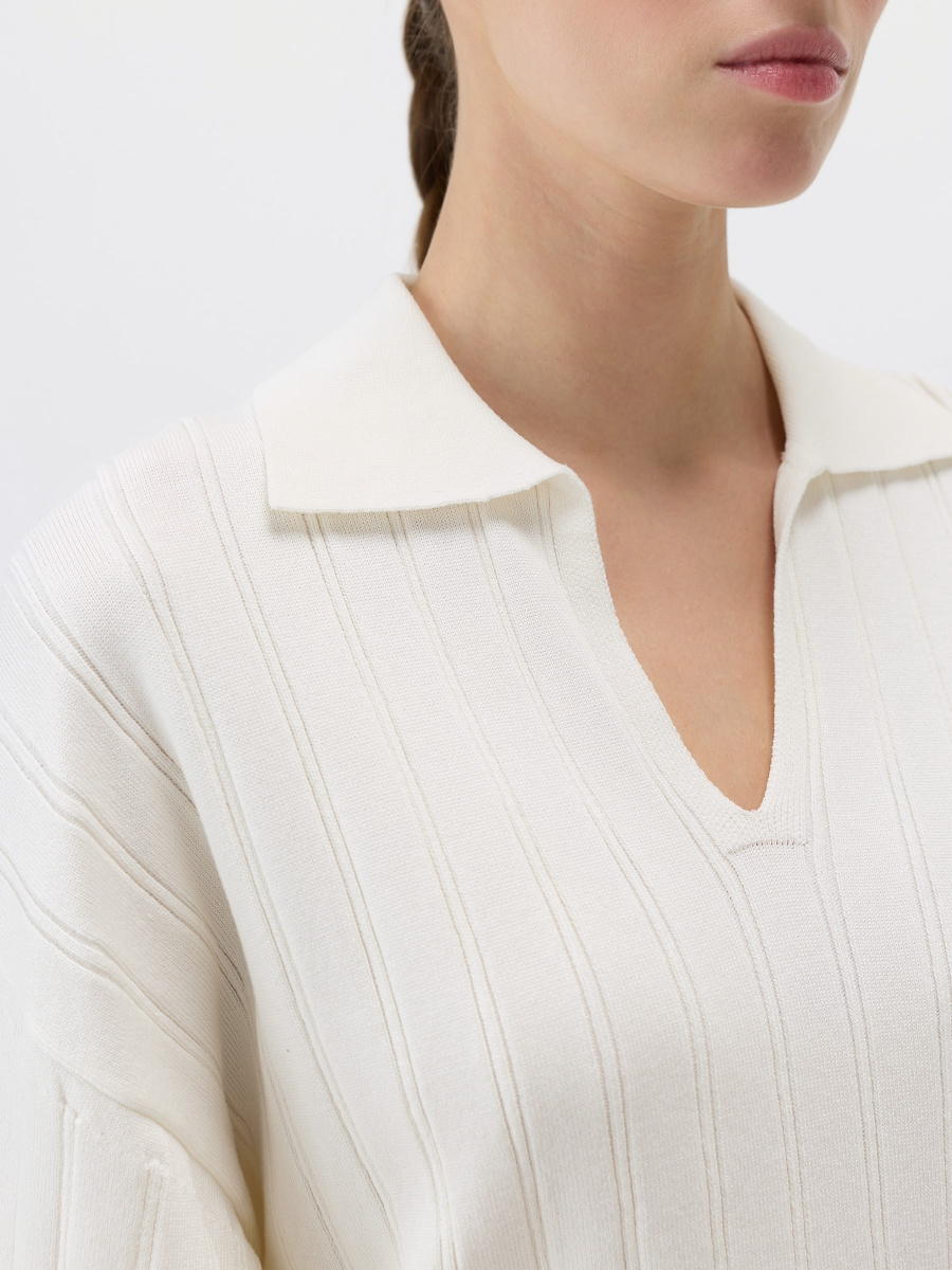 Свободный пуловер в стиле поло из эластичной “сухой” вискозы, усиленной нейлоном для прочности и формоустойчивости. Выполнен плетением в широкий рубчик, которое визуально делает фигуру выше и стройнее. Плечевые швы перенесены на спинку для оптимального прилегания, а боковые разрезы позволяют изделию естественно драпироваться и сочетаться с разными низами.