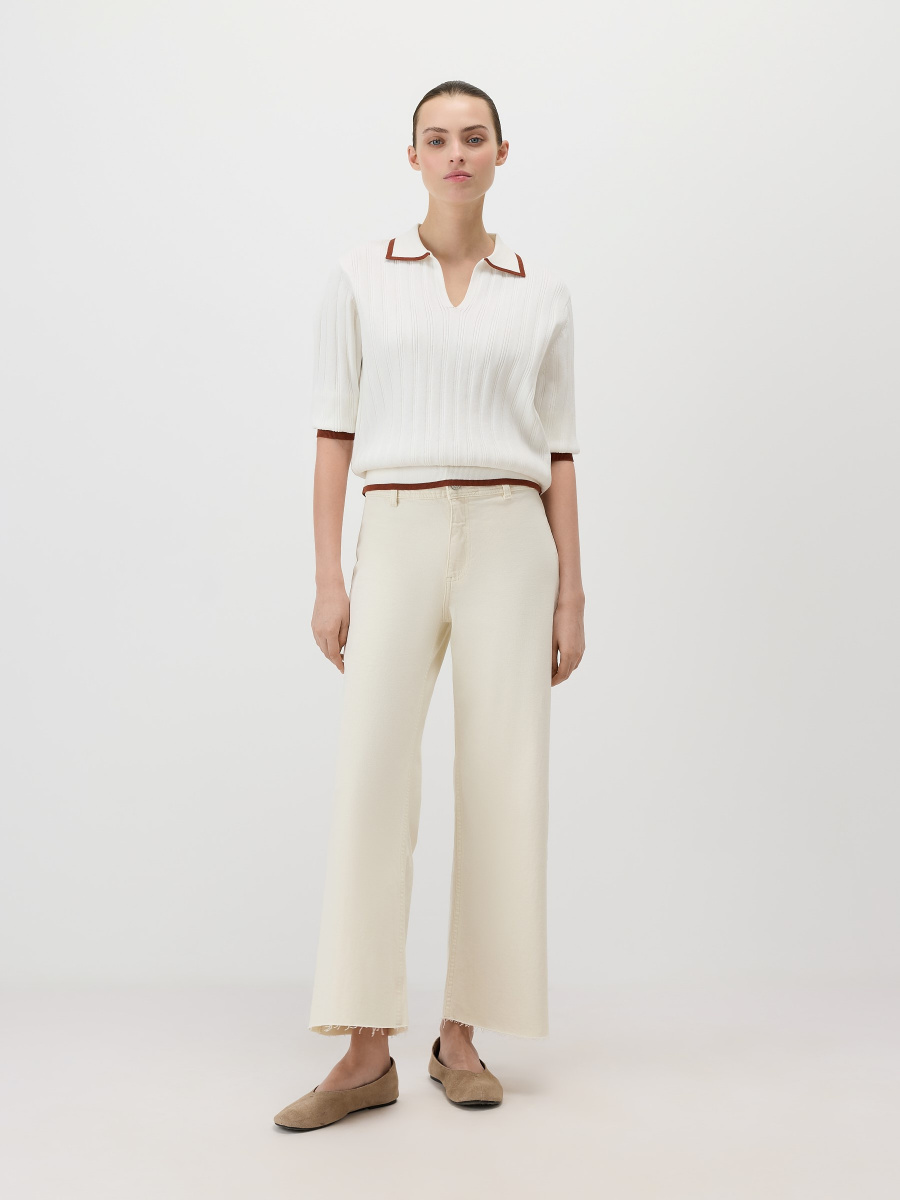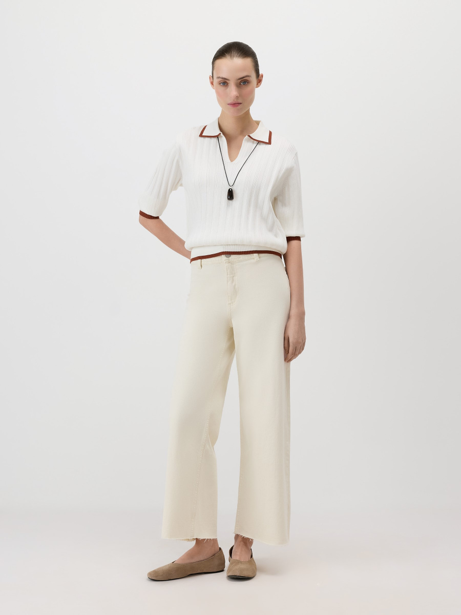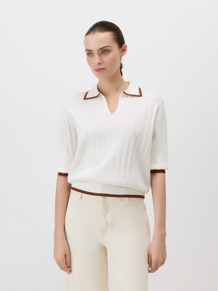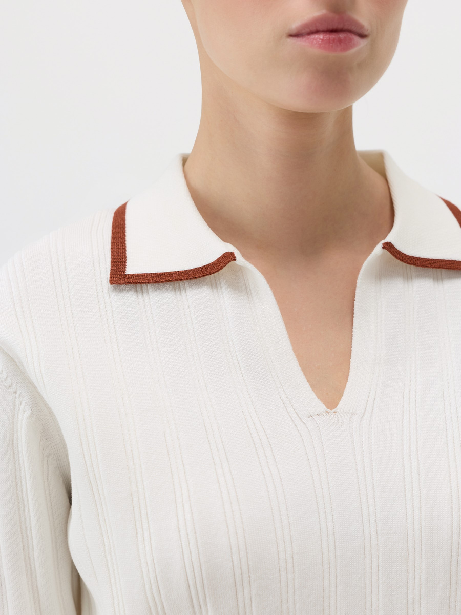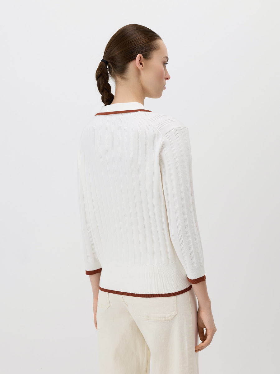Прямой пуловер в стиле поло среднего облегания с рукавом 7/8. Выполнен из эластичного “сухого” полотна на основе вискозы, формоустойчивого и не склонного к пиллингации. Плотная вязка в широкий рубчик визуально стройнит. Низ оформлен рибом с легким напуском, создающим естественный объем, а плечевые швы смещены на спинку для комфортной посадки.