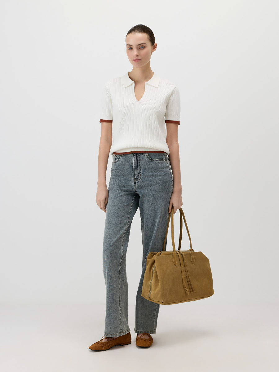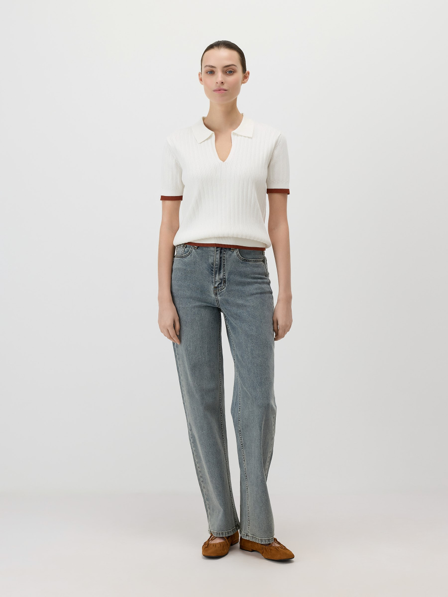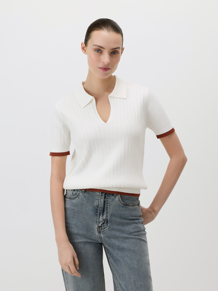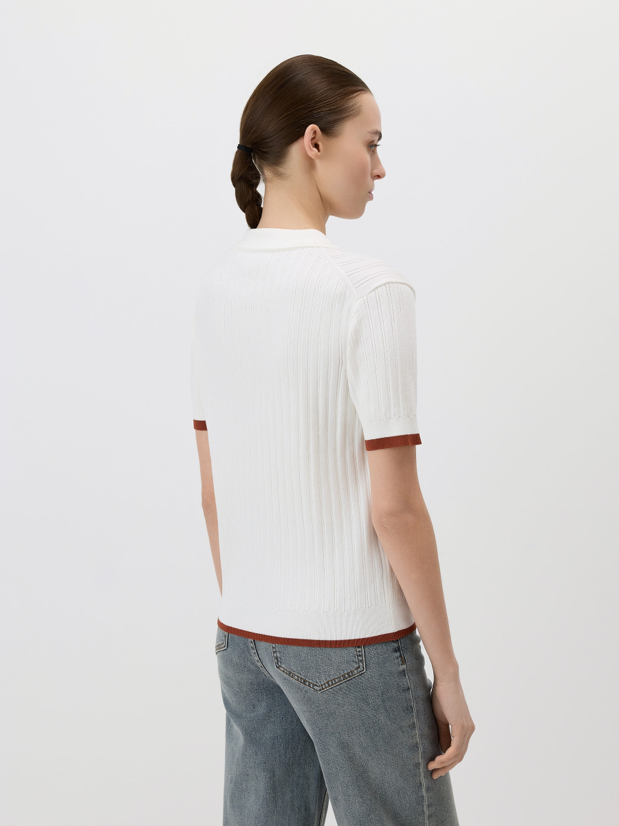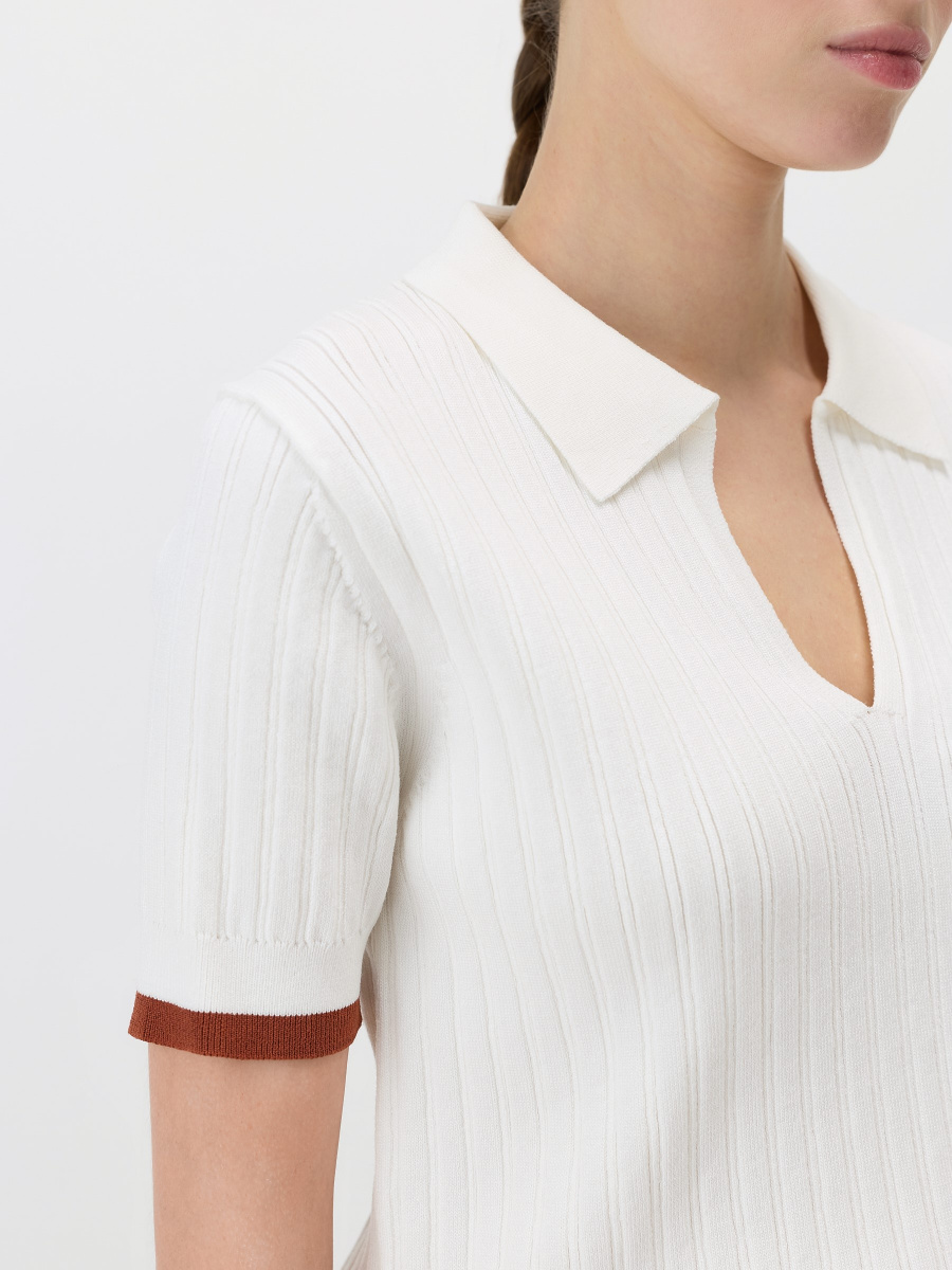 Прямой пуловер в стиле поло среднего облегания с коротким рукавом. Выполнен из эластичного “сухого” полотна на основе вискозы, усиленной нейлоном, поэтому не скатывается и сохраняет форму и цвет. Плотная вязка в широкий рубчик визуально вытягивает силуэт. Плечевые швы смещены на спинку для оптимальной посадки, а длина позволяет носить модель как заправленной, так и навыпуск.