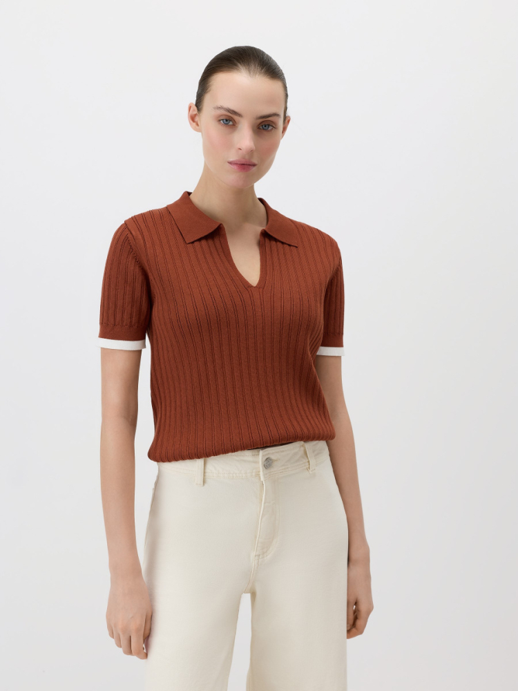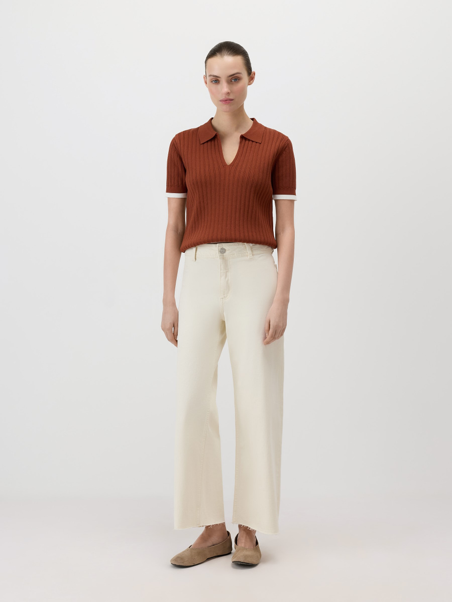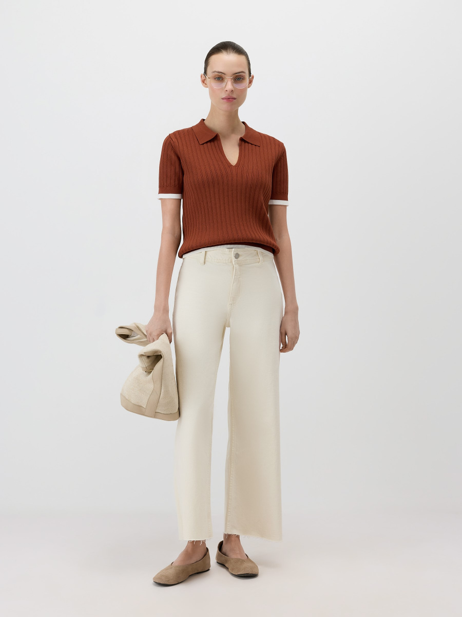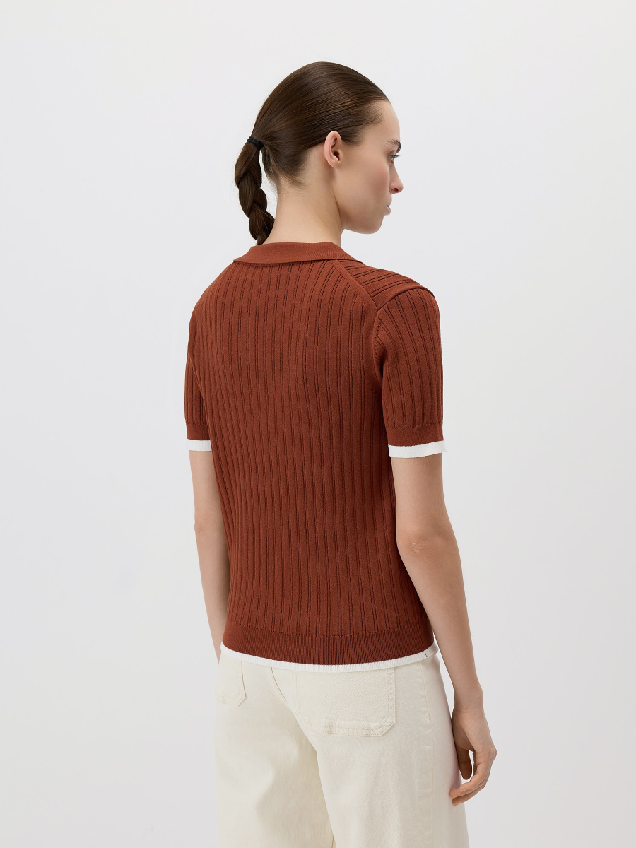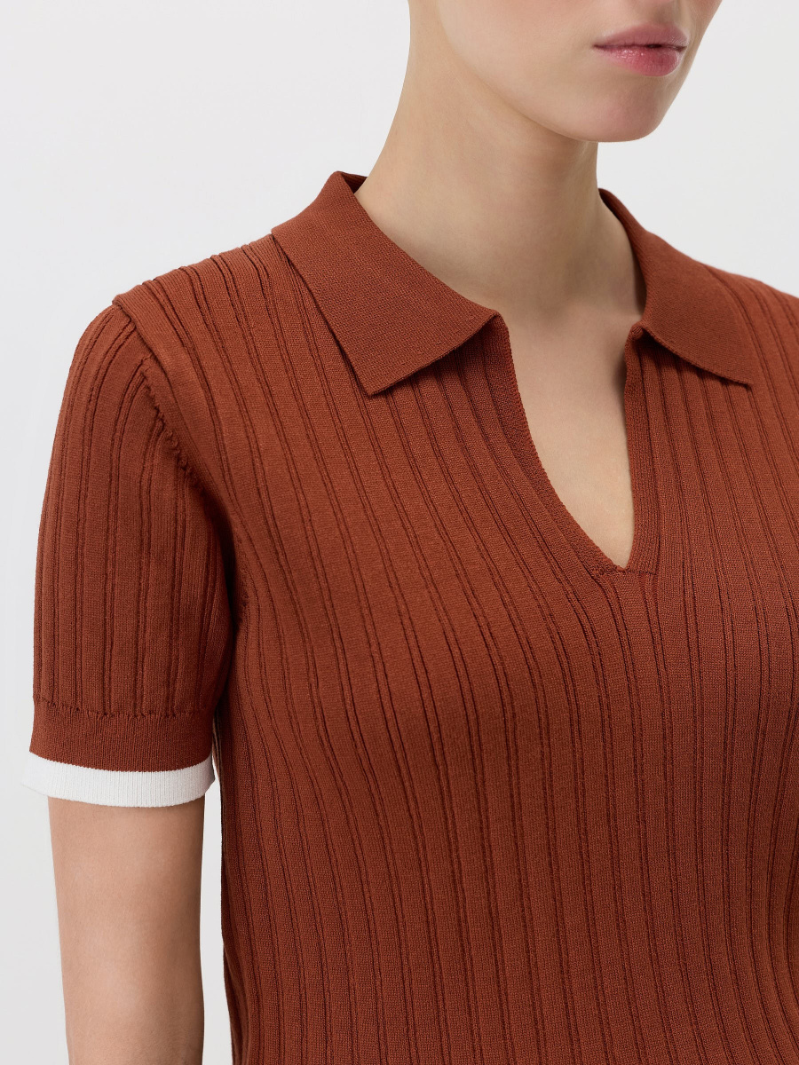 Прямой пуловер в стиле поло среднего облегания с коротким рукавом. Выполнен из эластичного “сухого” полотна на основе вискозы, усиленной нейлоном, поэтому не скатывается и сохраняет форму и цвет. Плотная вязка в широкий рубчик визуально вытягивает силуэт. Плечевые швы смещены на спинку для оптимальной посадки, а длина позволяет носить модель как заправленной, так и навыпуск.