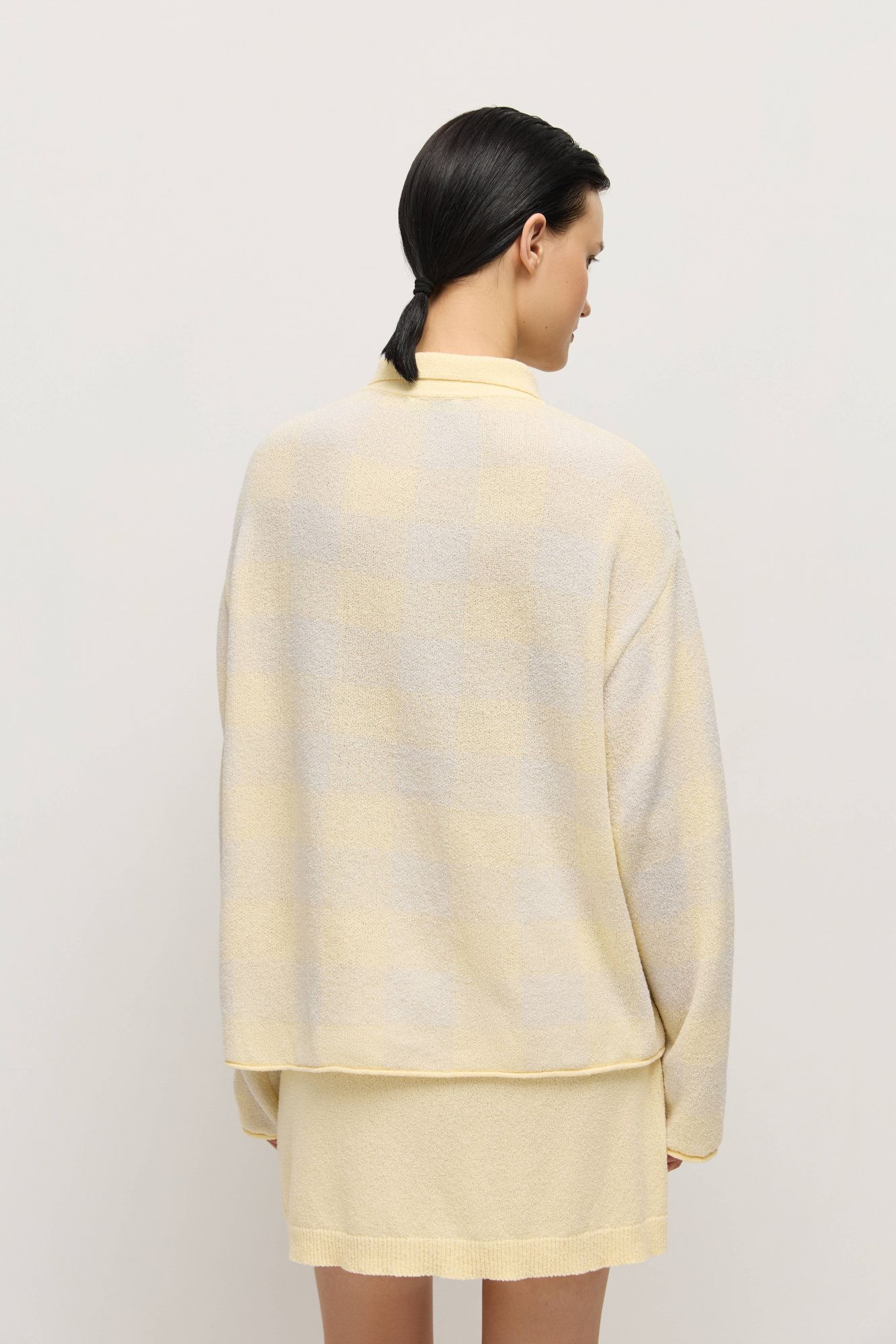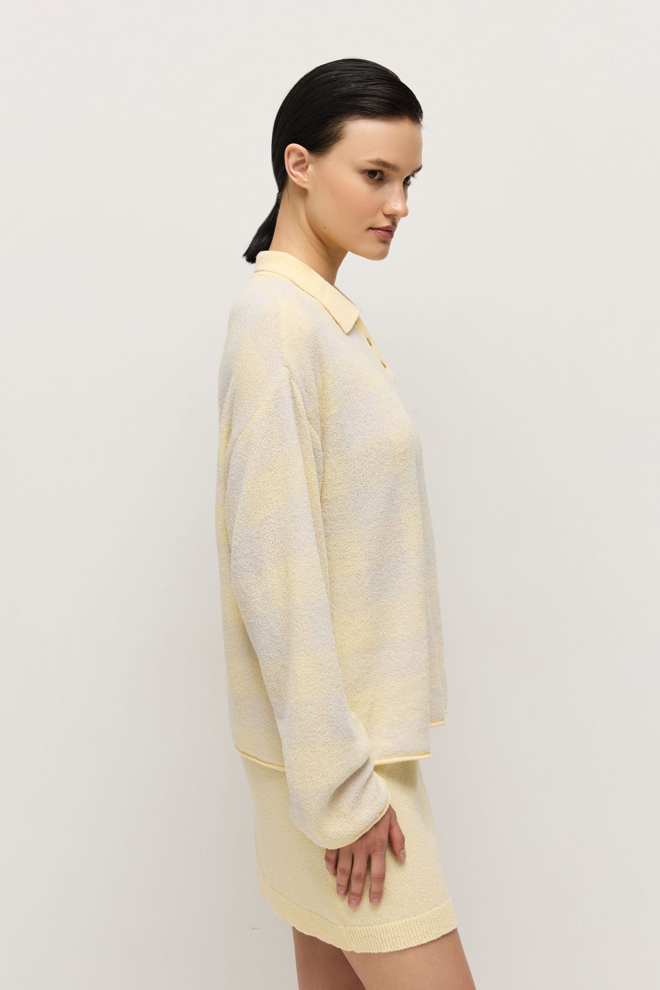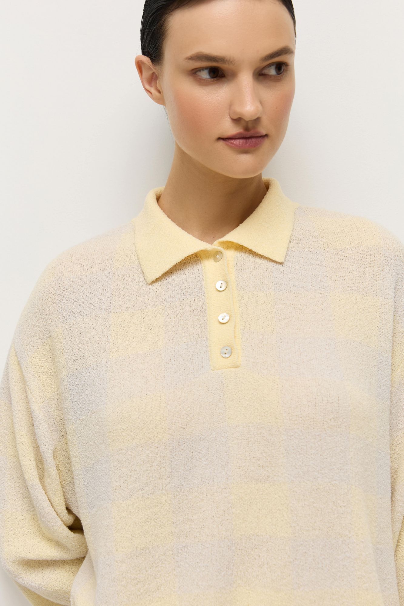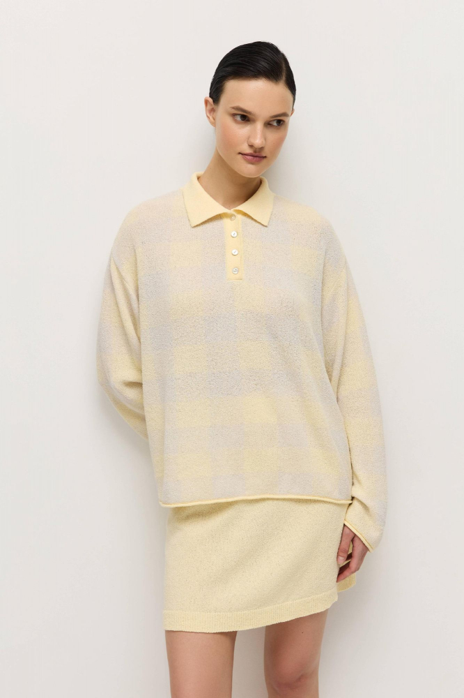 Поло прямого кроя связано из махровой пряжи — нежного и комфортного к коже материала.
