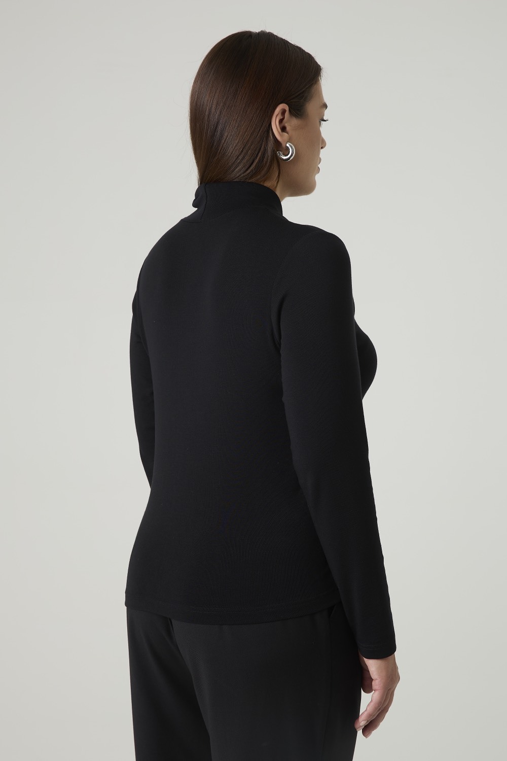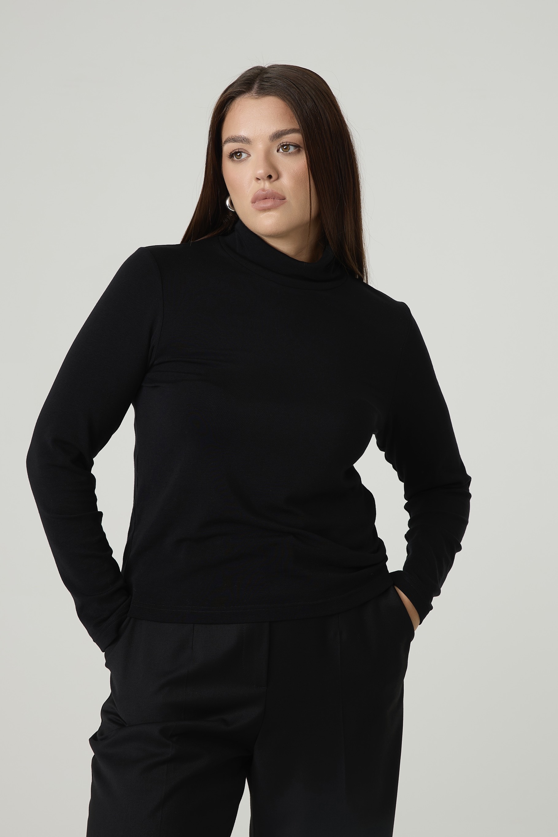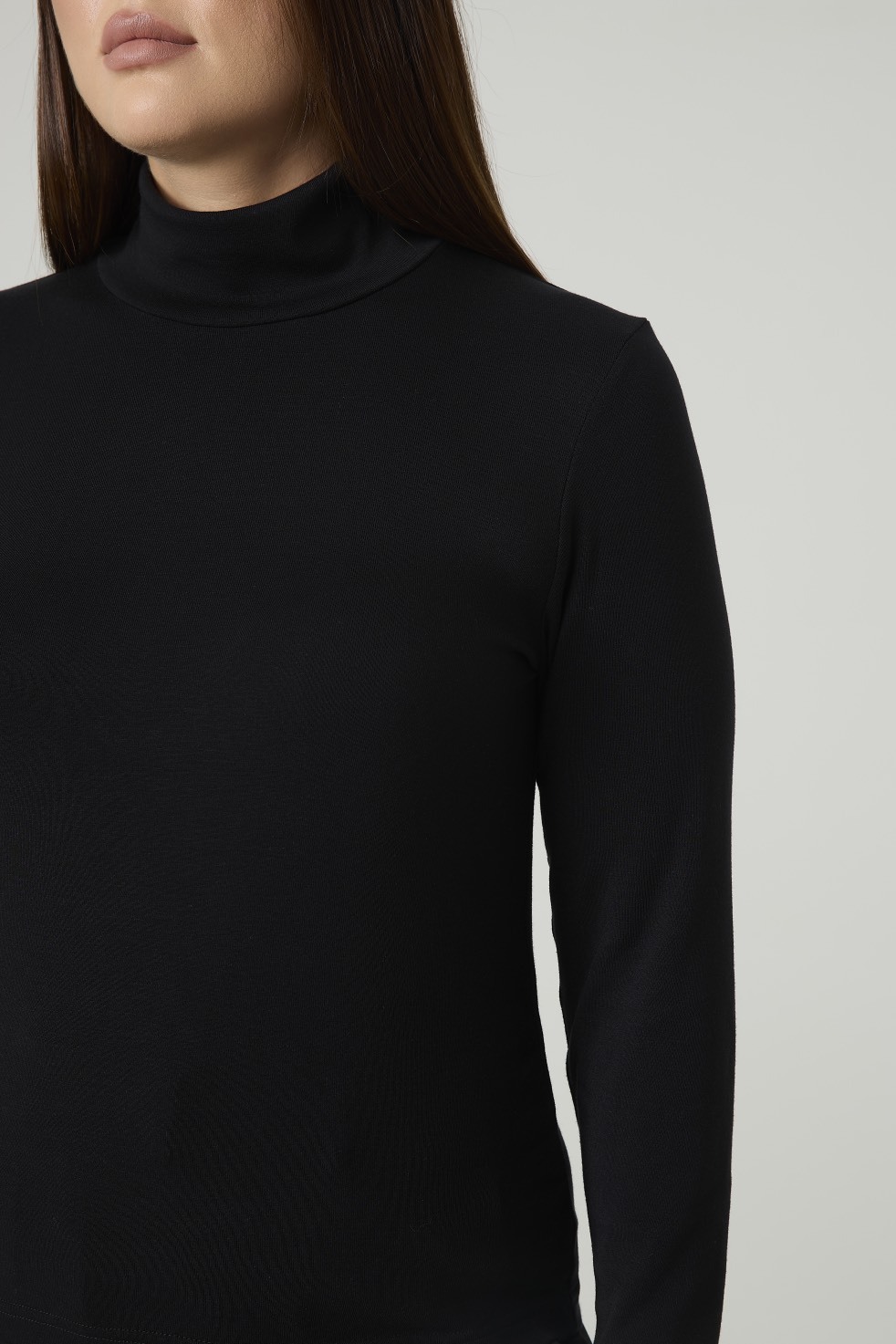 Базовая водолазка черного цвета выполнена из мягкого эластичного трикотажа средней плотности. Низ изделия прямой, длина стандартная, закрывает линию бедер.