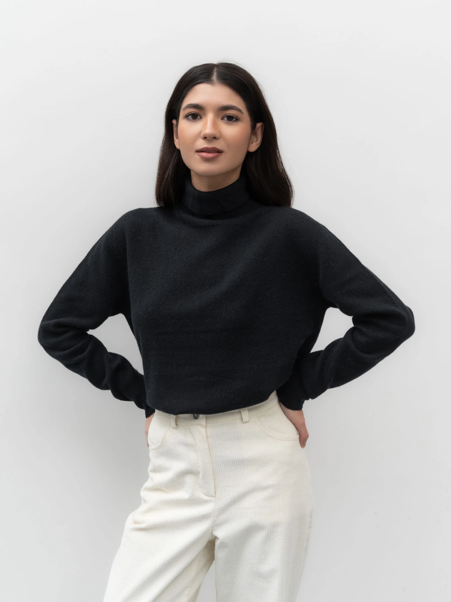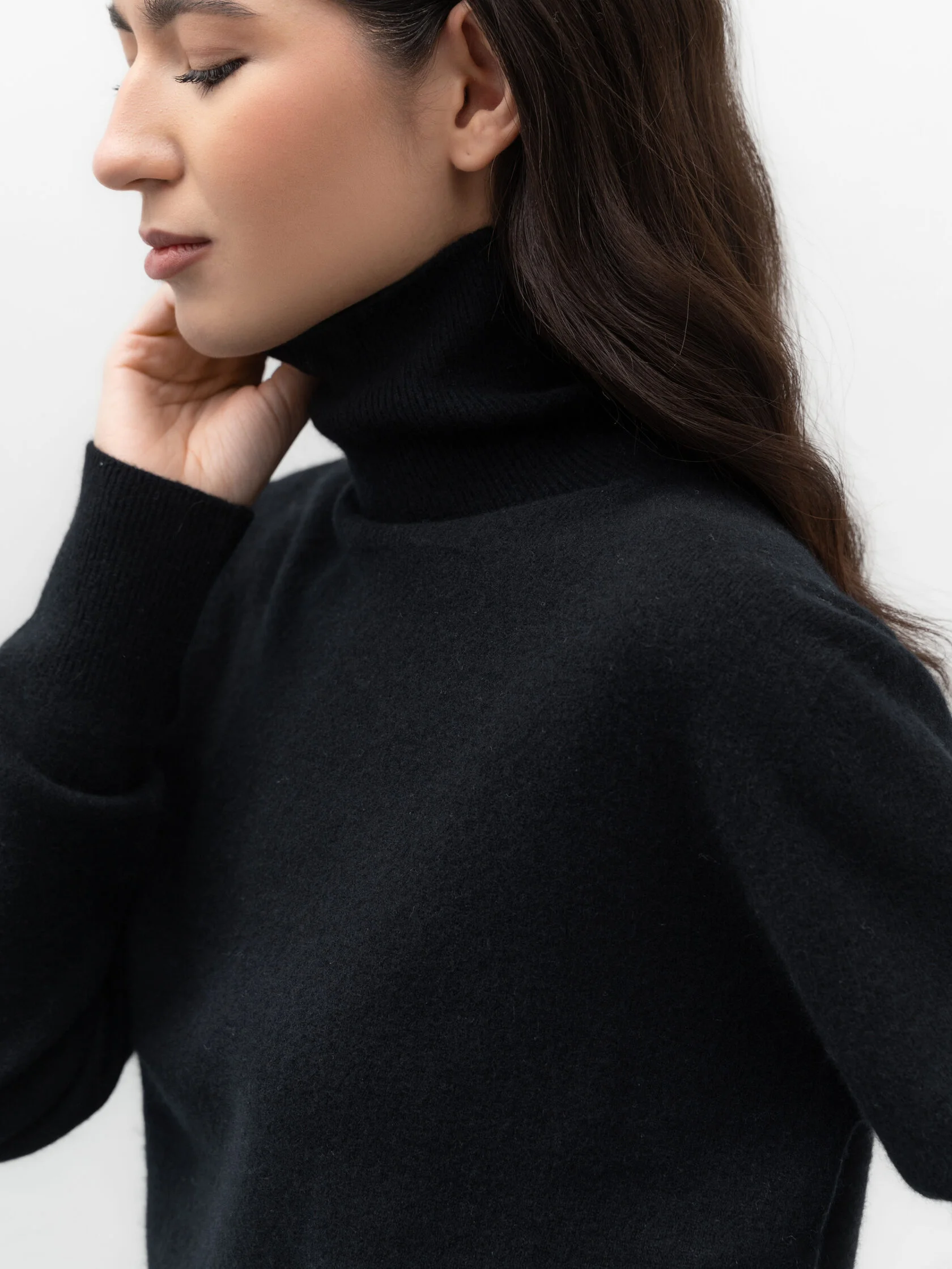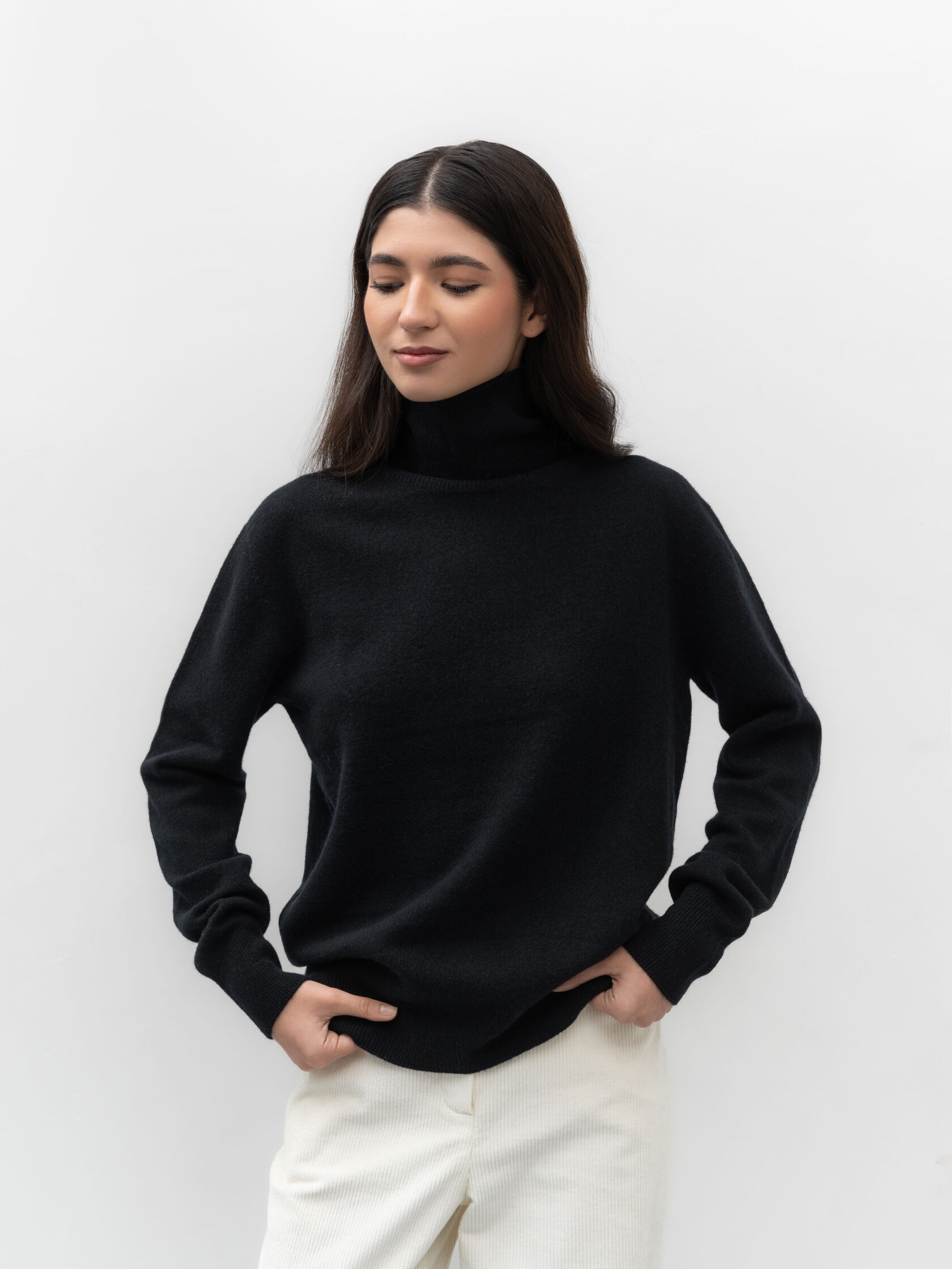 Черная водолазка из шерсти с кашемиром – классическая теплая база для зимних образов. Благородная ткань мягко согревает и комфортно садится по фигуре. Универсальный цвет позволяет носить водолазку как с брюками и юбками, так и под пиджак или пальто.