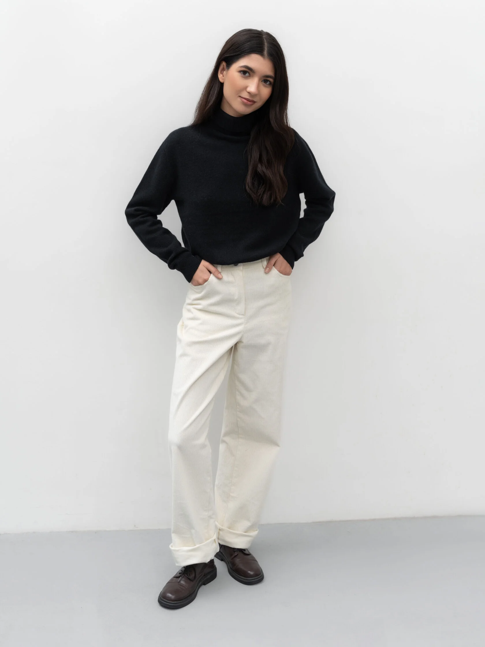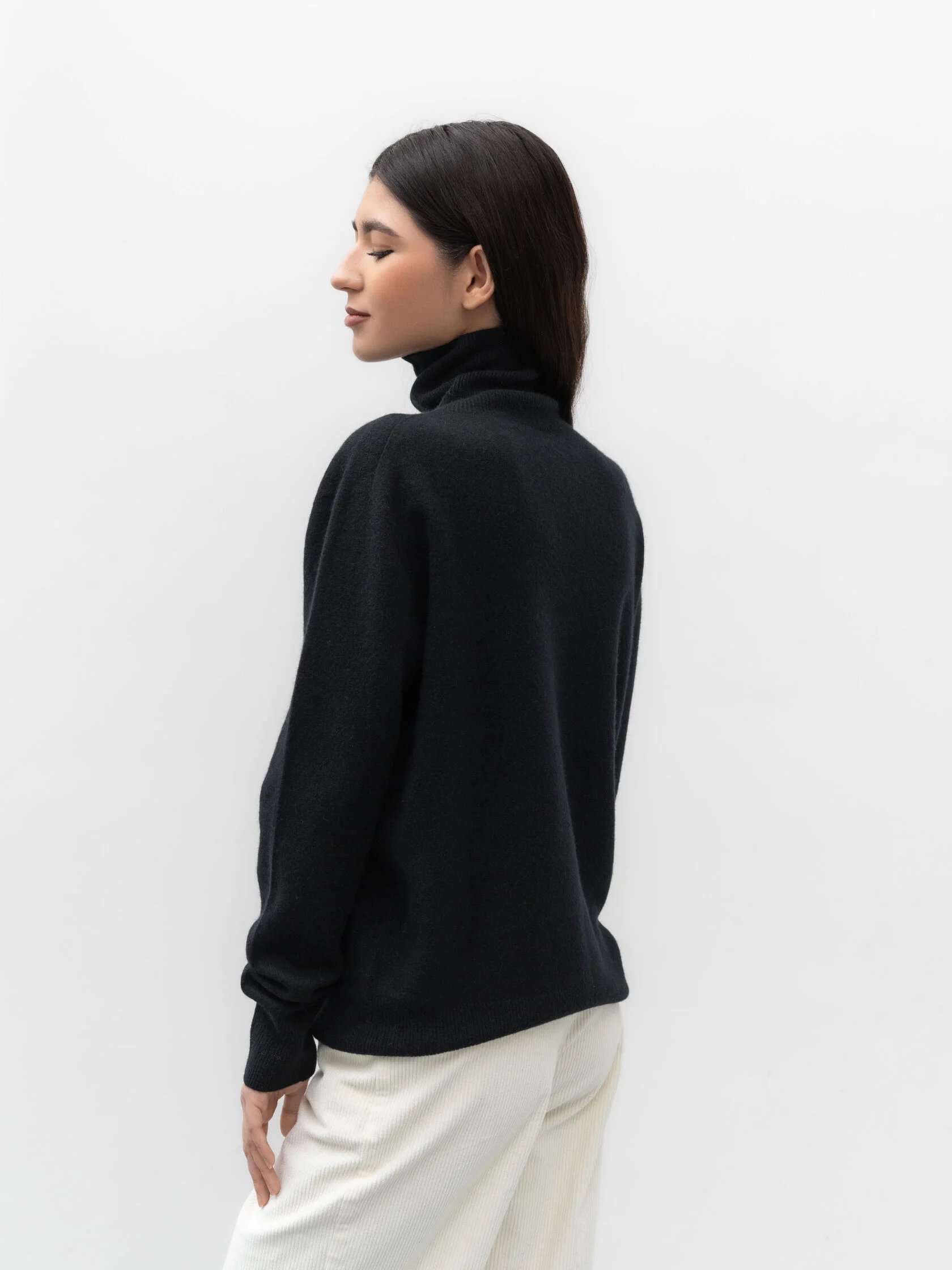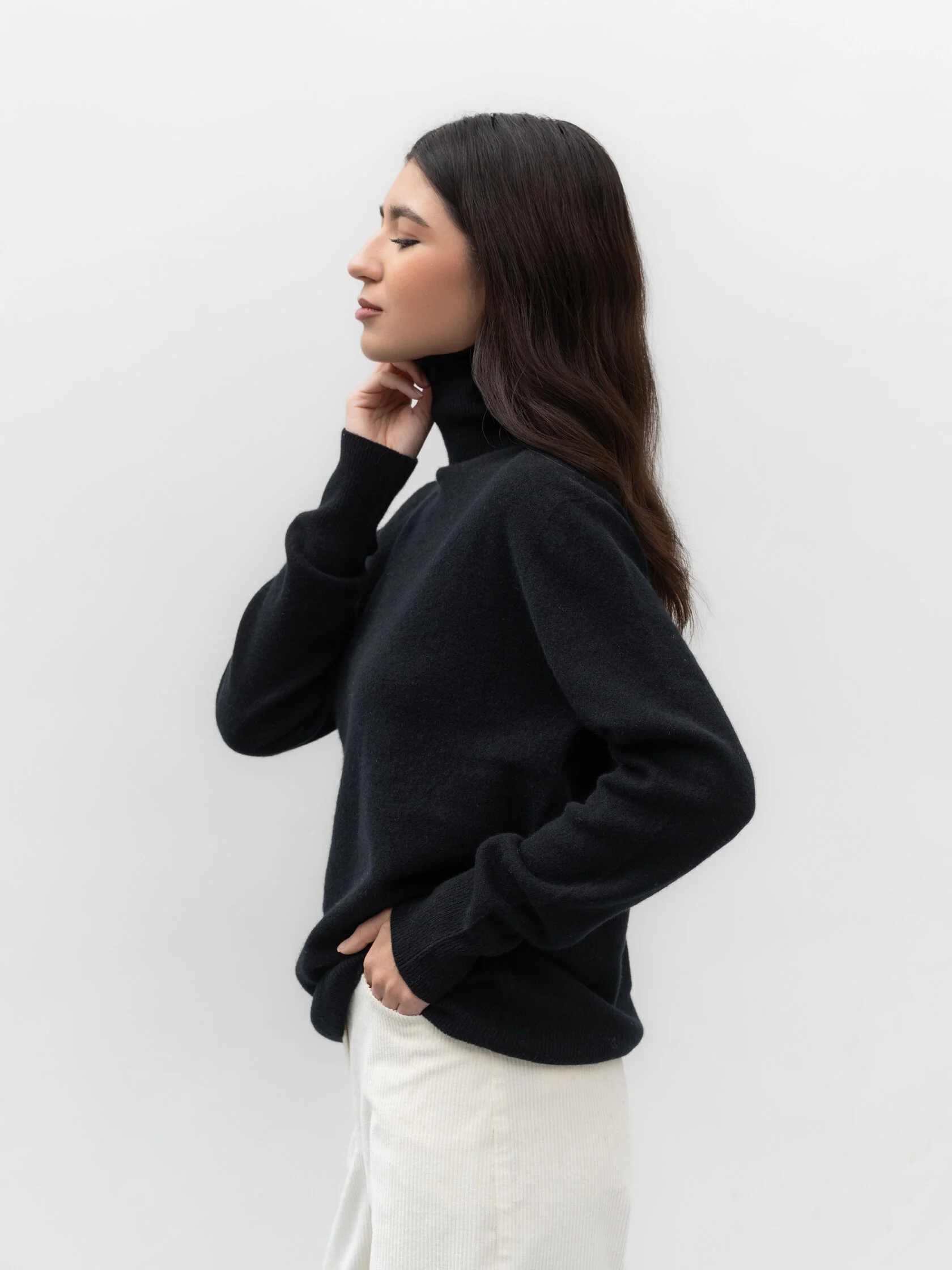 Черная водолазка из шерсти с кашемиром – классическая теплая база для зимних образов. Благородная ткань мягко согревает и комфортно садится по фигуре. Универсальный цвет позволяет носить водолазку как с брюками и юбками, так и под пиджак или пальто.