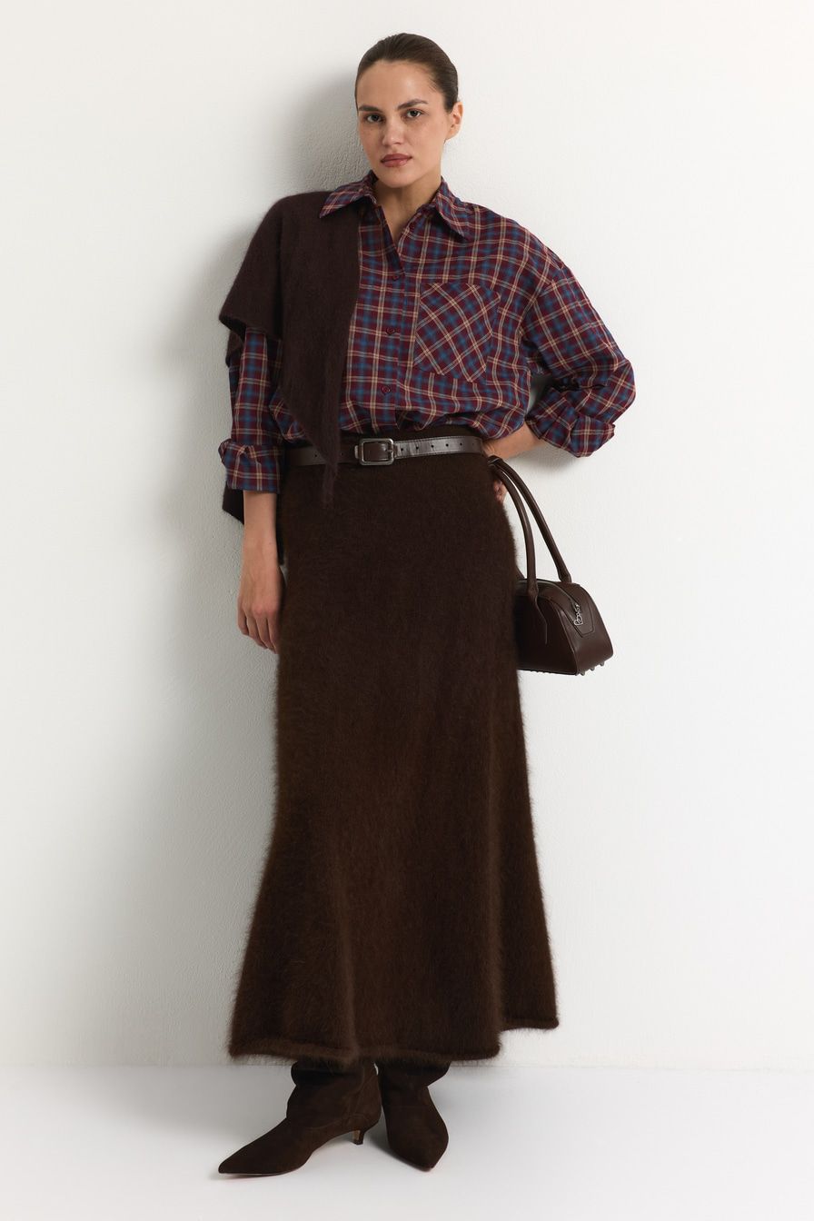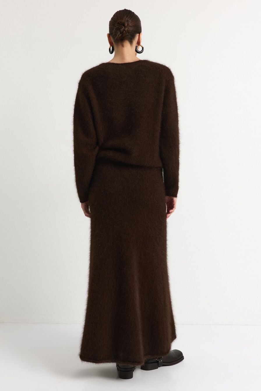 Пушистая юбка-макси коричневого цвета выполнена из смесовой ангорской шерсти.