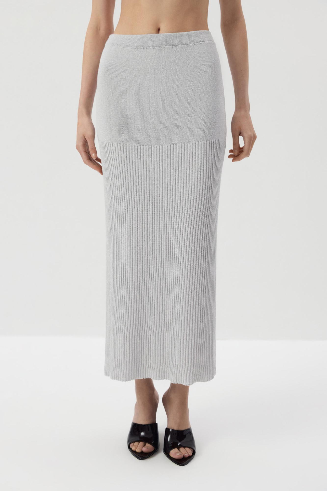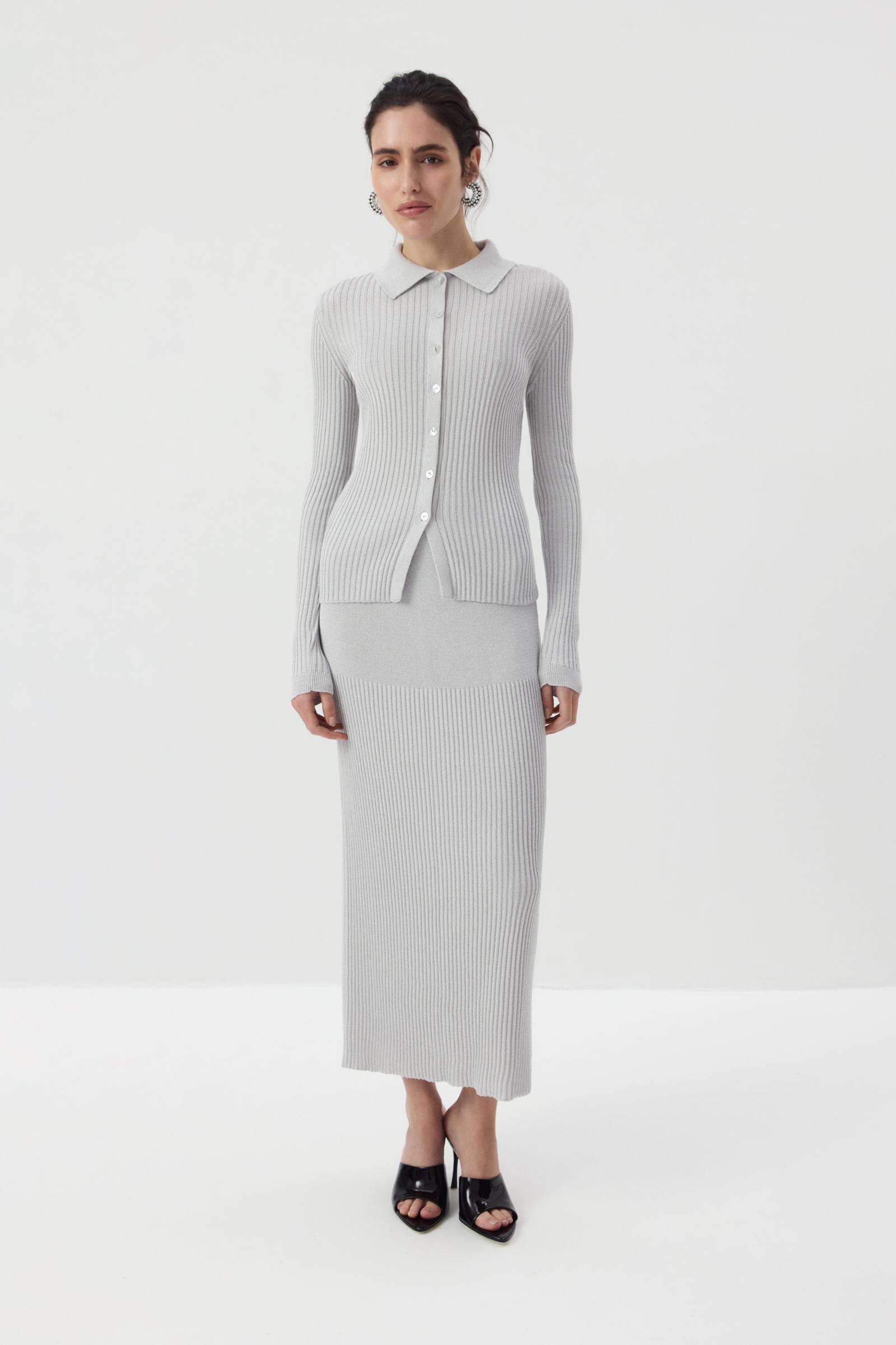 Вязаная юбка прямого кроя в длине макси. Силуэт модели красиво струится по линии бедер и удобен в носке. А рибовое переплетение и люрексная нить в пряже добавляет праздничного настроения. Верх юбки выполнен в нежном переплетении и переходит в более крупный рапорт, что создает игру фактур в изделии.