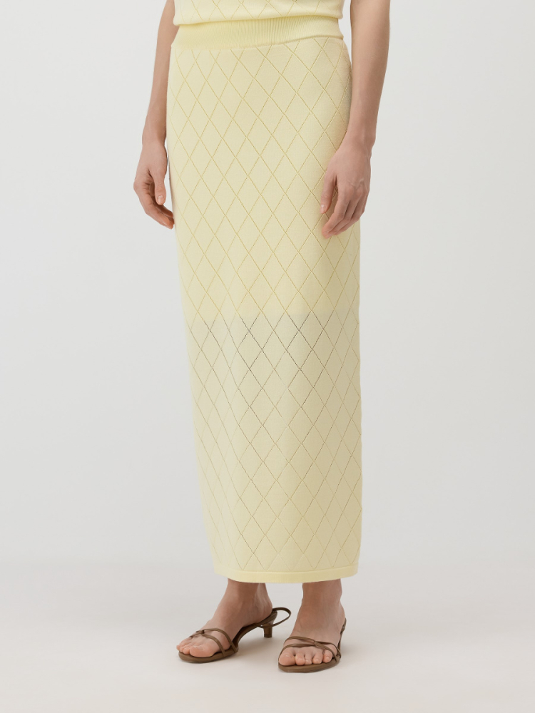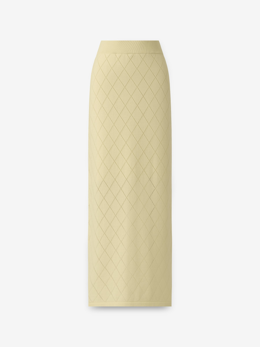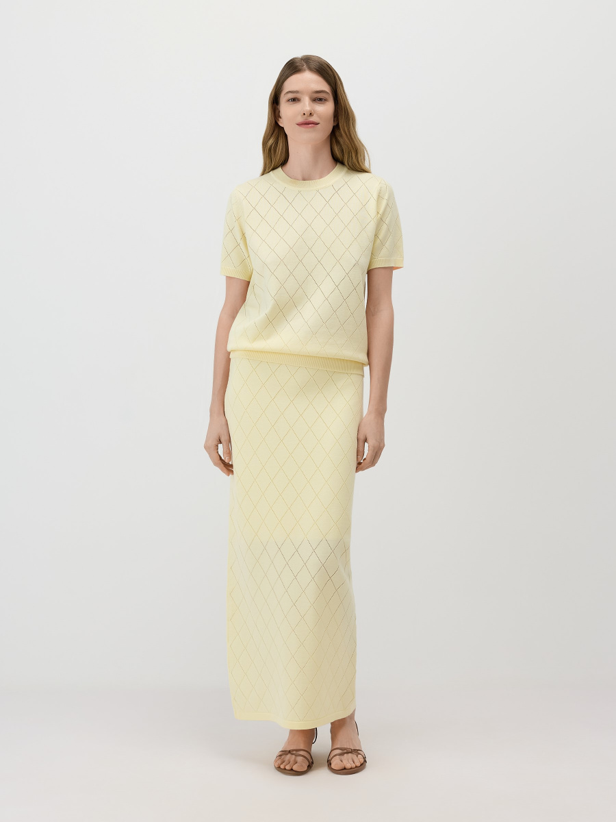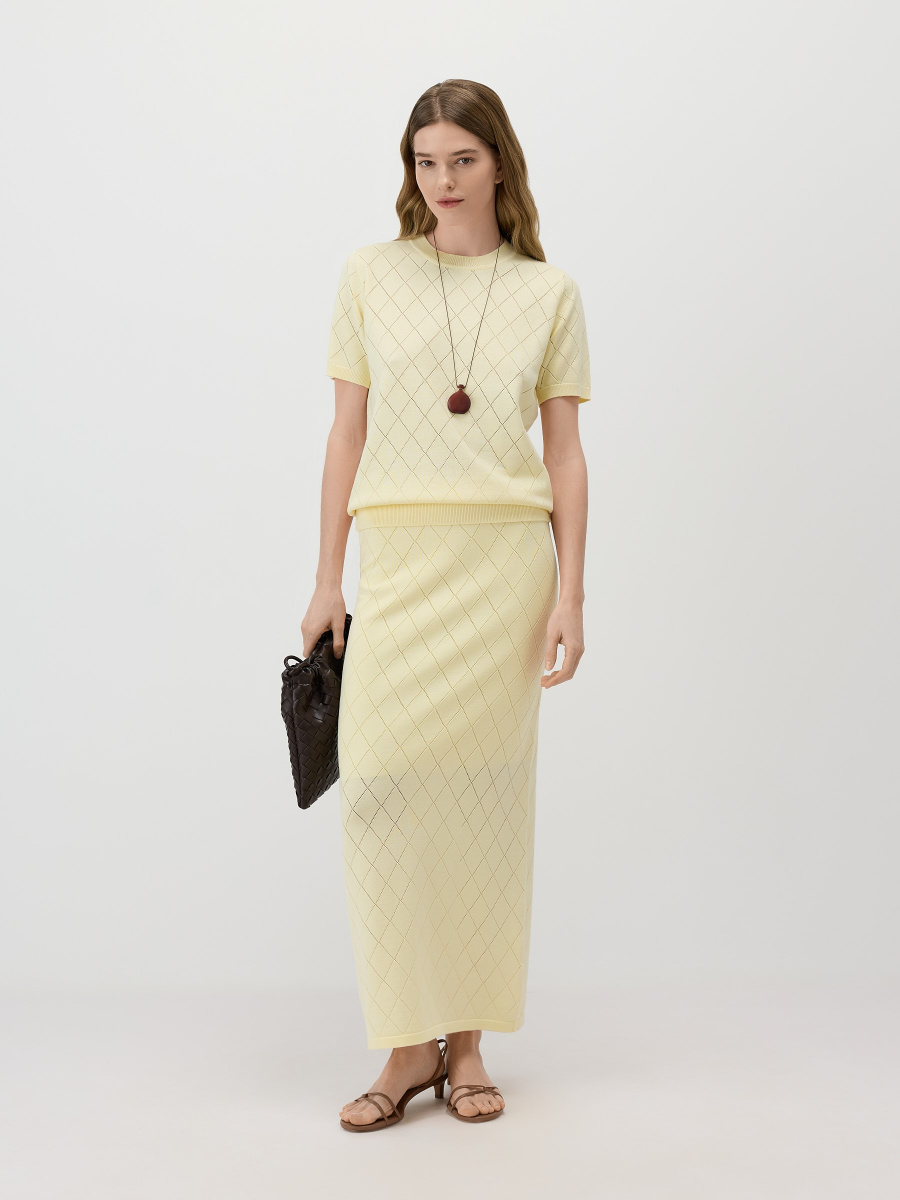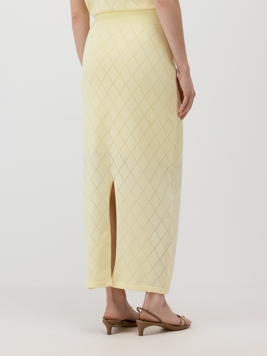 Прямая юбка макси подчеркнуто вытянутого силуэта. Модель выполнена из ажурного полотна с ромбовидным рисунком, дополнена эластичным поясом, вязаной подкладкой чуть выше колен и разрезом по спинке для свободного шага. Легкое полотно из 100% вискозы драпируется естественными складками, пропускает воздух, сохраняет исходную форму и насыщенность оттенка.