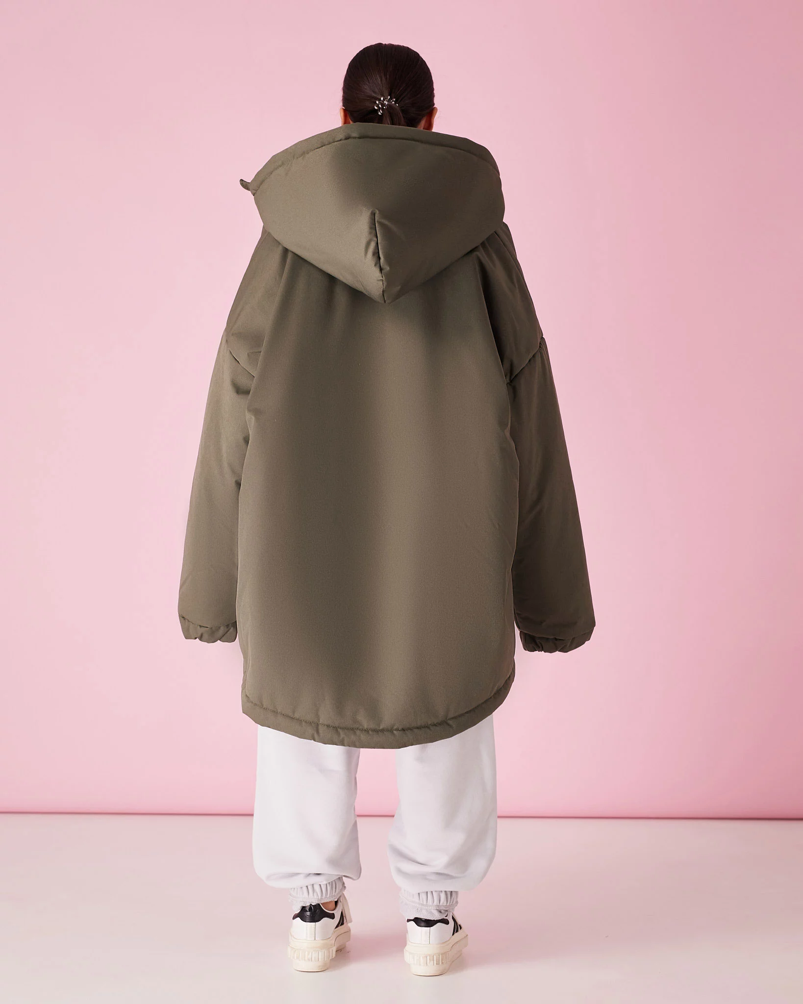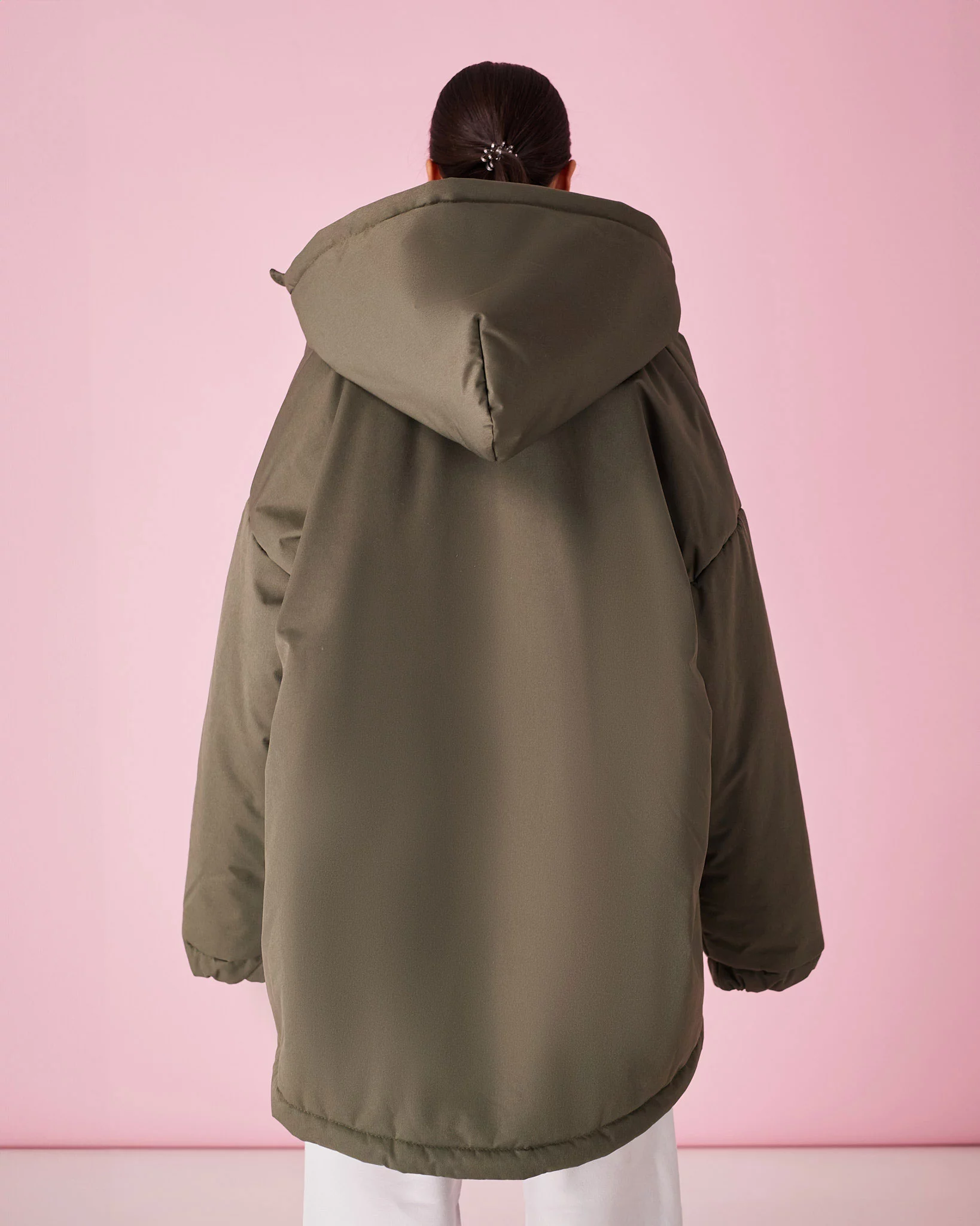 По низу изделия резинка, которая дает возможность стягивать низ или же, наоборот, носить его свободным.