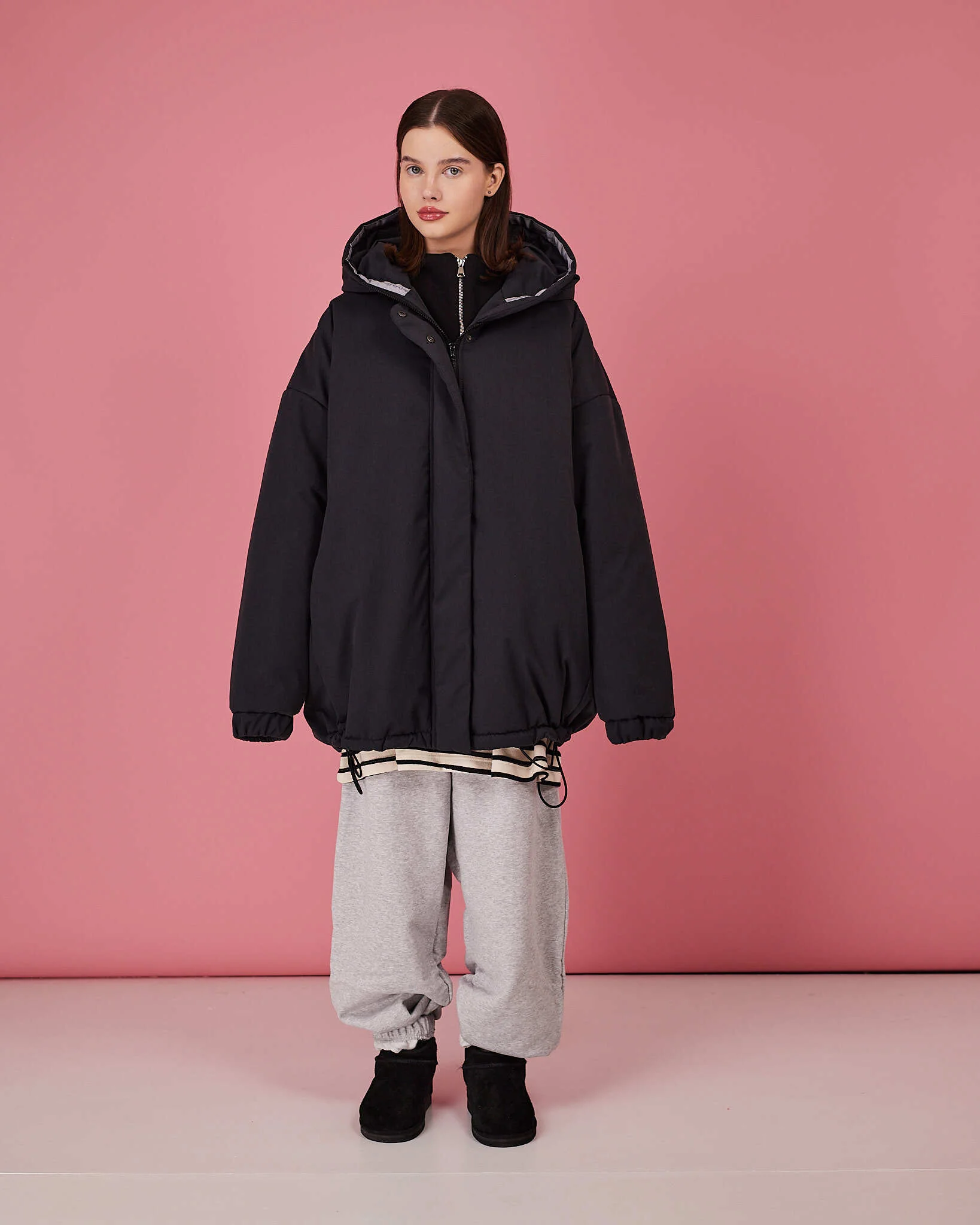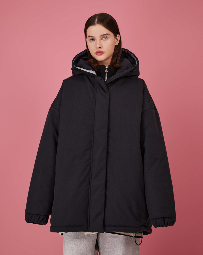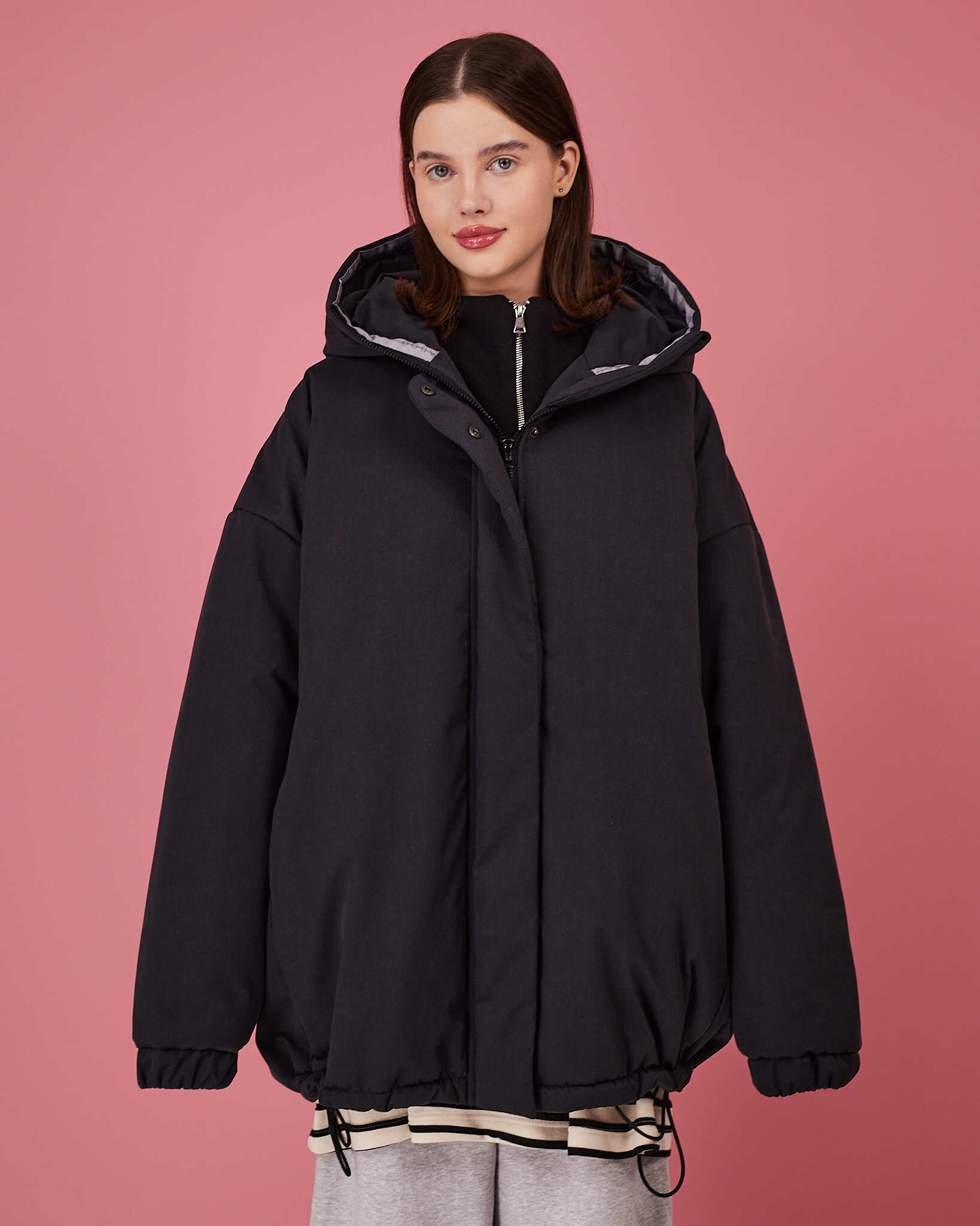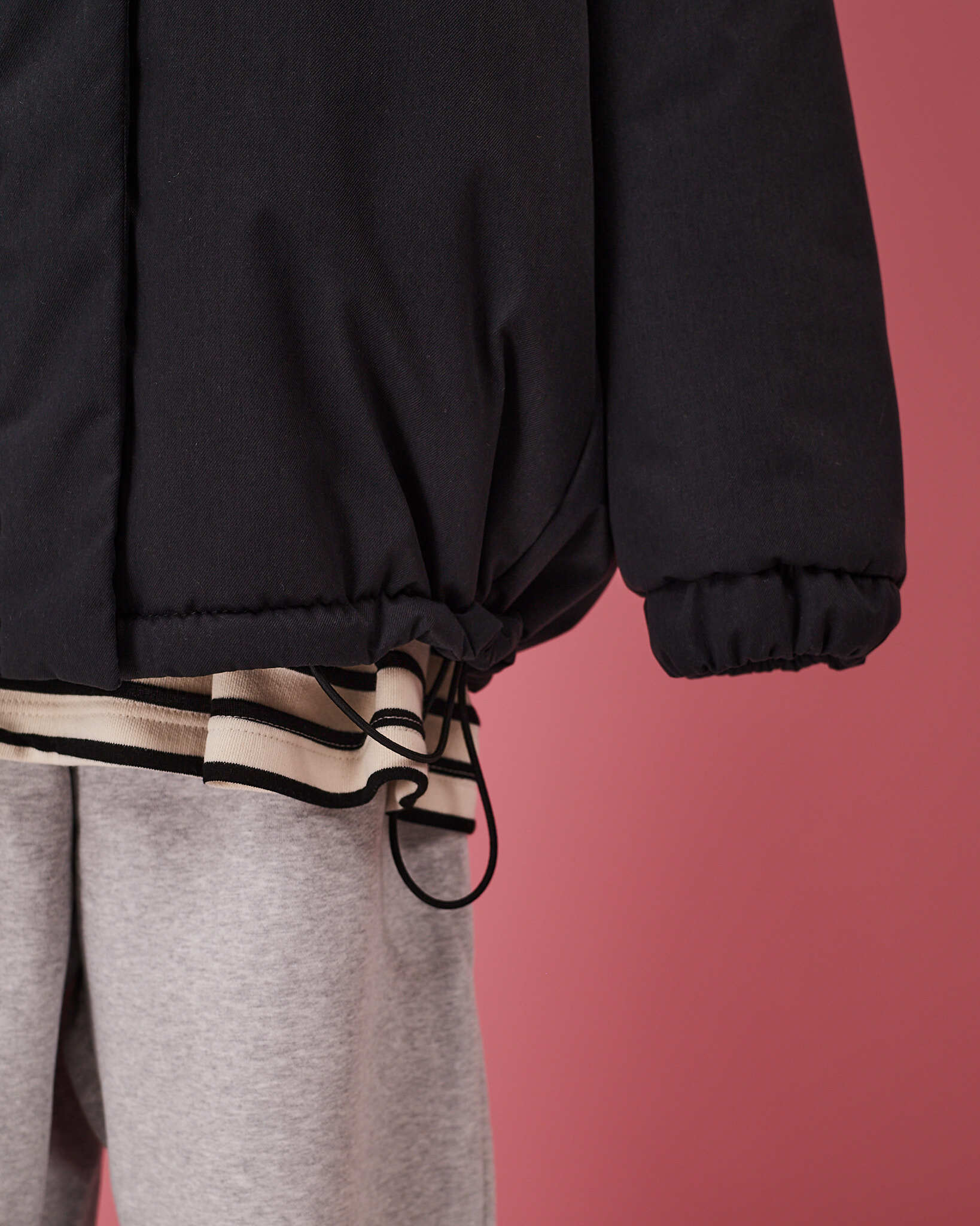По низу изделия резинка, которая дает возможность стягивать низ или же, наоборот, носить его свободным.