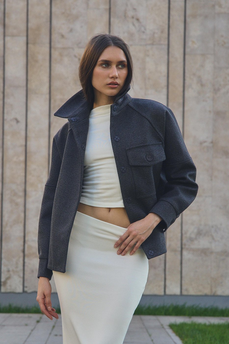 Стильный и универсальный с позиции интеграции бомбер выполнен из пальтовой ткани. Модель на подкладе с аккуратным отложным воротником, который можно носить, слегка приподняв в стойку. Бомбер дополнен крупным накладным карманом, манжетами, фиксируется на ряд пуговиц. Рекомендуем стилизовать с платьями, юбками, денимом, вязаным трикотажем, а также с изделиями костюмной группы, брюками из эко-кожи.