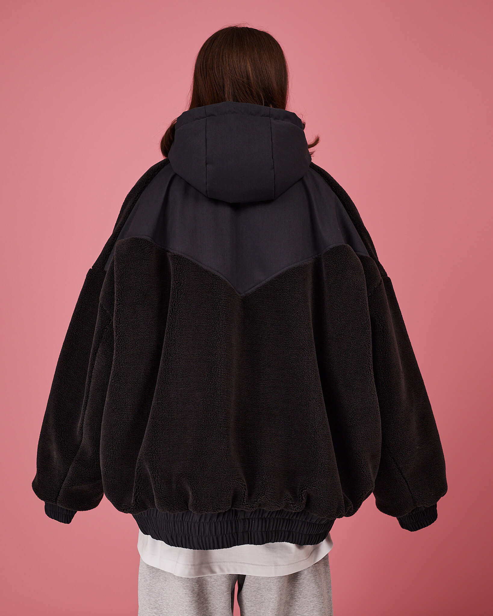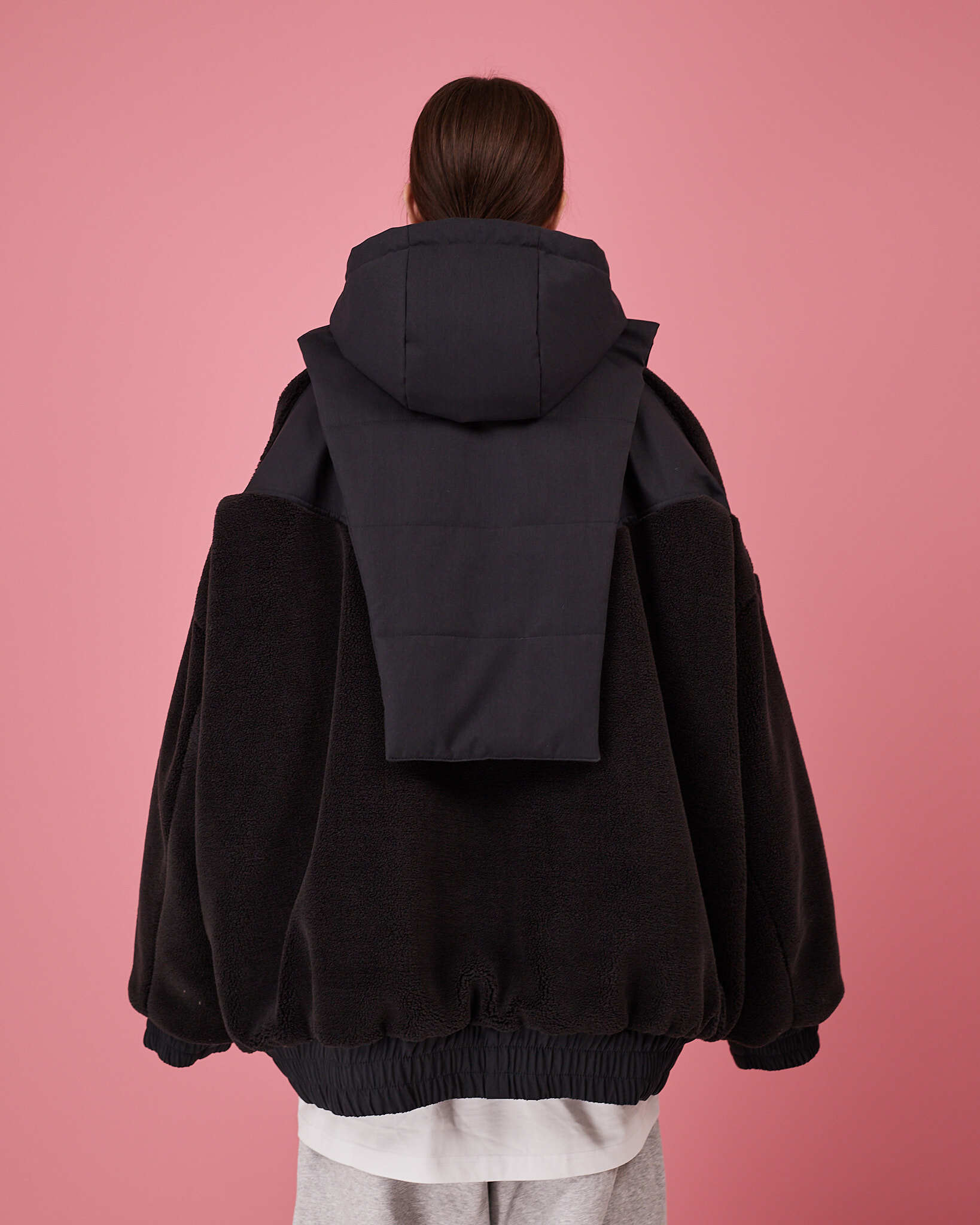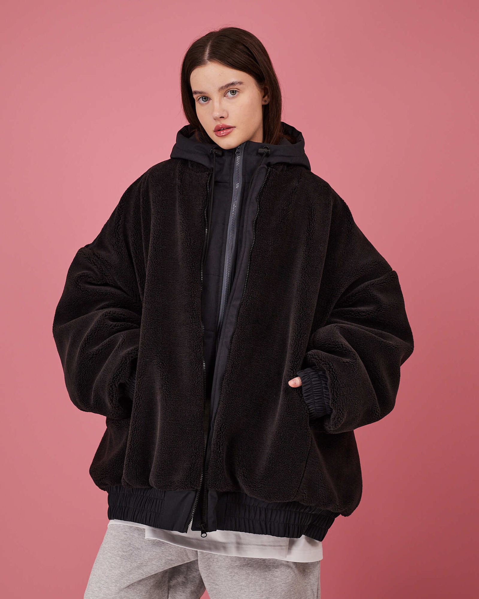 Основная часть бомбера выполнена из шерпы, манжеты, низ и спинка изделия выполнены из плащевой водоотталкивающей ткани. Утеплитель альполюкс 100.