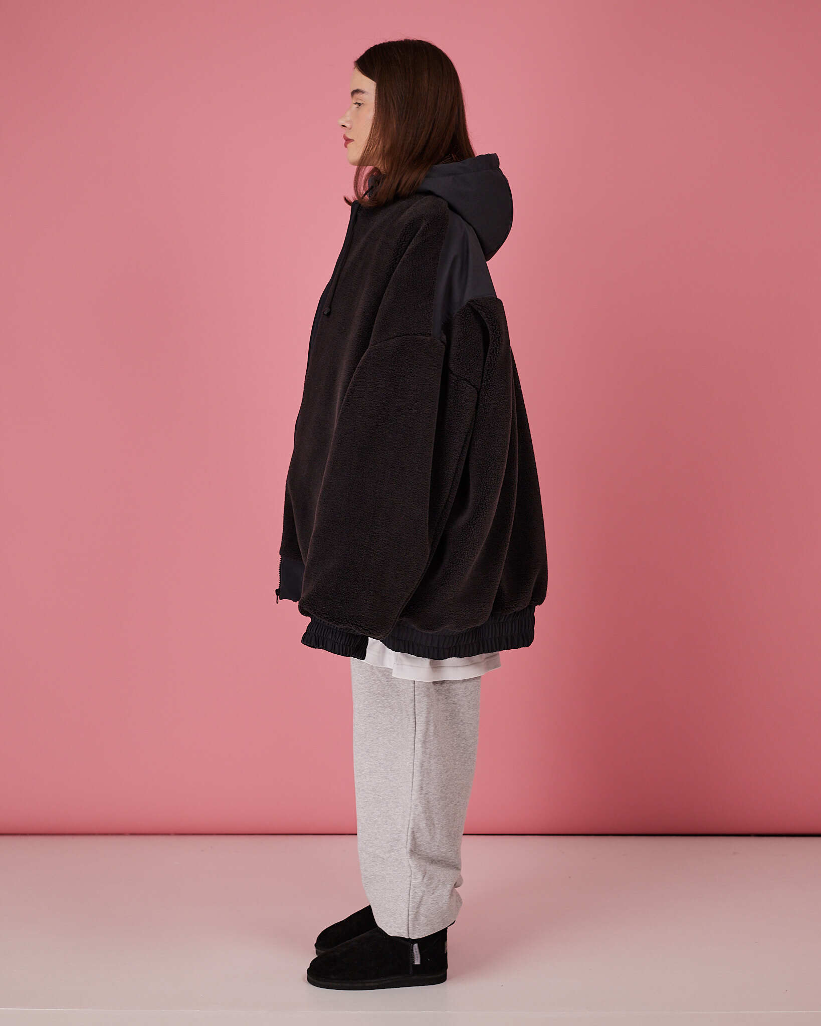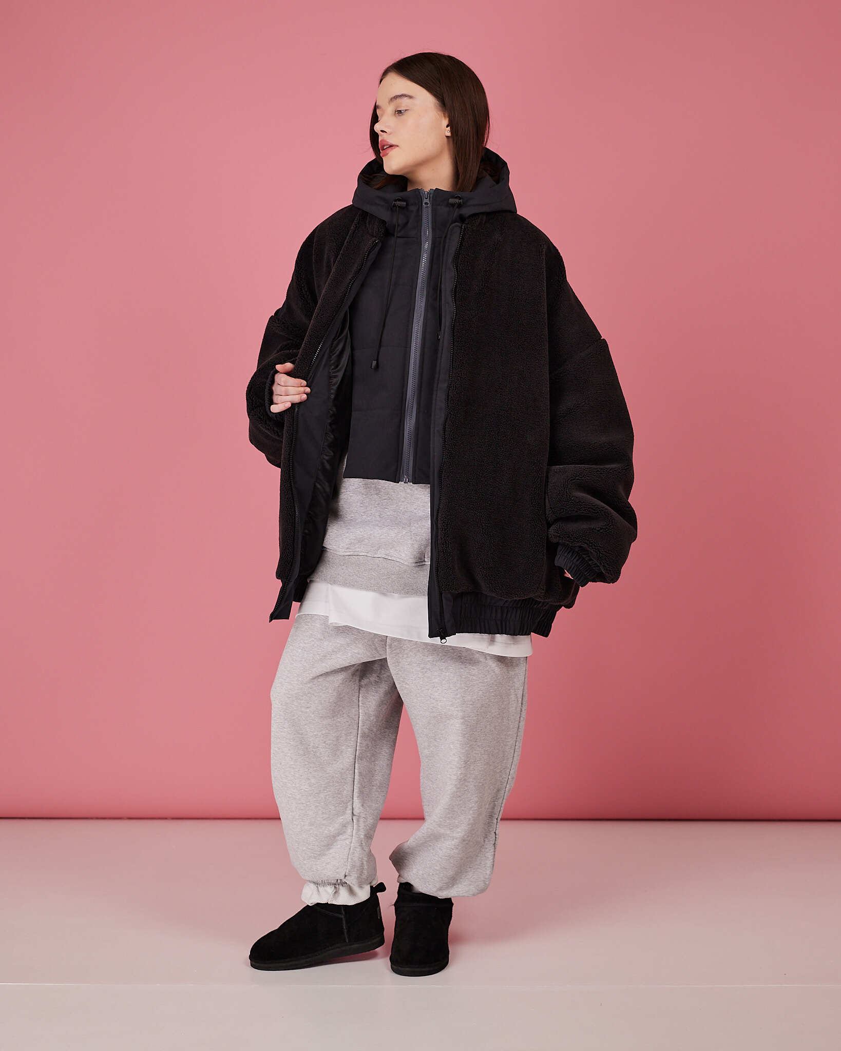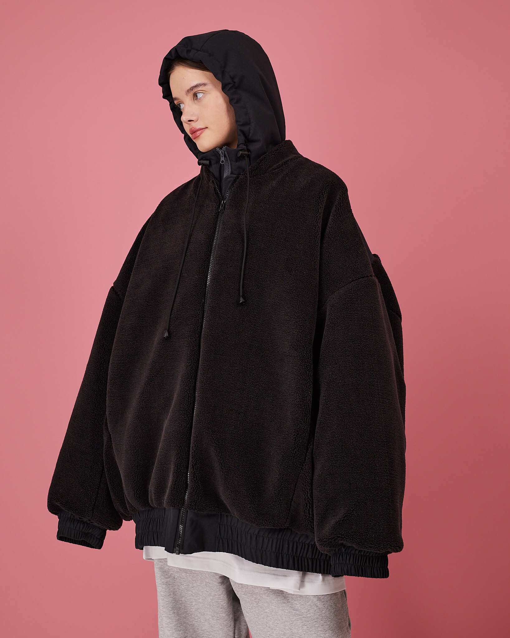 Основная часть бомбера выполнена из шерпы, манжеты, низ и спинка изделия выполнены из плащевой водоотталкивающей ткани. Утеплитель альполюкс 100.