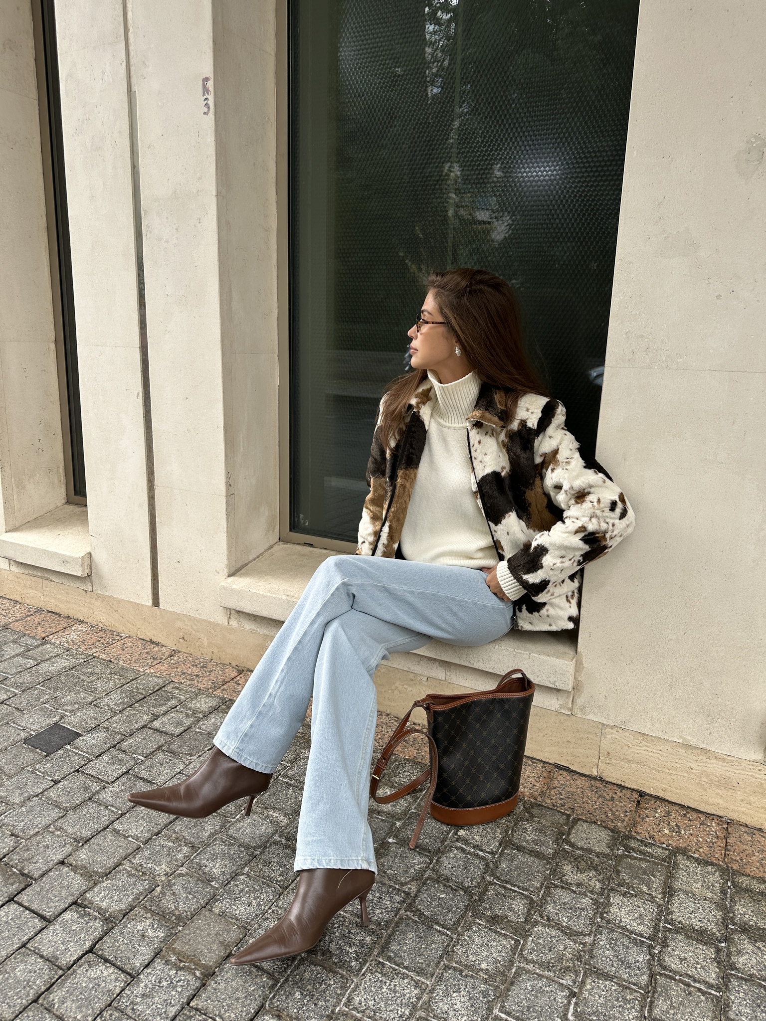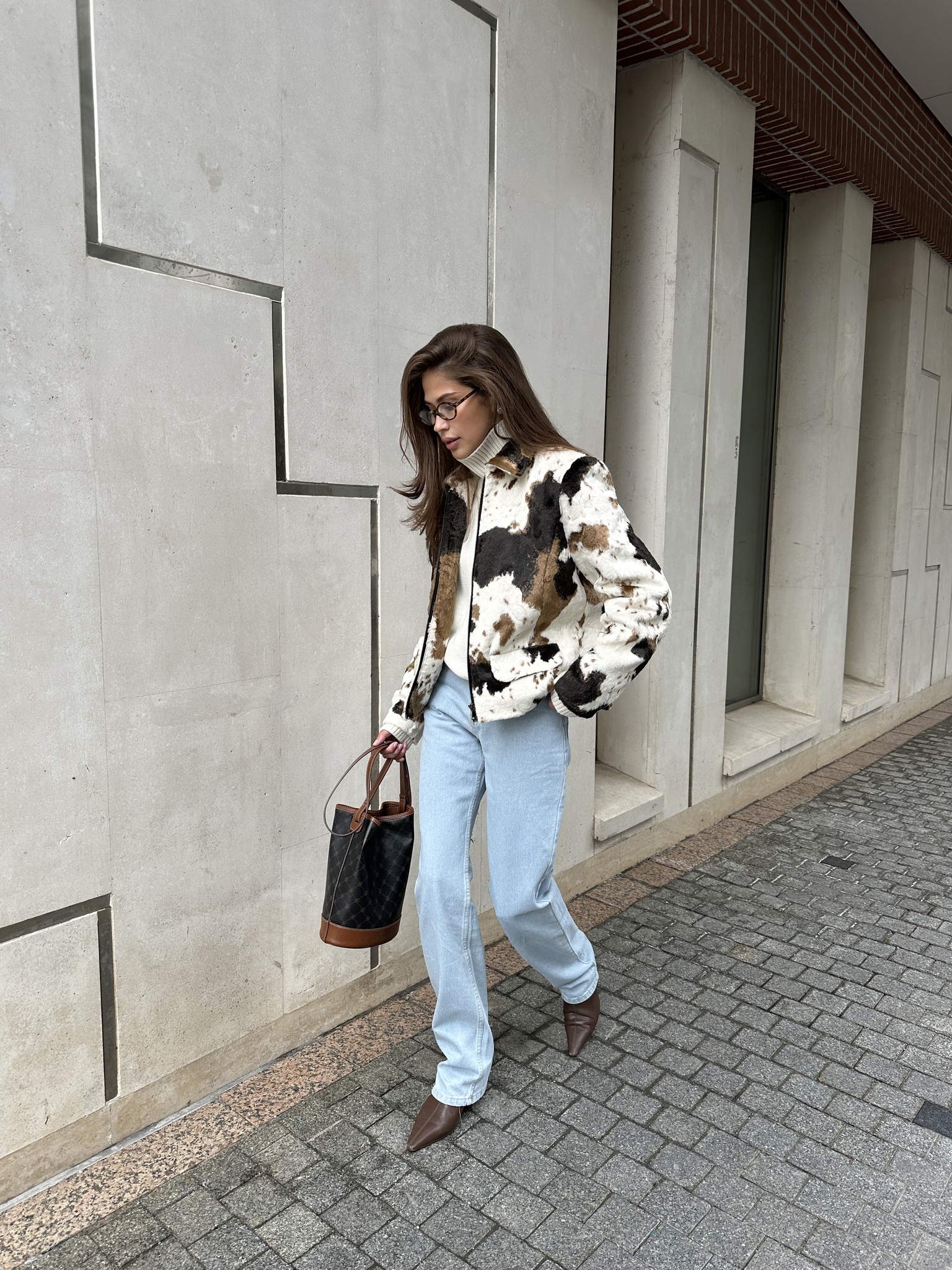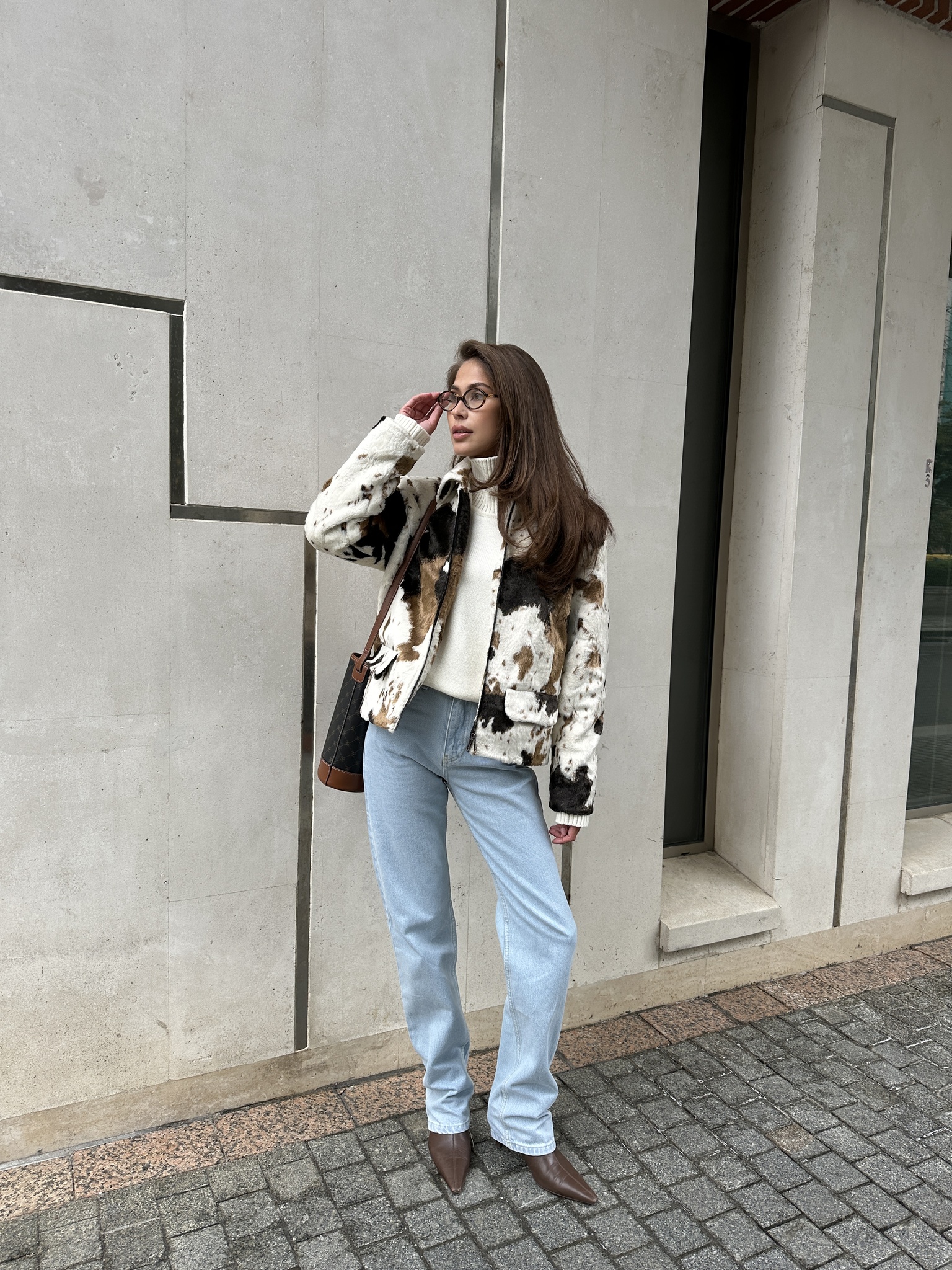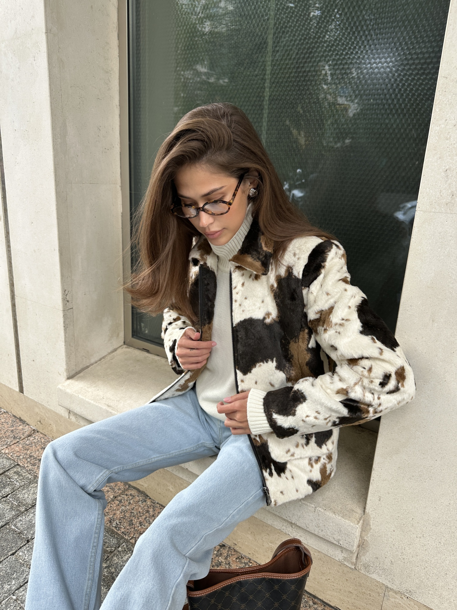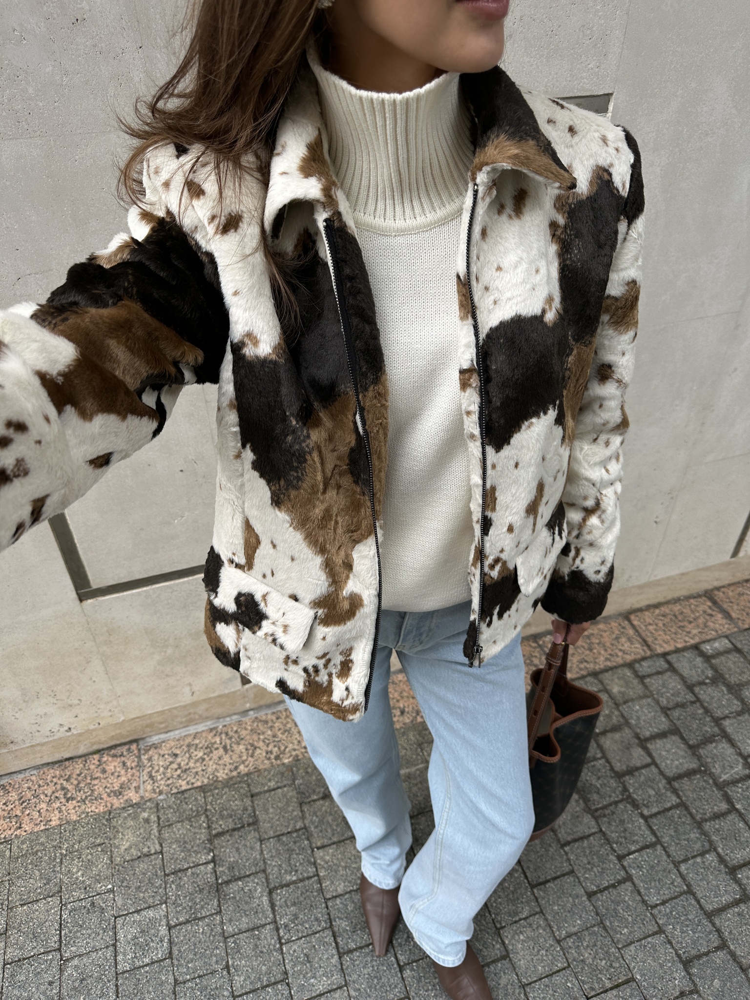 Бомбер прямого кроя с коровьим принтом из искусственного меха.