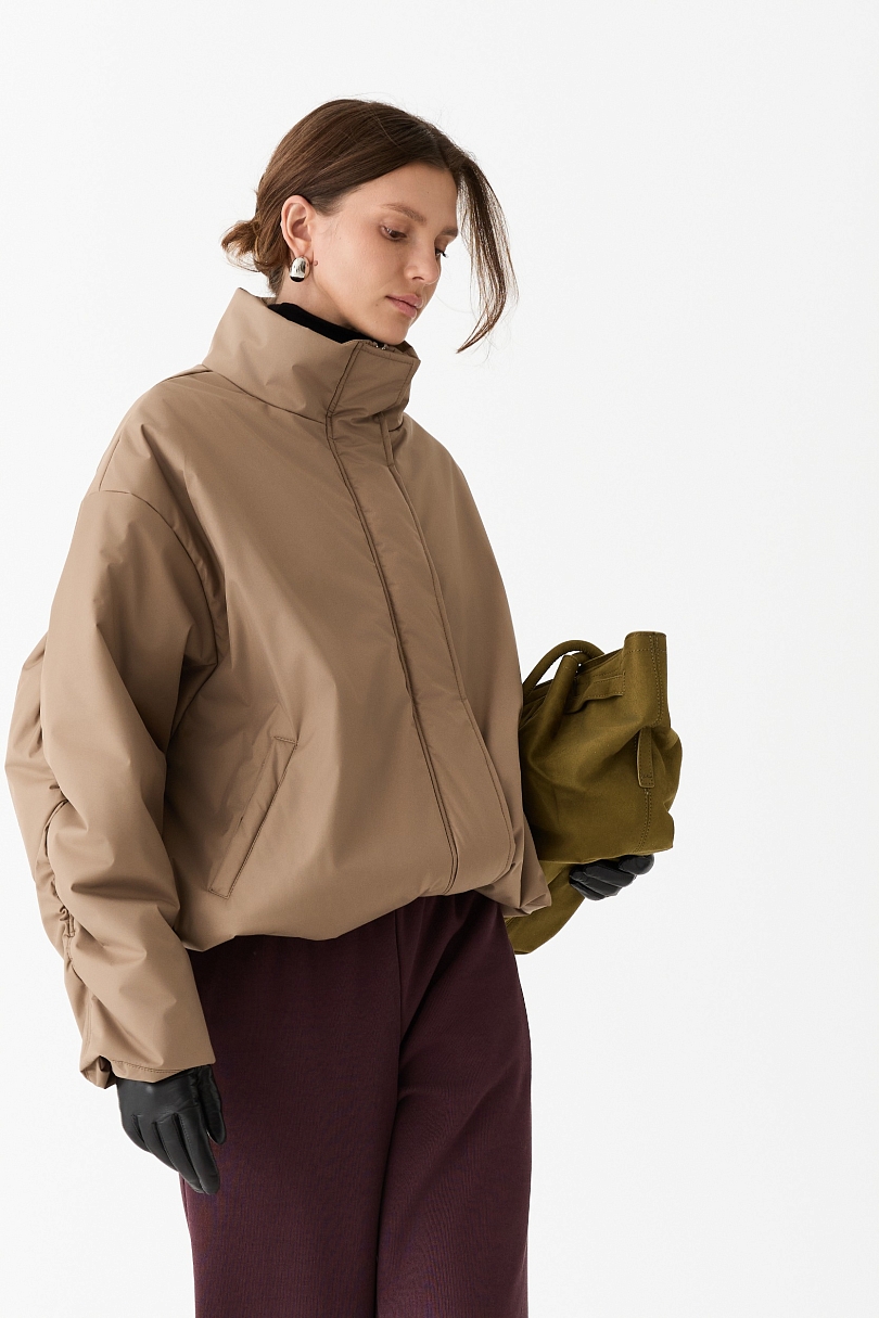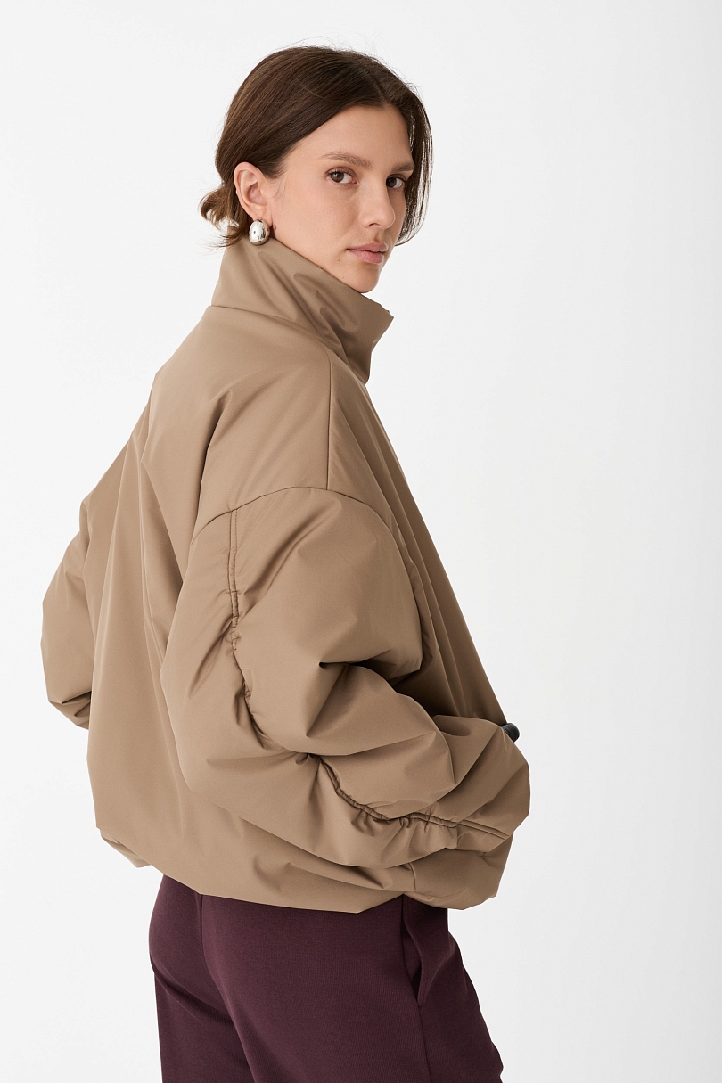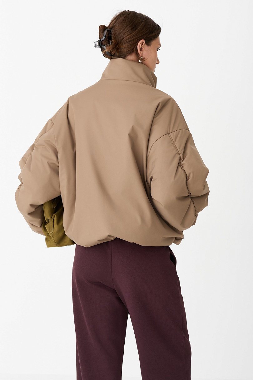 Утеплённый бомбер в светло-коричневом оттенке — стильная и удобная базовая верхняя одежда. Сборки по рукаву придают модели особый шарм.