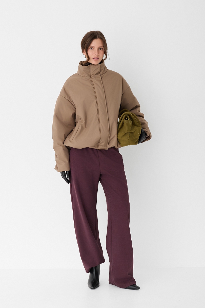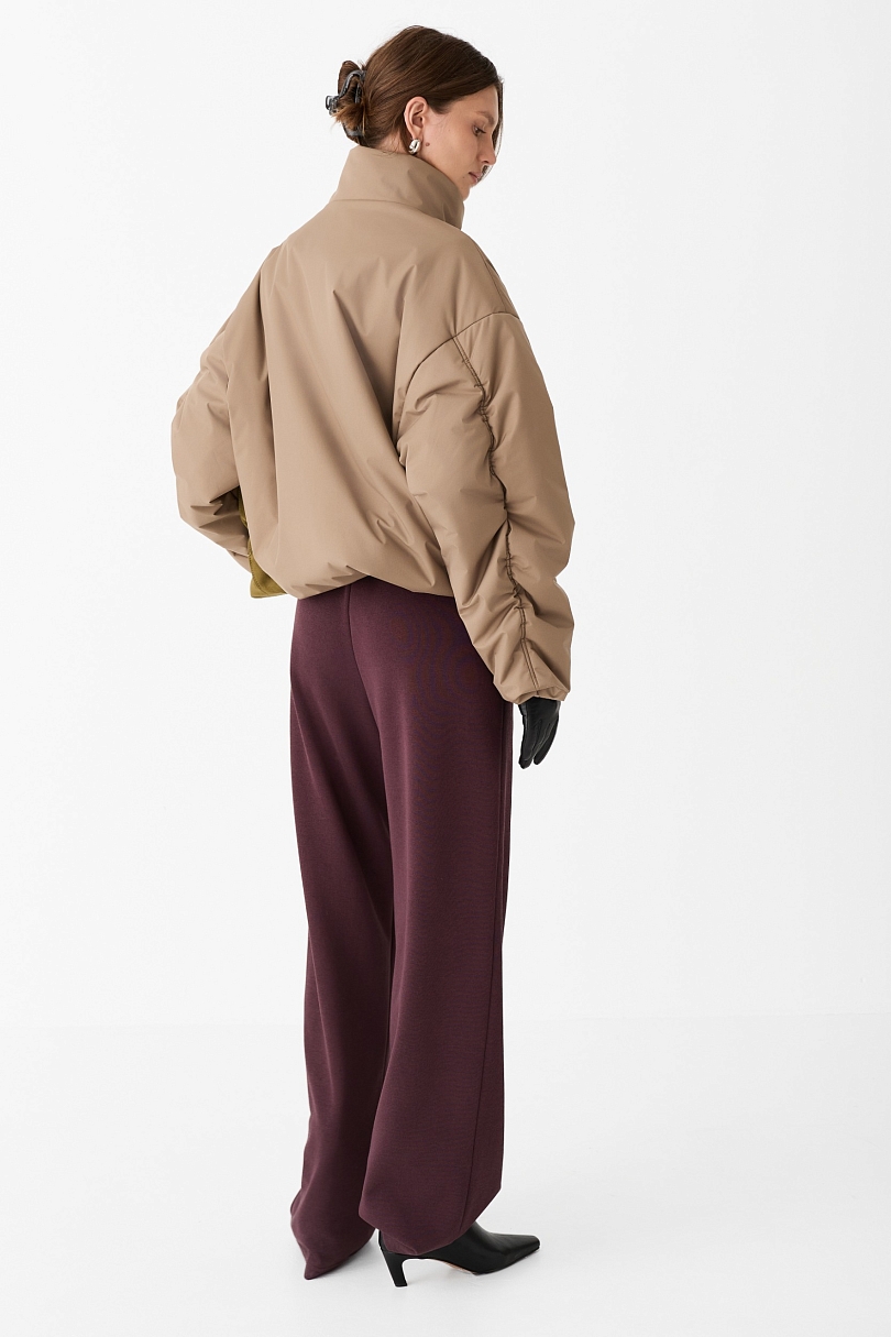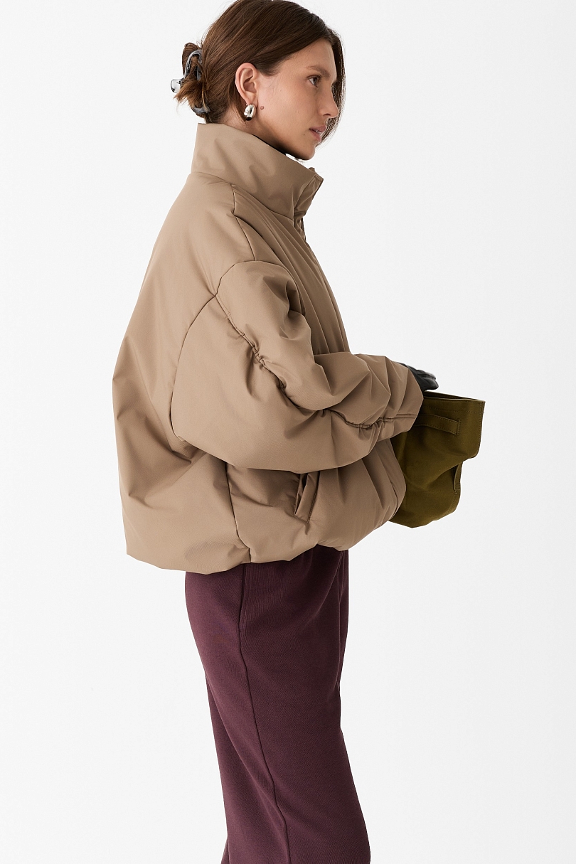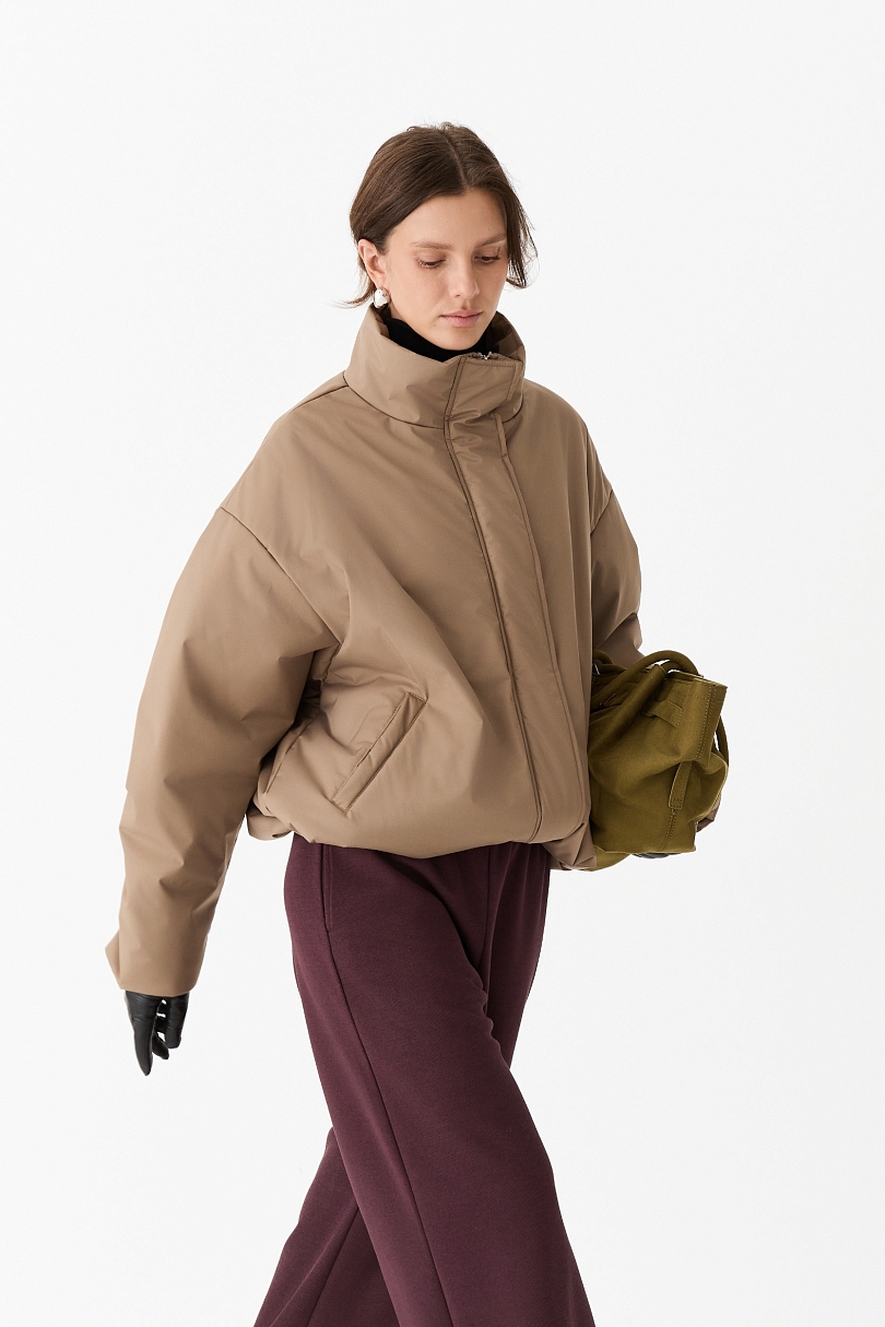 Утеплённый бомбер в светло-коричневом оттенке — стильная и удобная базовая верхняя одежда. Сборки по рукаву придают модели особый шарм.