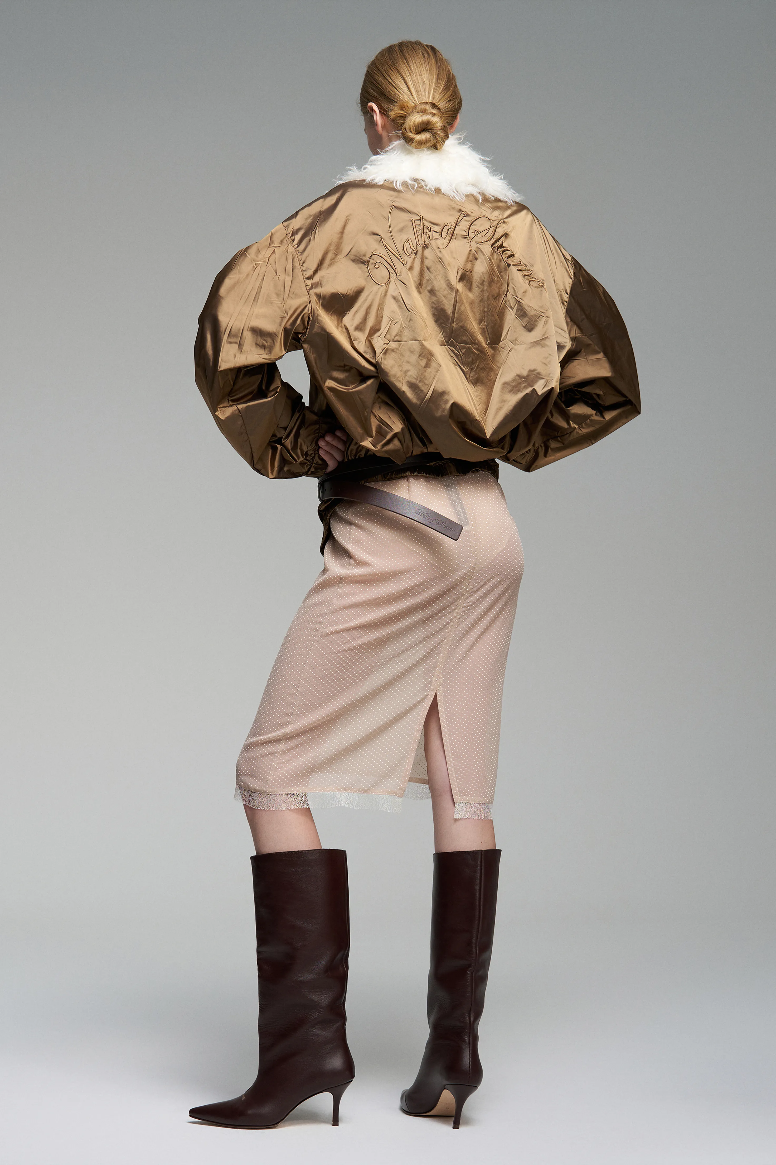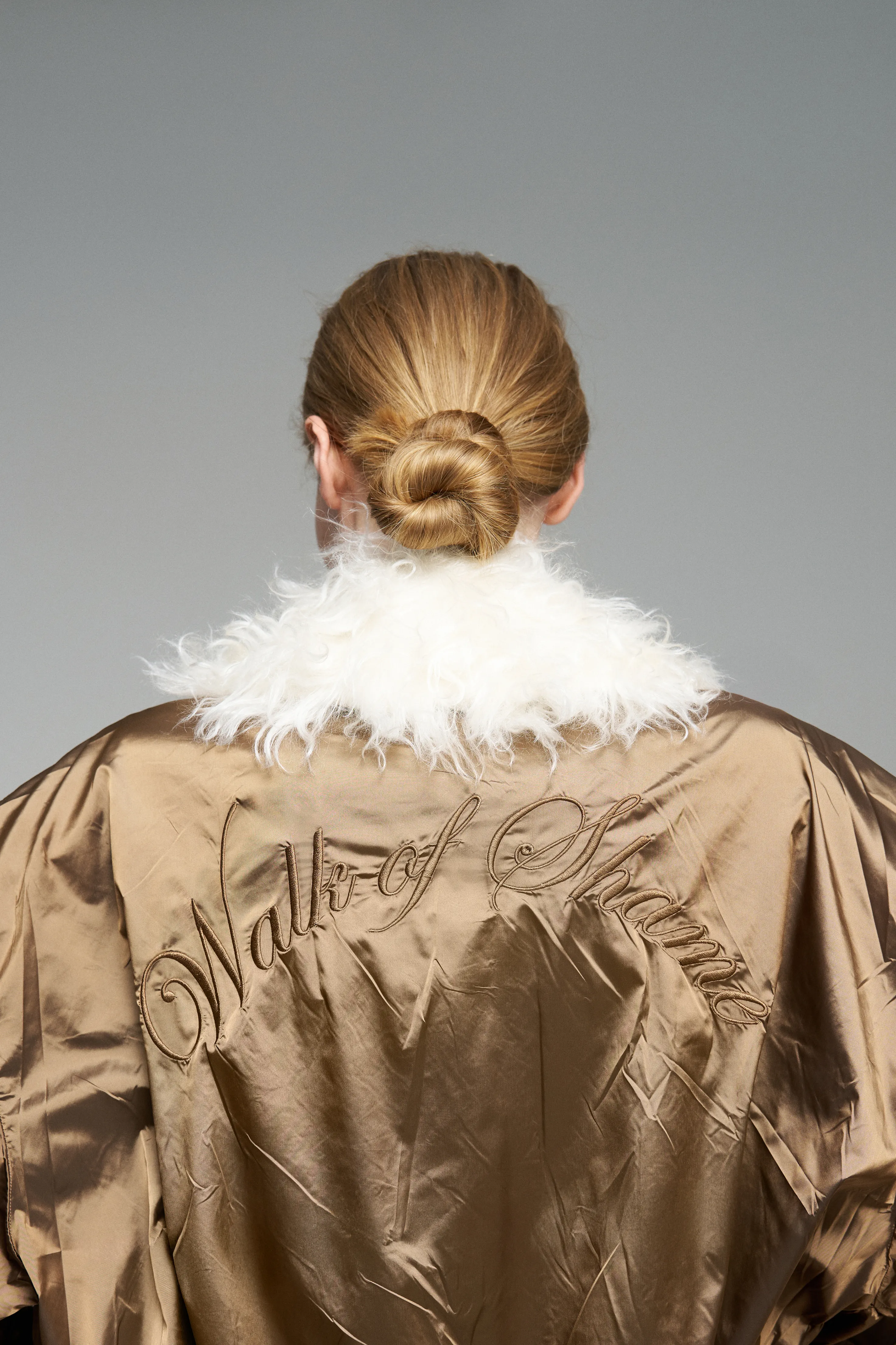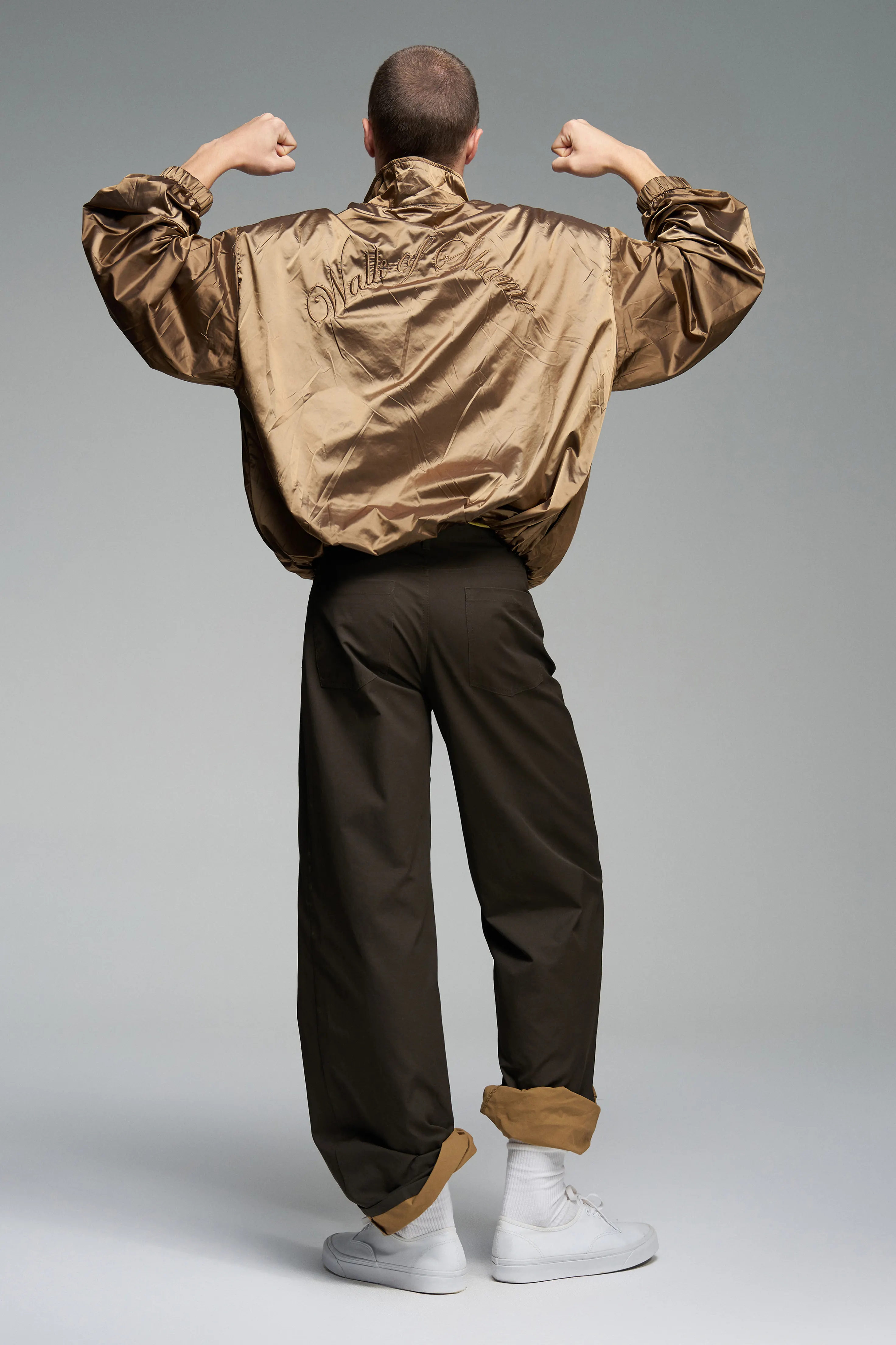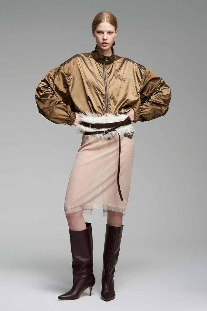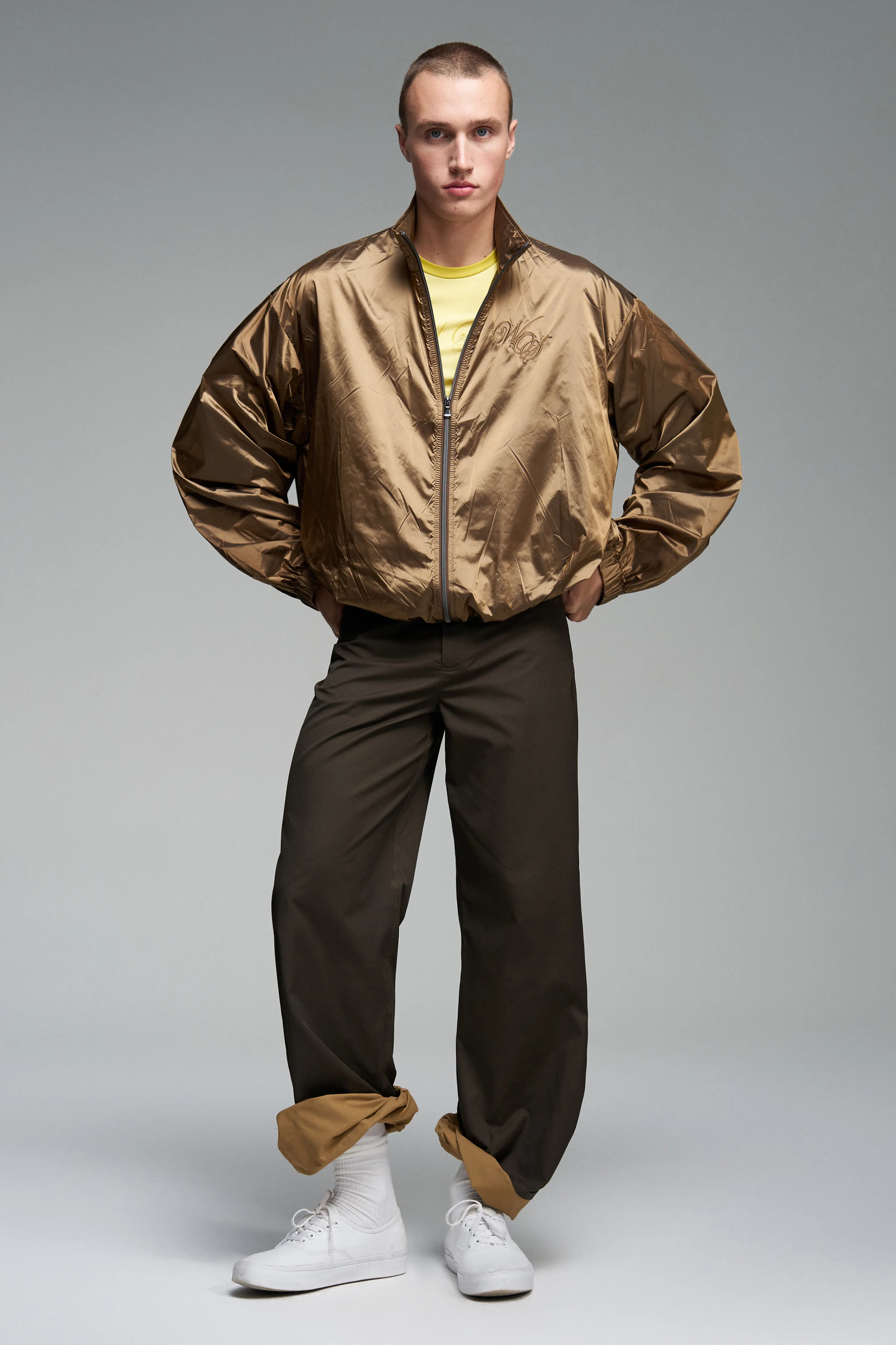 Куртка с контрастной вышивкой бренда спереди и сзади. Уже знакомая форма объёмного кроя, но в новом исполнении. Воротник-стойка на двухзамковой молнии.