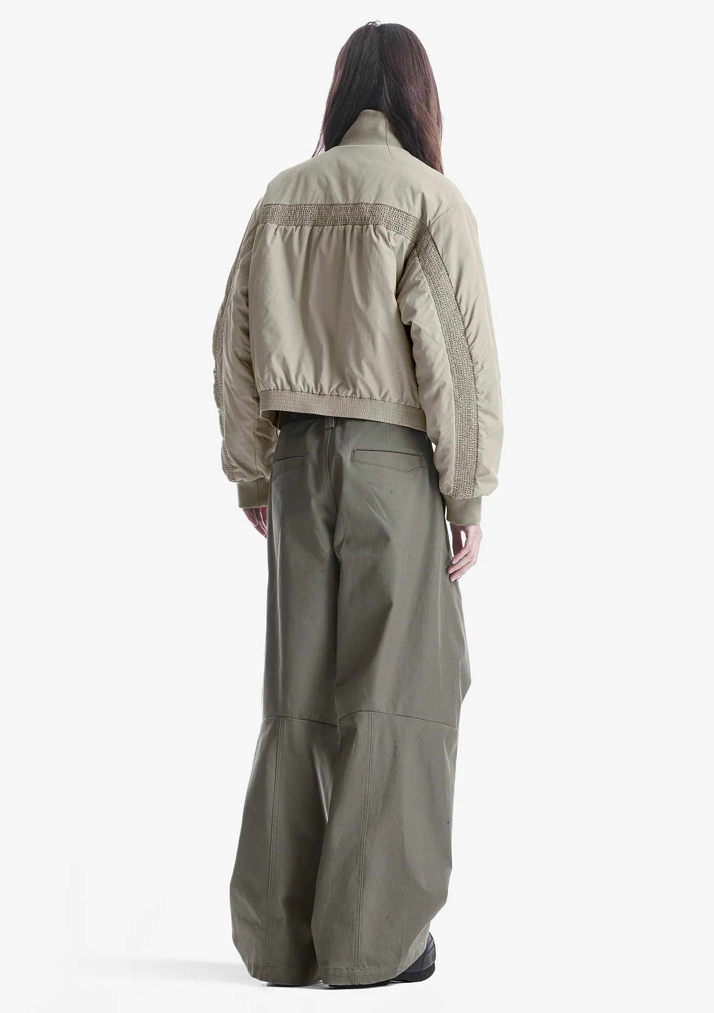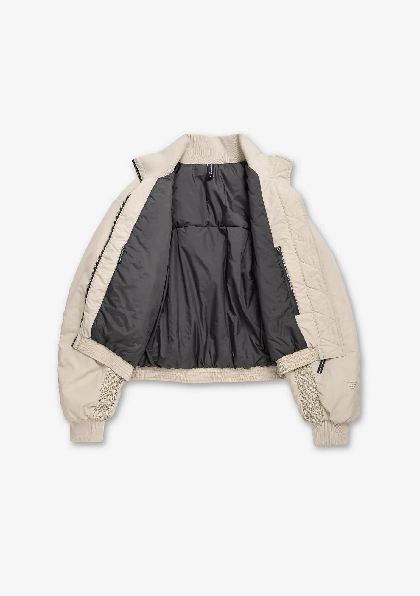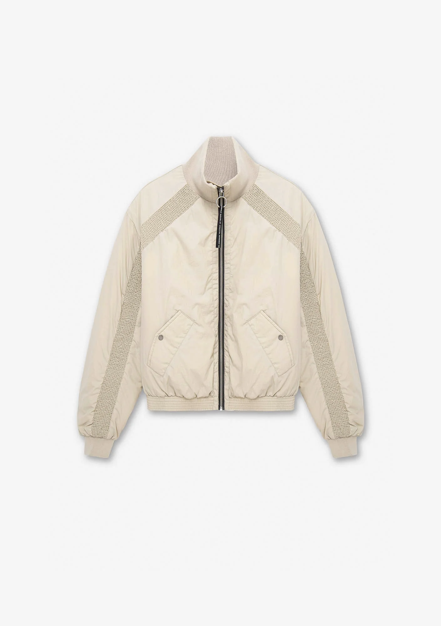 Куртка-бомбер из матового нейлона с гладкой структурой. Утеплитель из переработанного полиэстера сохраняет тепло без утяжеления и держит форму. Эластичные воротник и манжеты, внутренняя ветрозащитная планка и карманы на молниях и кнопках — всё для защиты от ветра, удобства и комфортной посадки.