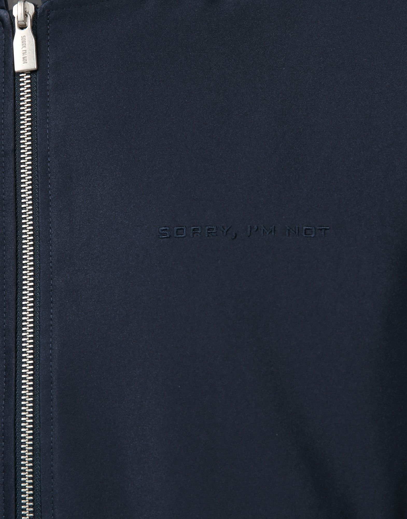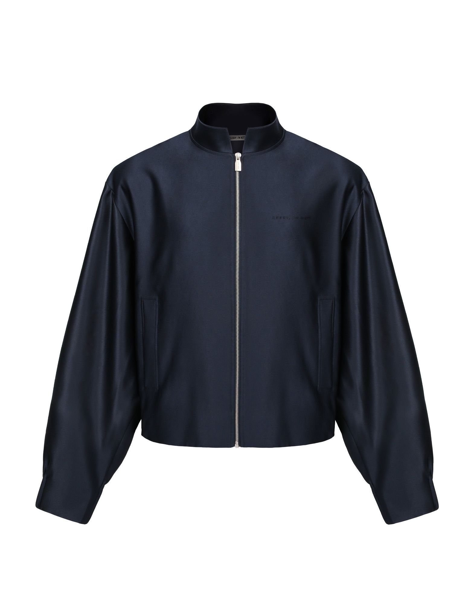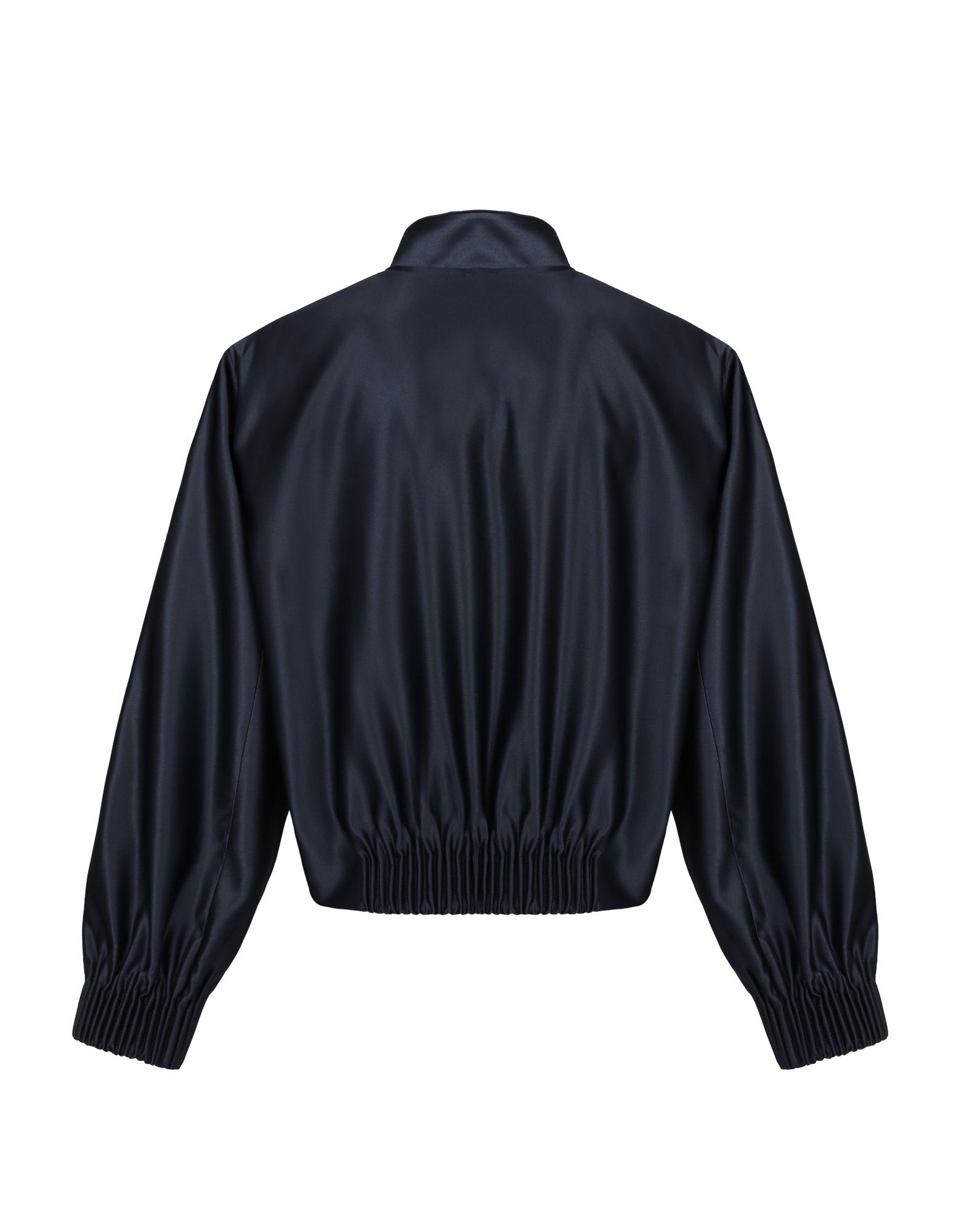 Темно-синий бомбер из гладкого полиэстера с шелковистой фактурой. На лицевой части бомбера расположен логотип бренда.