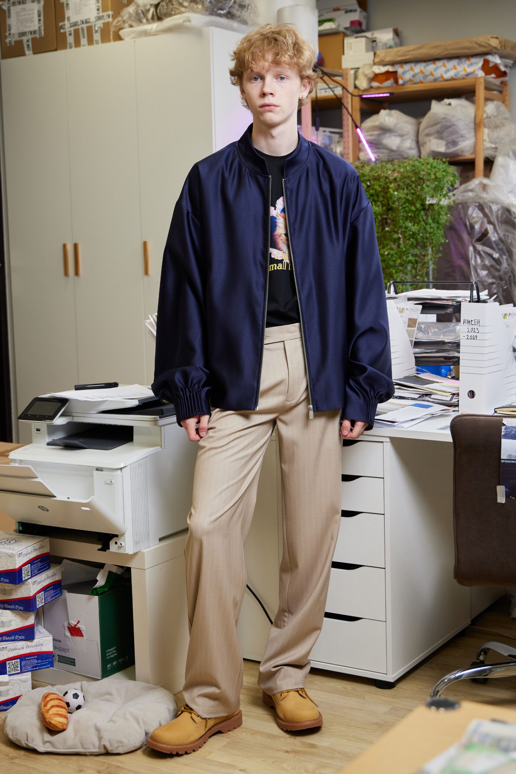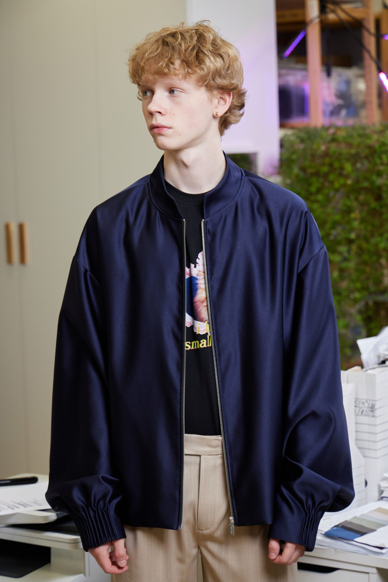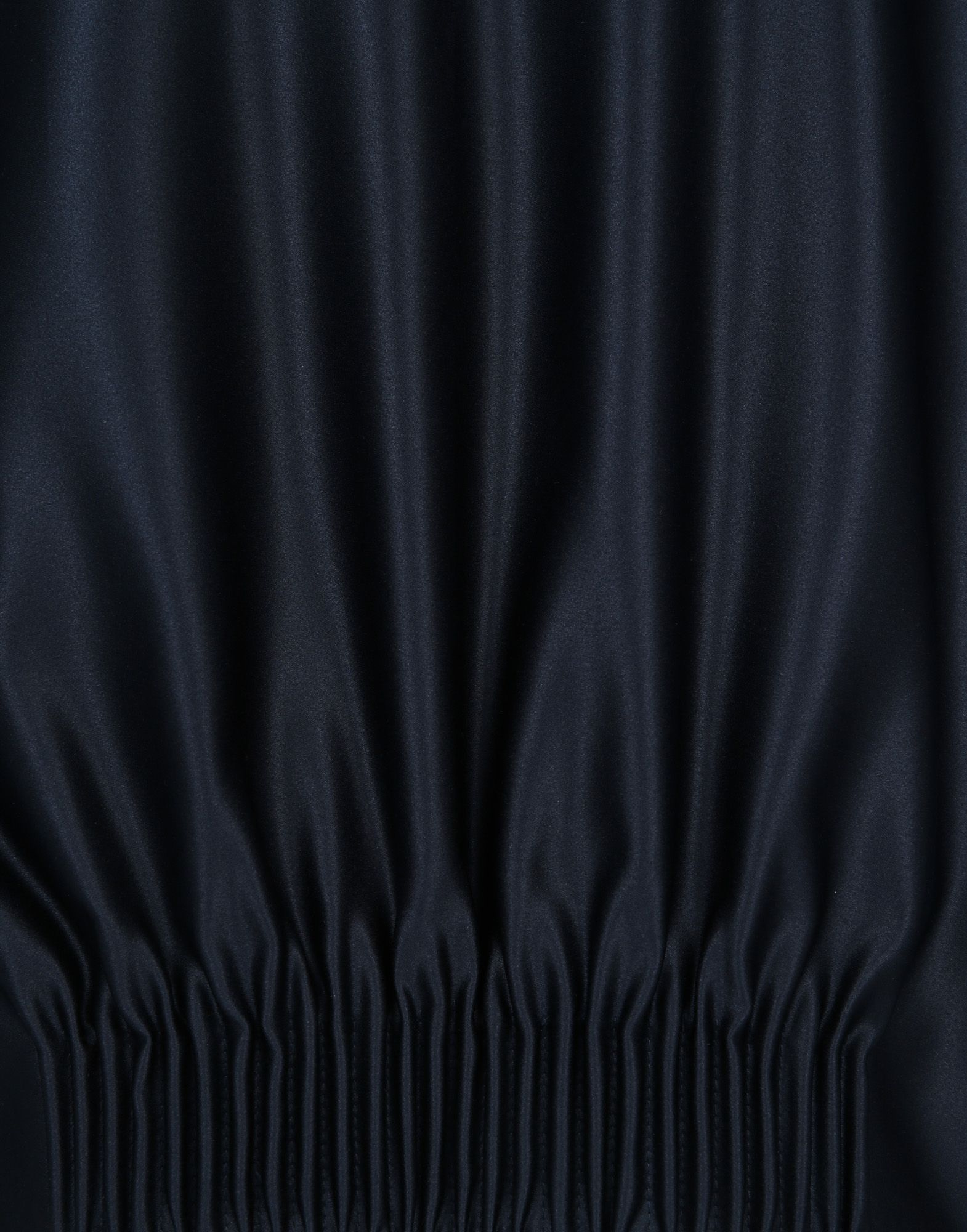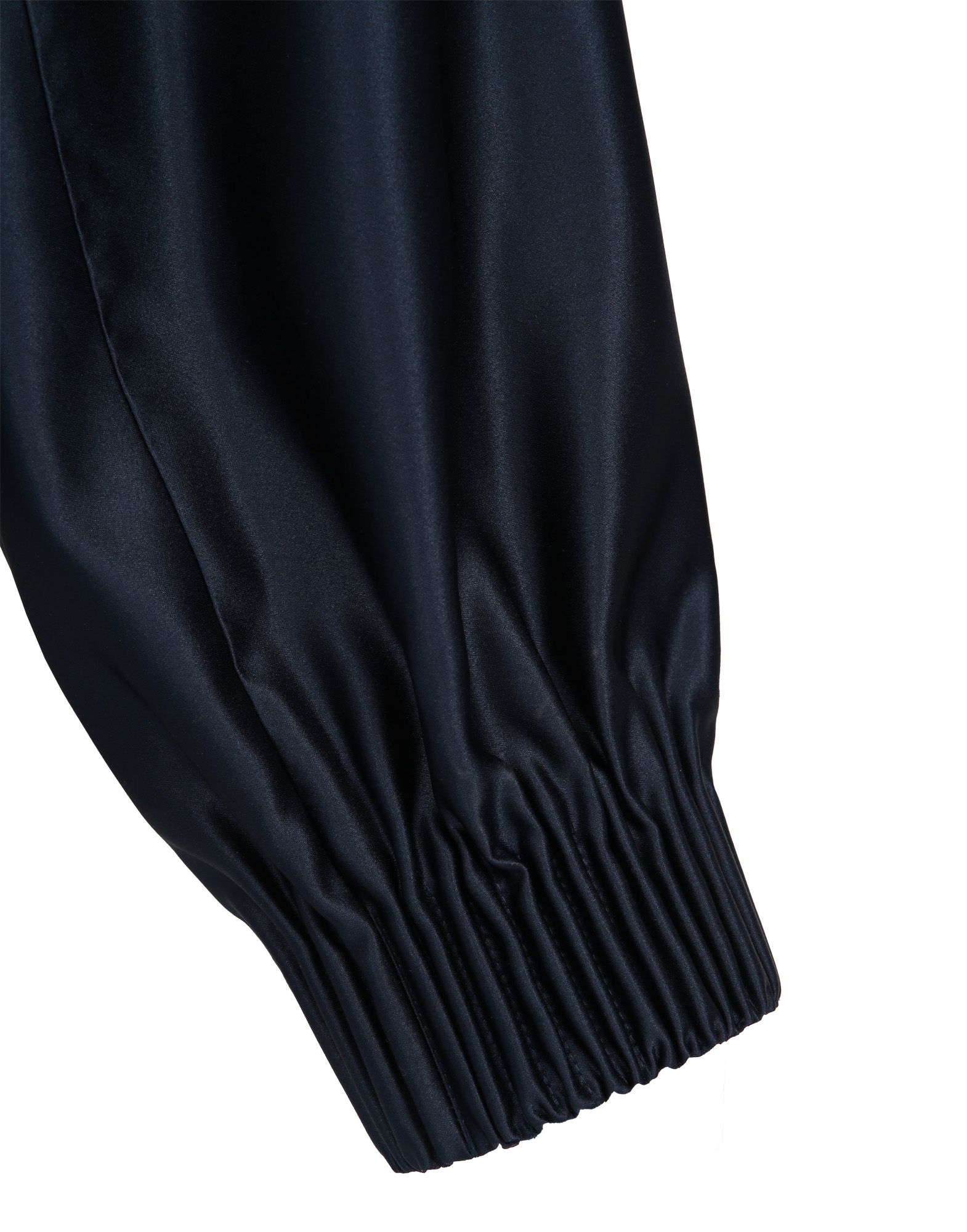 Темно-синий бомбер из гладкого полиэстера с шелковистой фактурой. На лицевой части бомбера расположен логотип бренда.