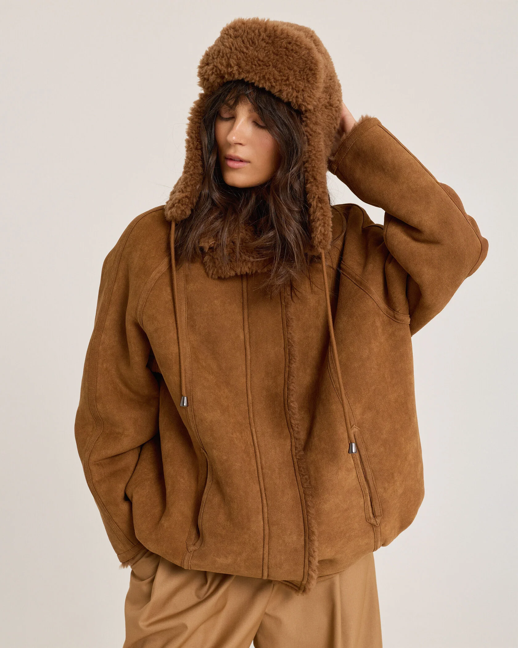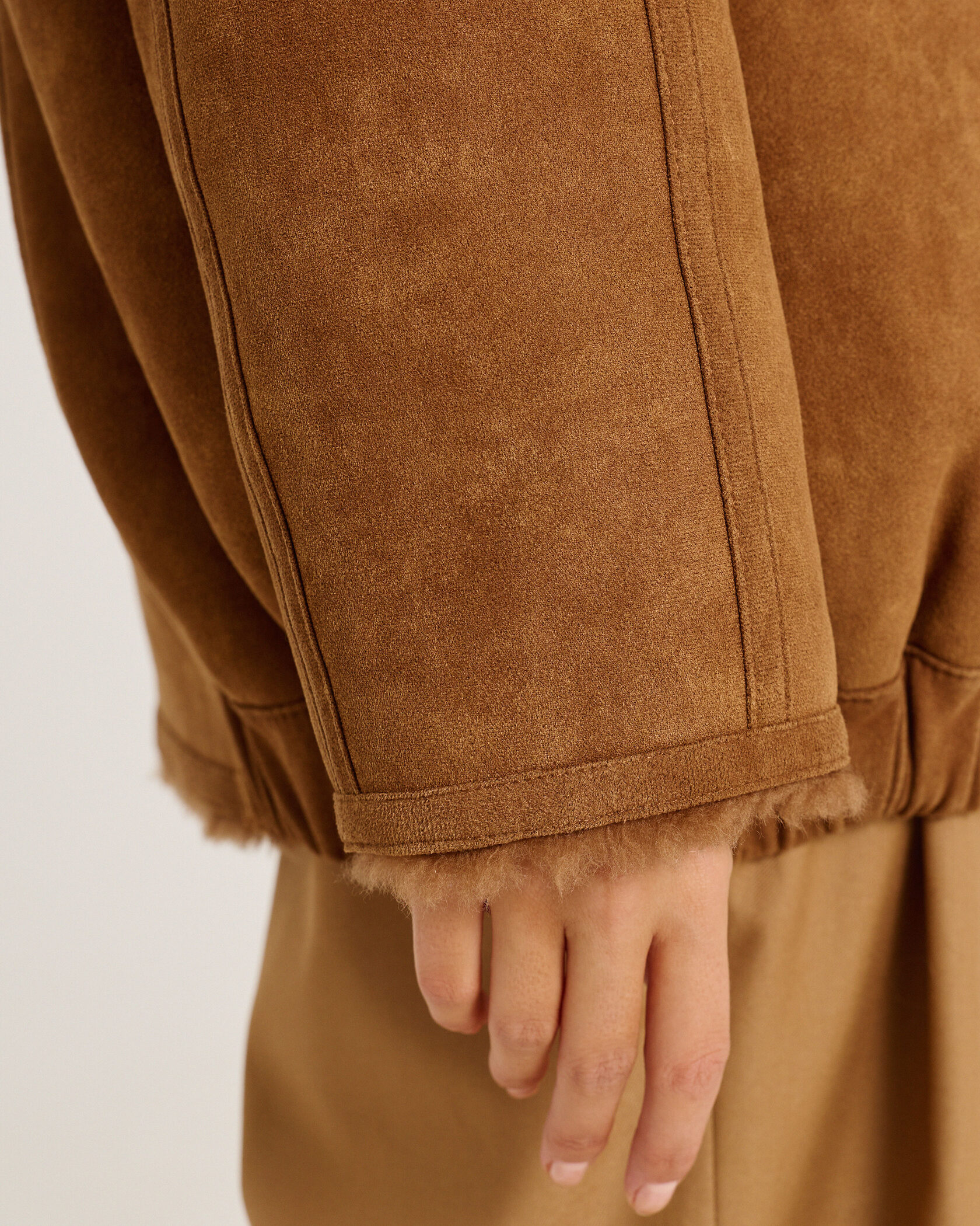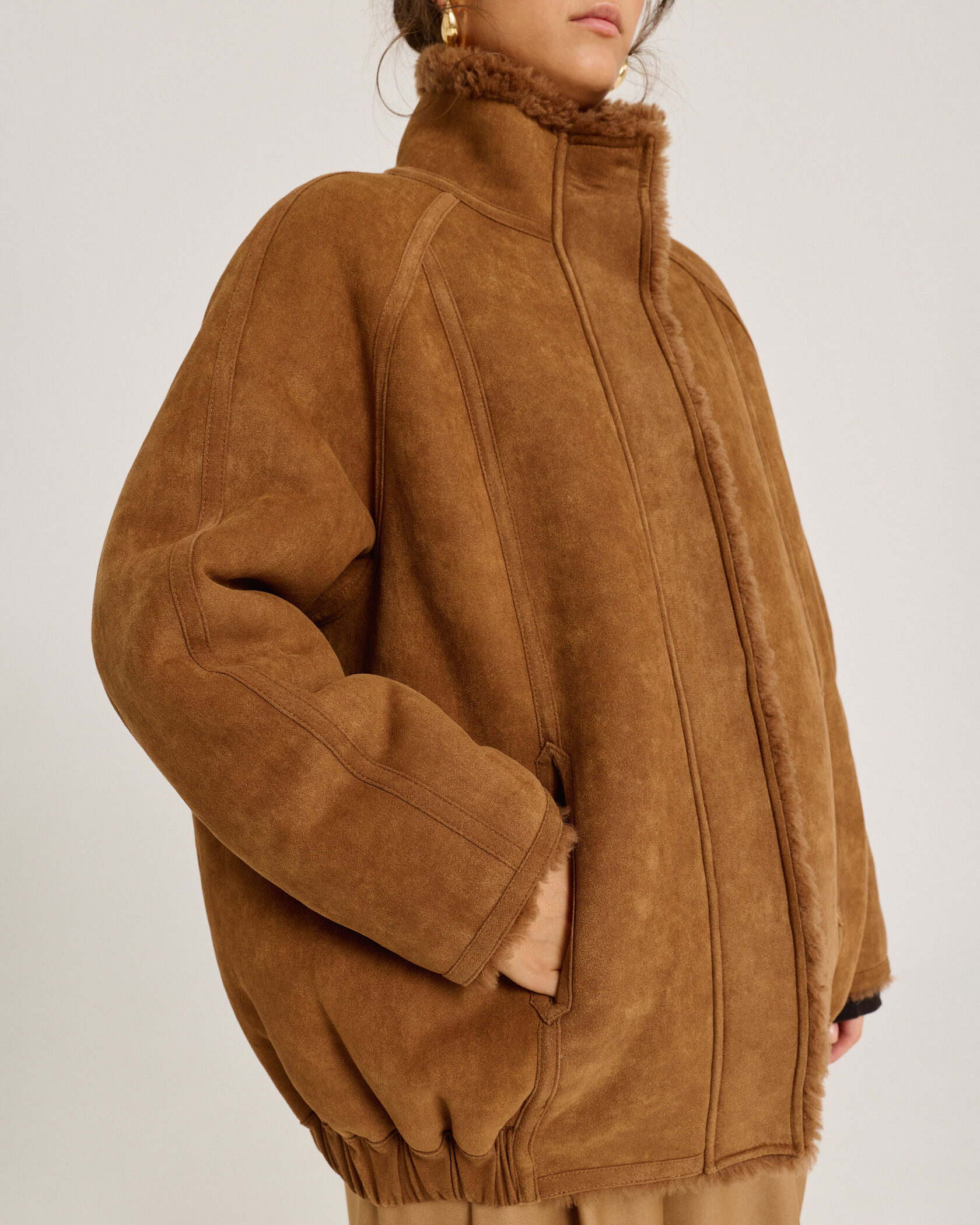 Снаружи замша, внутри мех, поэтому его можно носить и в самый прохладный сезон до -15 градусов, выбирая по настроению сторону, которую хочется выгулять.