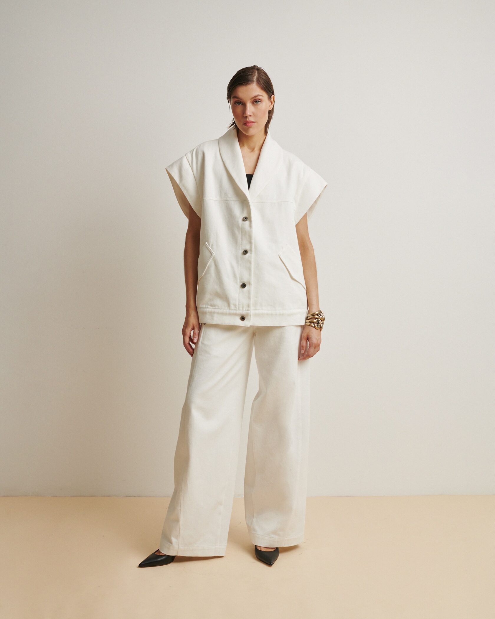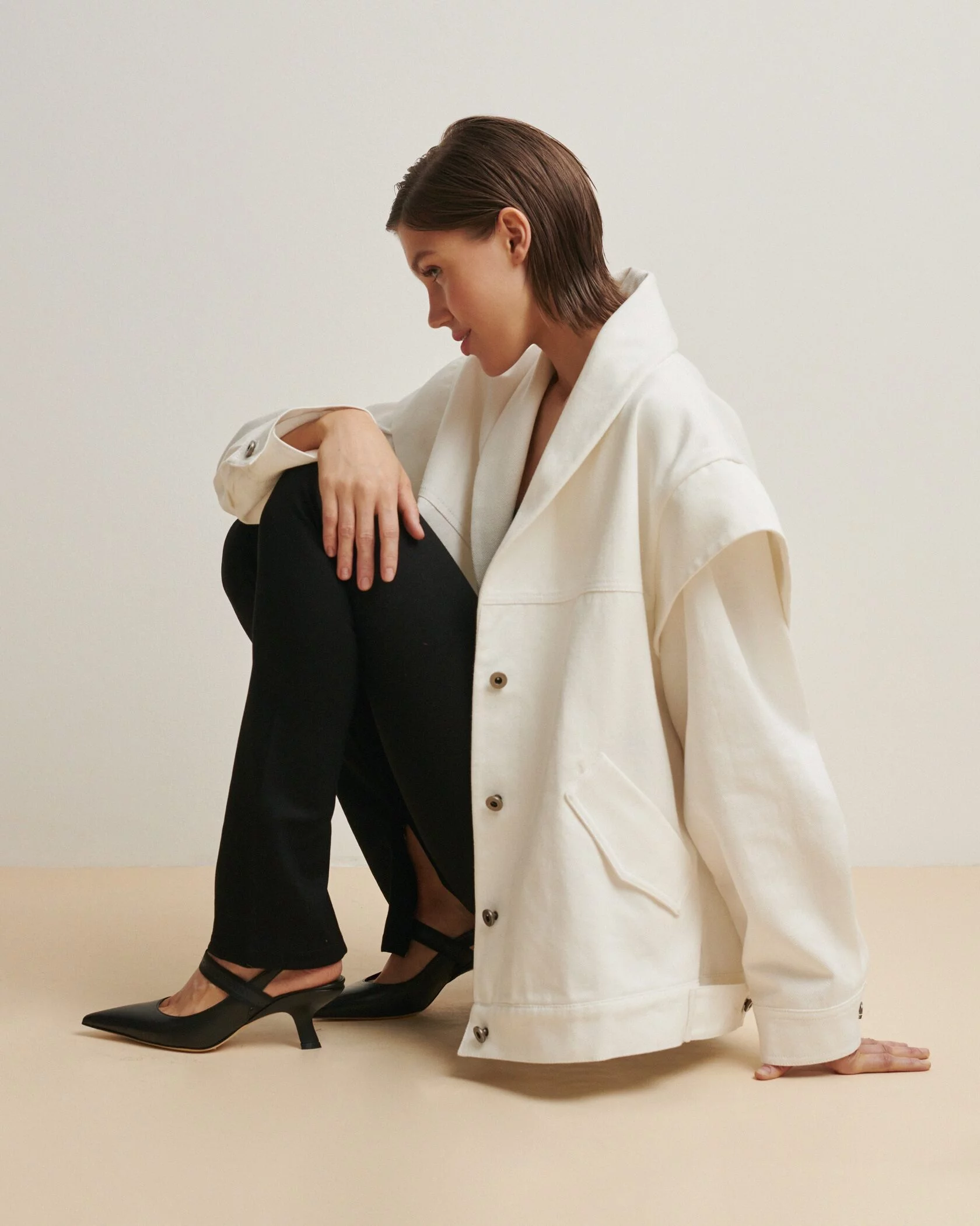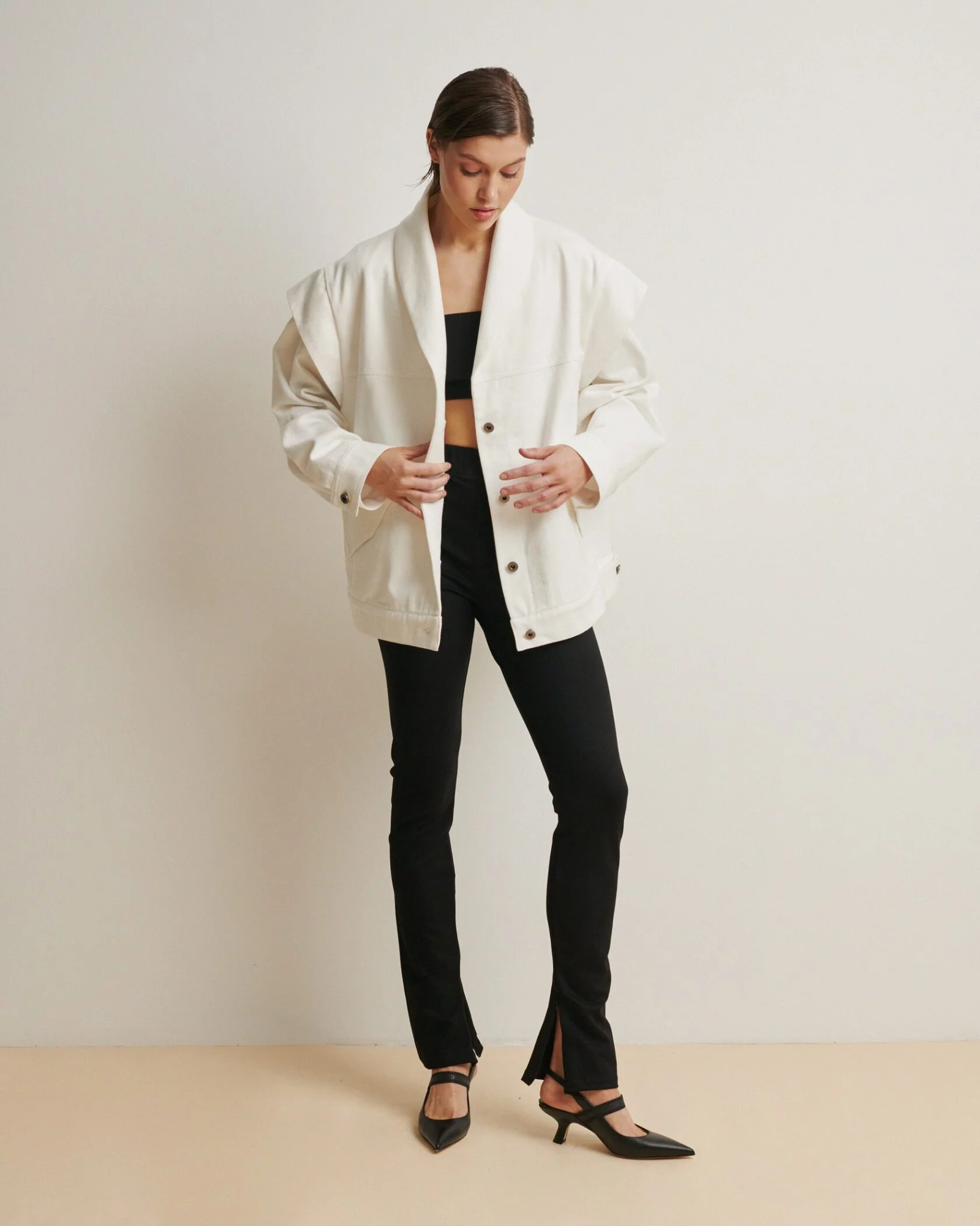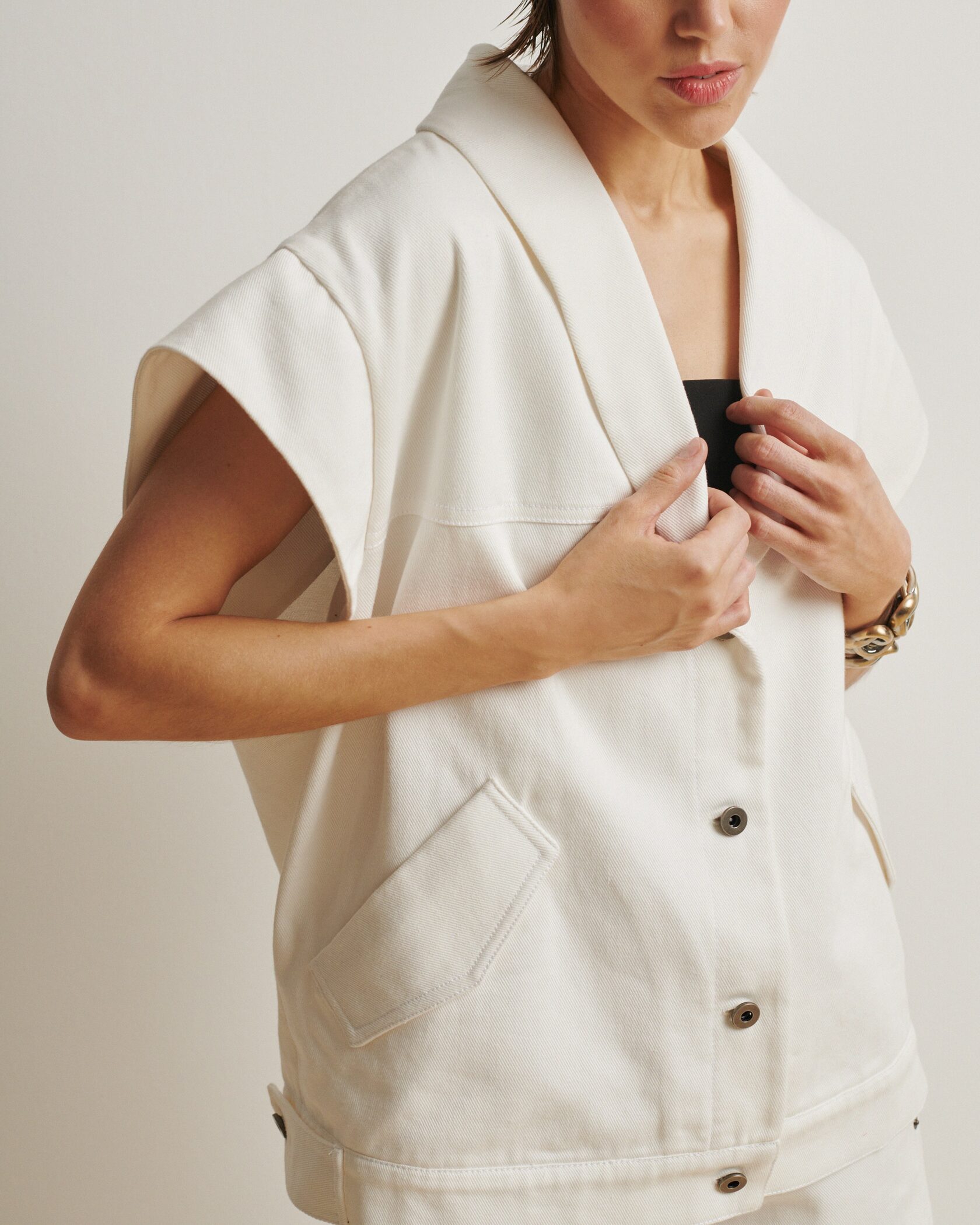 Нам очень импонирует винтажная эстетика 80-х: это бесконечные эксперименты со стилем, поиски свободы, создание нового. Это время открытий, удивлений, смелости. Так мы создали куртку-жилет: объемные плечи, мягкий деним и плавная форма воротника объединили в себе наши фэшн-разработки и исследования, начиная с маминого гардероба и первых выпусков глянца и заканчивая... Впрочем, нет, мы еще не закончили!