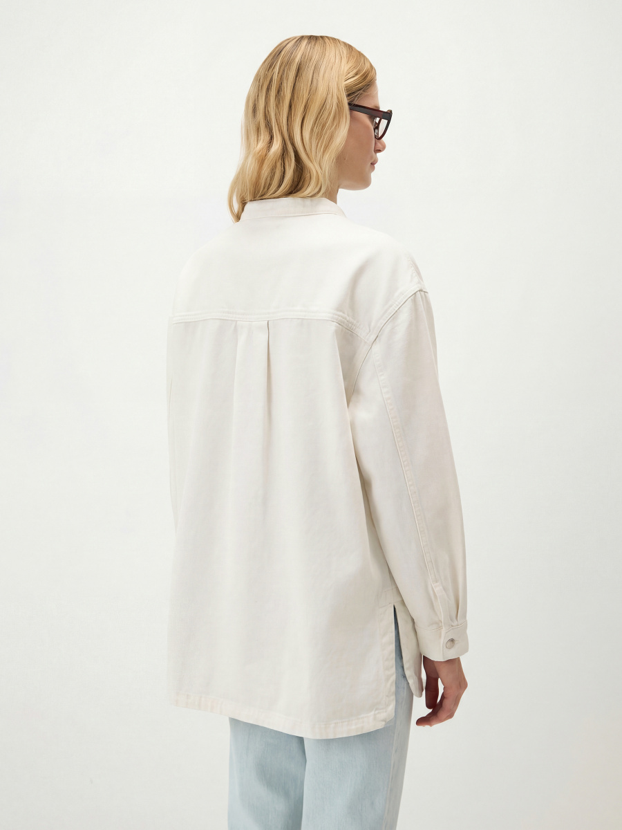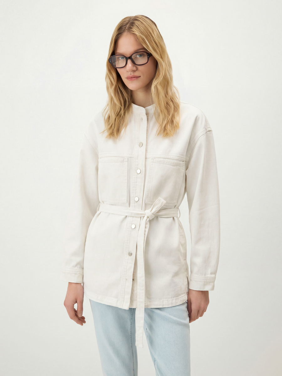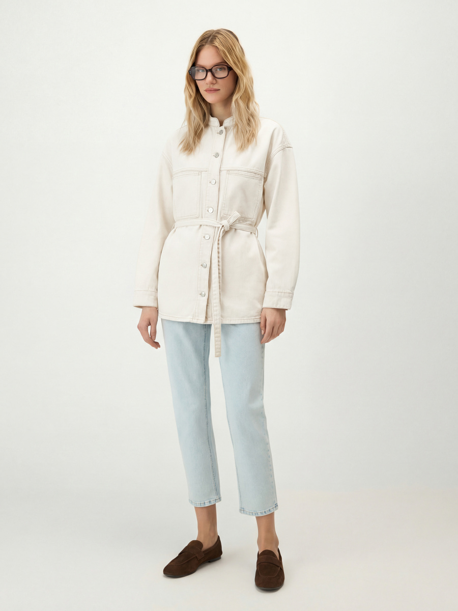 Прямая объемная куртка из вареного денима на основе хлопка. Выполнена в рубашечном стиле с воротником-стойкой, передней и задней кокетками и нагрудными карманами. Спущенная линия плеча и мягкая складка на спинке добавляют объем и позволяют свободно двигаться. Фигурный низ, металлические пуговицы на основной застежке и манжетах. В комплекте узкий пояс на шлевках.