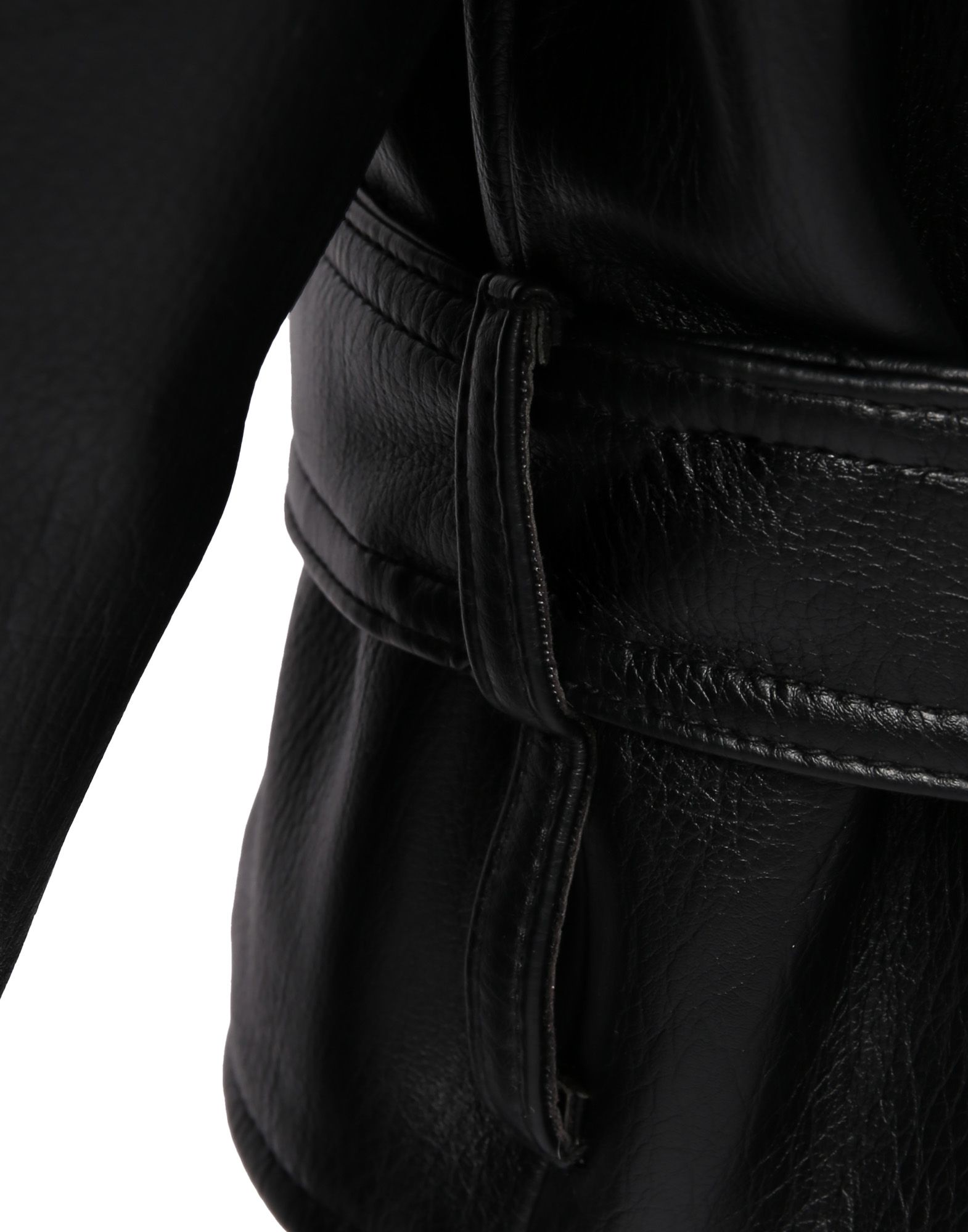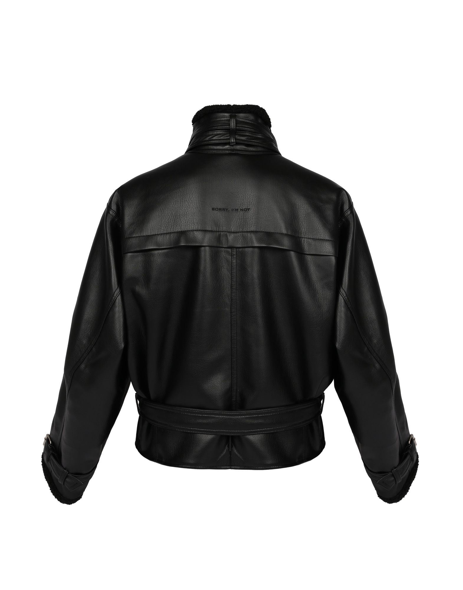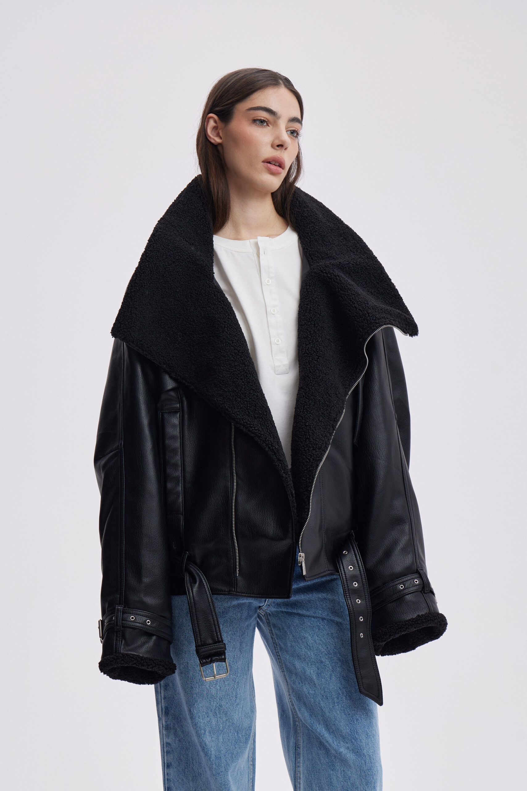 Куртка LEATHER BELTS в чёрном цвете из искусственной кожи с воротником-стойкой из шерпы под барана, дополнена акцентными ремнями на горловине, рукавах и поясе. Пояс можно переставить на шлёвки выше для более винтажной посадки.