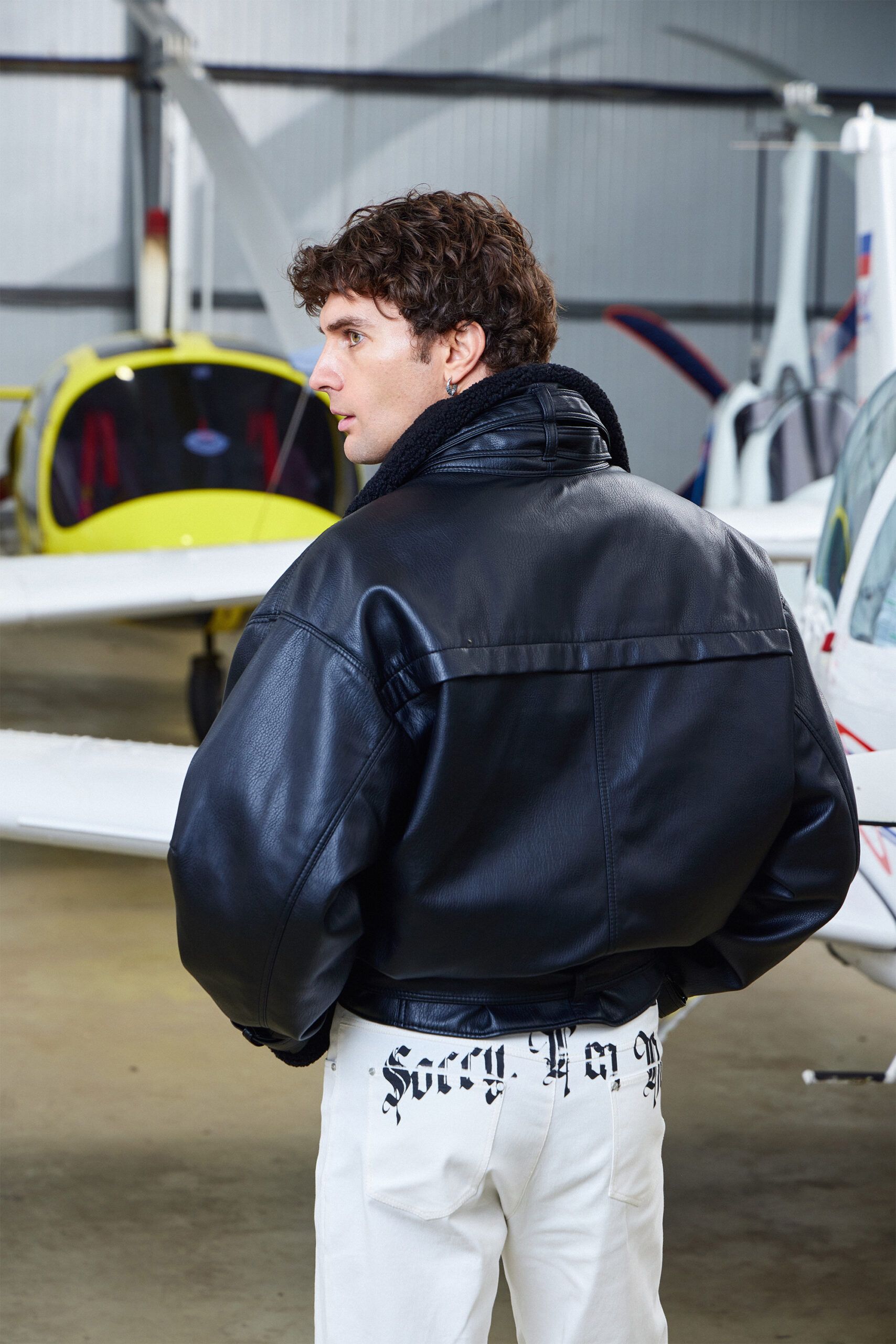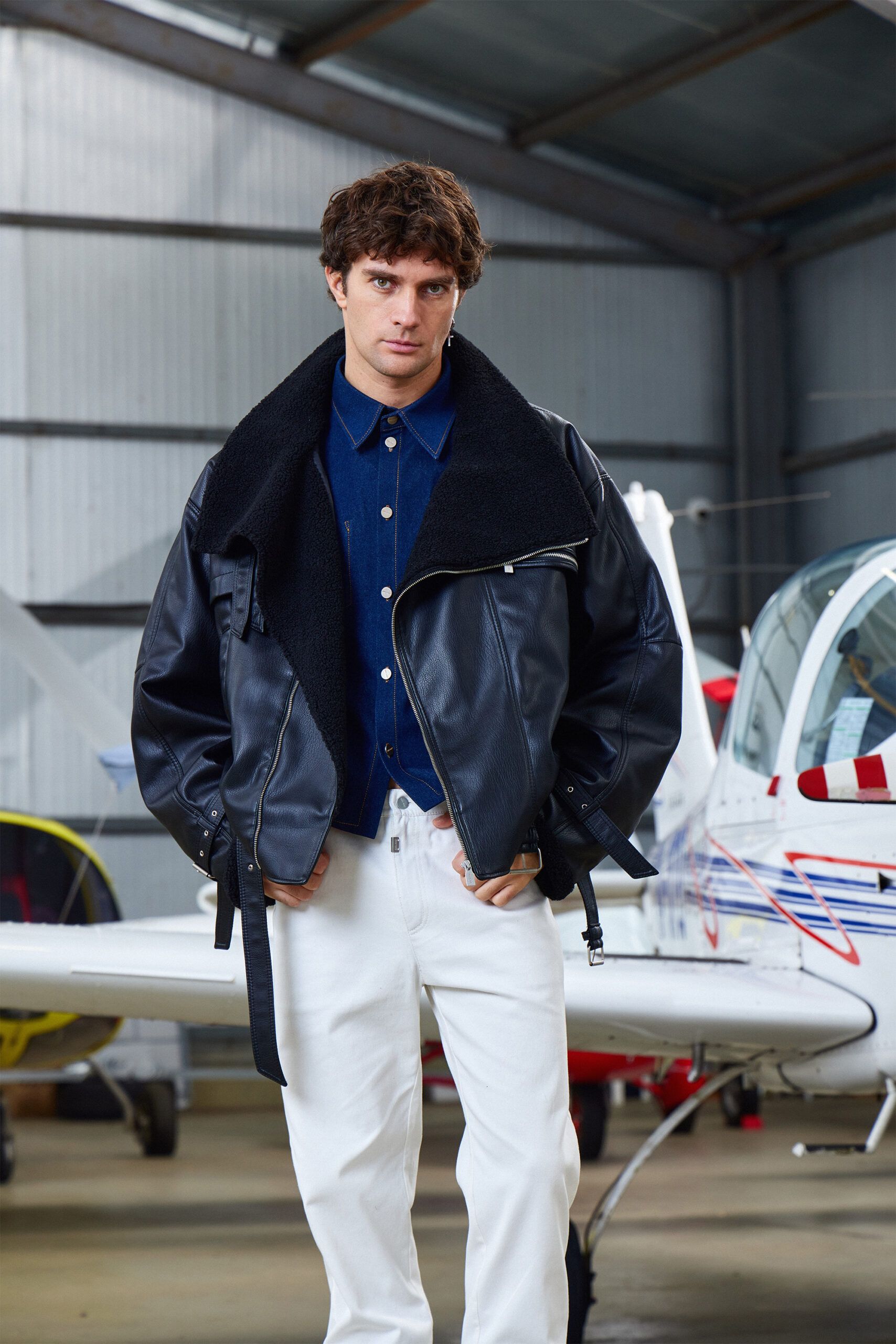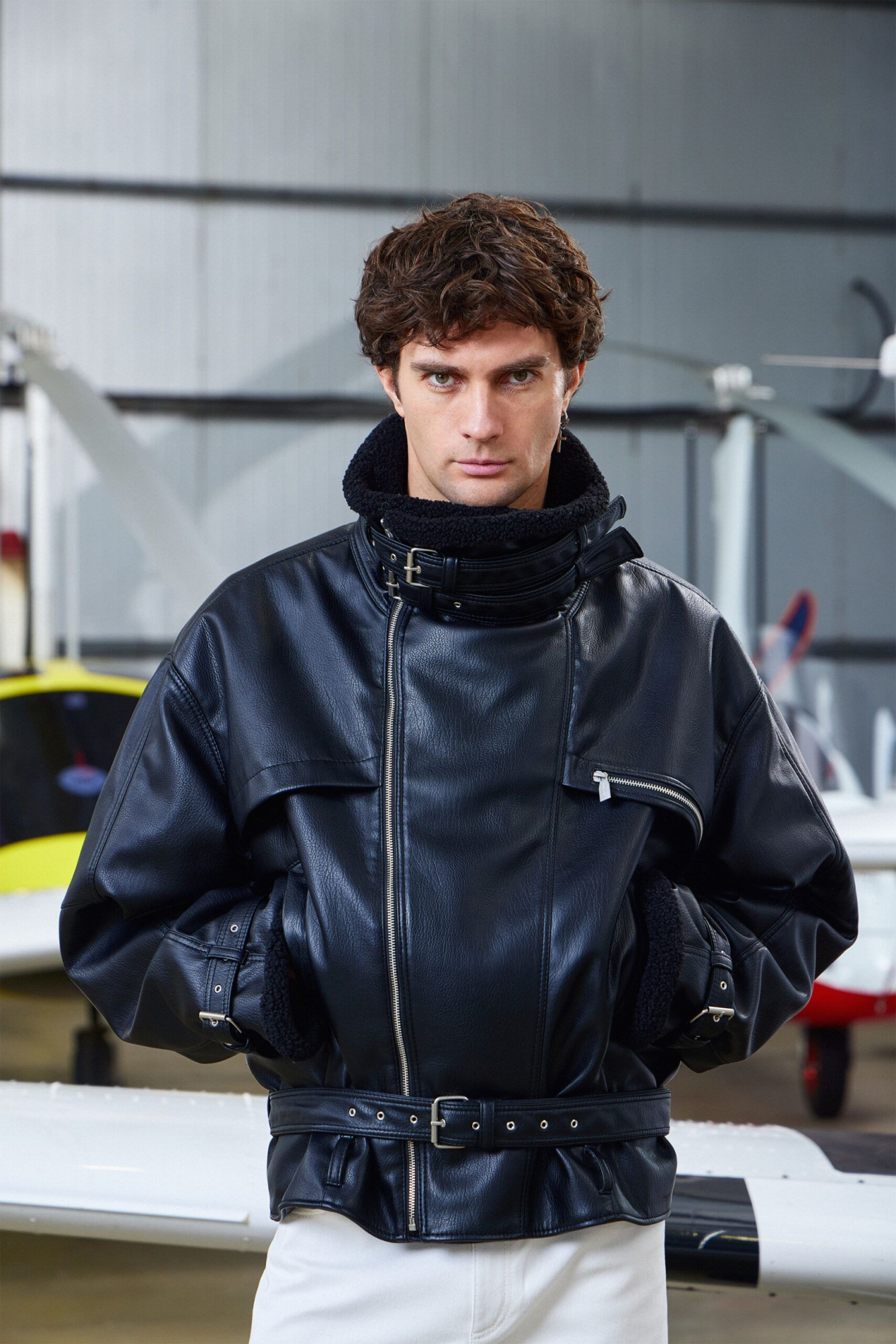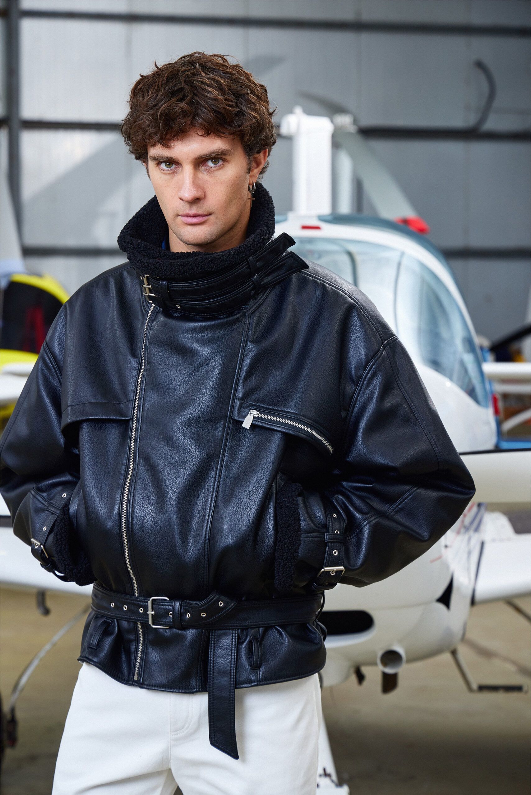 Куртка LEATHER BELTS в чёрном цвете из искусственной кожи с воротником-стойкой из шерпы под барана, дополнена акцентными ремнями на горловине, рукавах и поясе. Пояс можно переставить на шлёвки выше для более винтажной посадки.