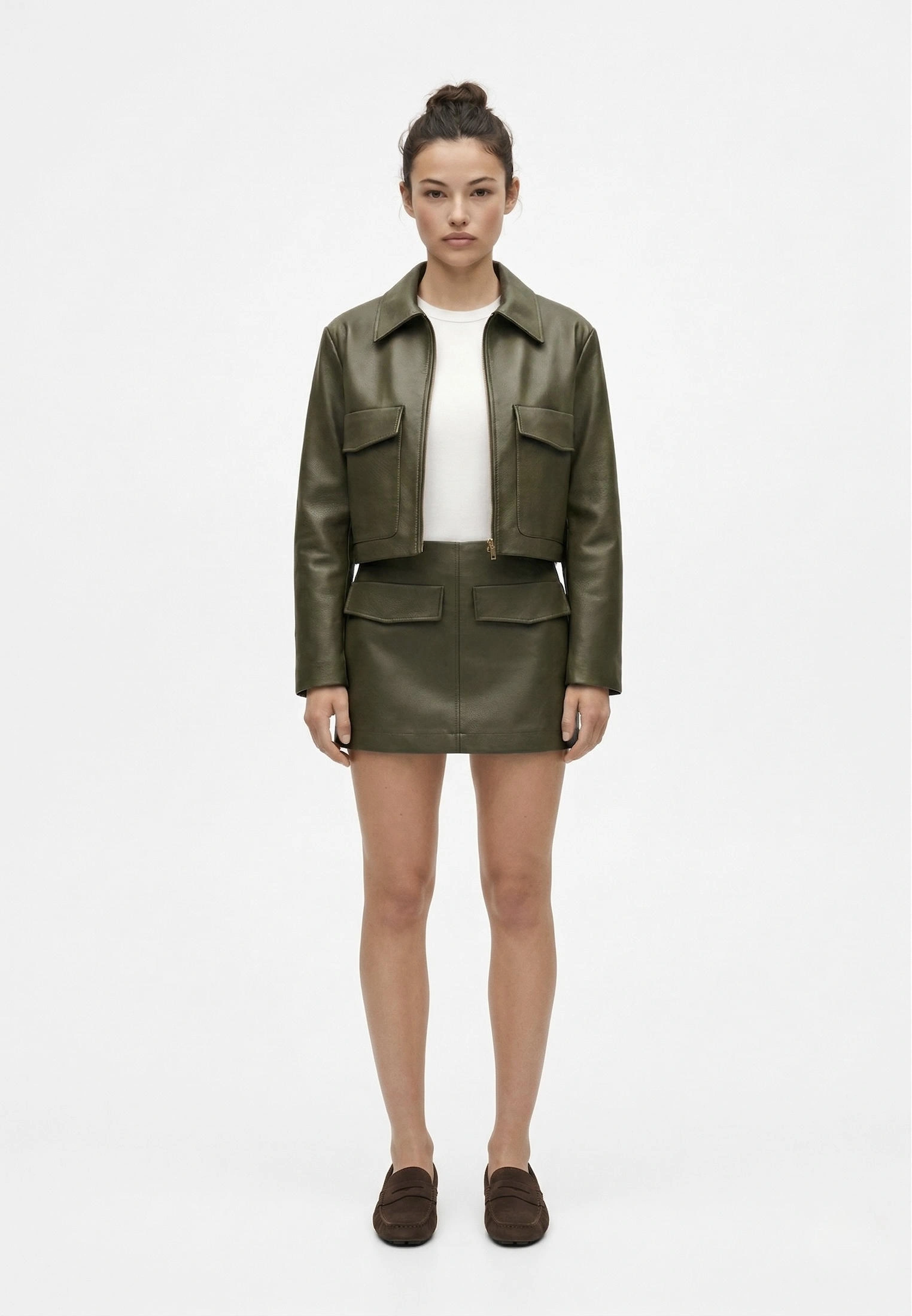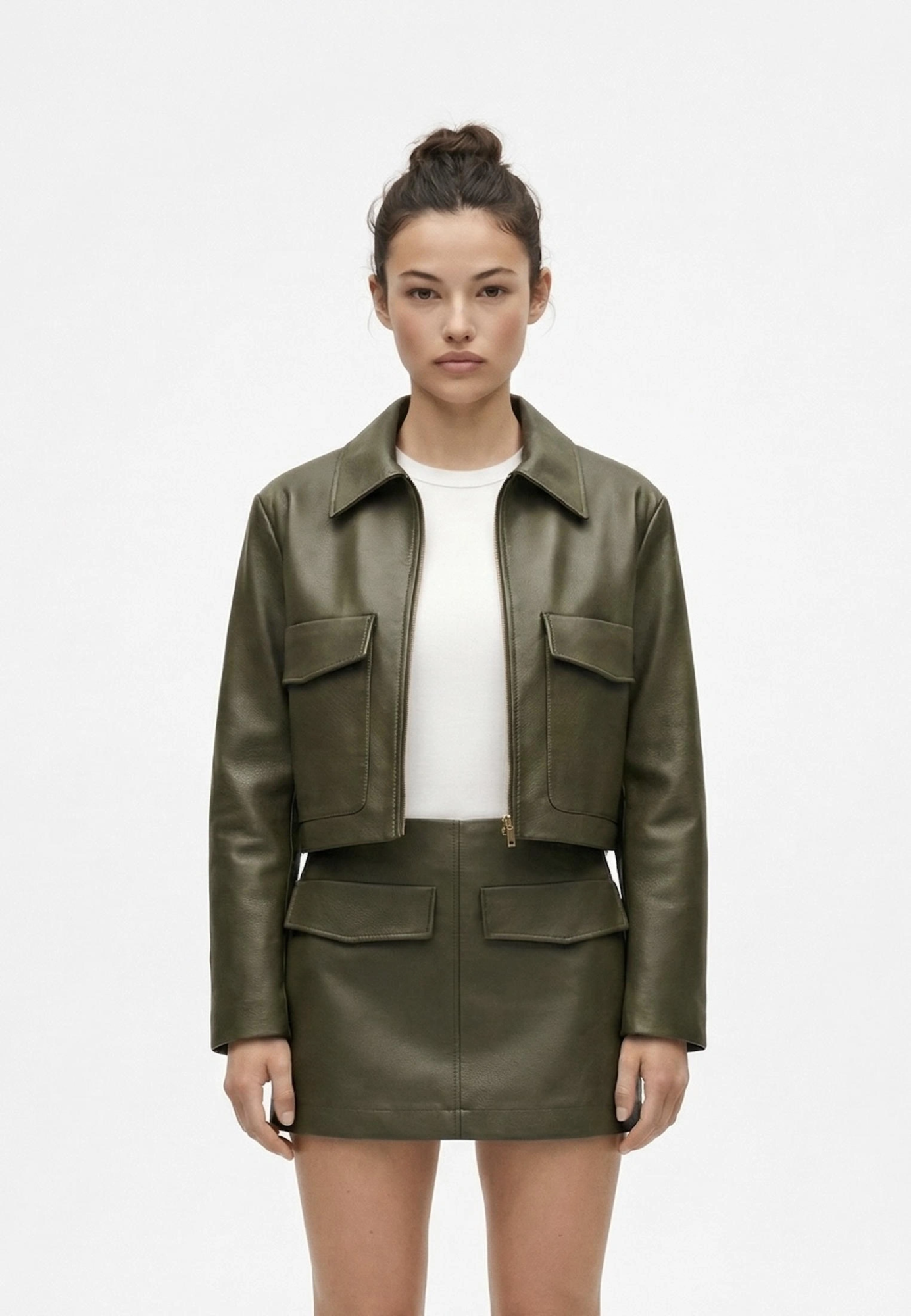 Укороченная куртка из экокожи — стильный и практичный выбор для прохладного времени года. Модель оснащена накладными карманами, что добавляет функциональности и удобства. Идеально подойдёт для создания модных городских образов.